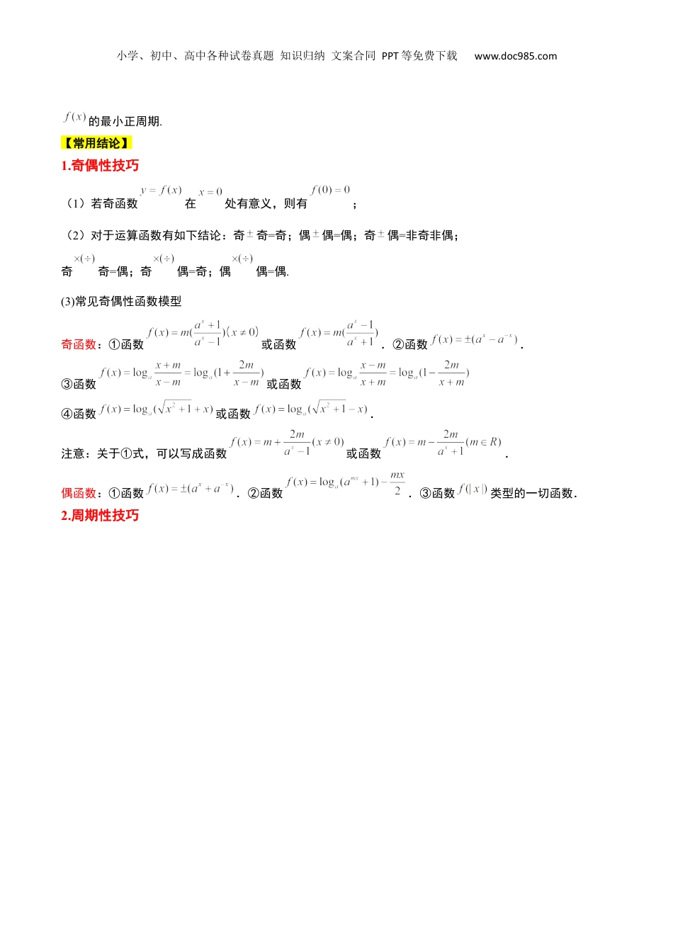 小学、初中、高中各种试卷真题知识归纳文案合同PPT等免费下载www.doc985.com【一轮复习讲义】2024年高考数学高频考点题型归纳与方法总结(新高考通用)第08讲函数的基本性质Ⅱ-奇偶性、周期性和对称性(精讲)题型目录一览①函数的奇偶性②函数奇偶性的应用③函数的周期性④函数的对称性⑤函数性质的综合应用1.函数的奇偶性奇偶性定义图象特点偶函数如果对于函数的定义域内任意一个,都有,那么函数就叫做偶函数关于轴对称奇函数如果对于函数的定义域内任意一个,都有,那么函数就叫做奇函数关于原点对称注意:由函数奇偶性的定义可知,函数具有奇偶性的一个前提条件是:对于定义域内的任意一个,也在定义域内(即定义域关于原点对称).2.函数的对称性(1)若函数为偶函数,则函数关于对称.(2)若函数为奇函数,则函数关于点对称.(3)若,则函数关于对称.(4)若,则函数关于点对称.3.函数的周期性(1)周期函数:对于函数,如果存在一个非零常数,使得当取定义域内的任何值时,都有,那么就称函数为周期函数,称为这个函数的周期.(2)最小正周期:如果在周期函数的所有周期中存在一个最小的正数,那么称这个最小整数叫做一、知识点梳理小学、初中、高中各种试卷真题知识归纳文案合同PPT等免费下载www.doc985.com的最小正周期.【常用结论】1.奇偶性技巧(1)若奇函数在处有意义,则有;(2)对于运算函数有如下结论:奇奇=奇;偶偶=偶;奇偶=非奇非偶;奇奇=偶;奇偶=奇;偶偶=偶.(3)常见奇偶性函数模型奇函数:①函数或函数.②函数.③函数或函数④函数或函数.注意:关于①式,可以写成函数或函数.偶函数:①函数.②函数.③函数类型的一切函数.2.周期性技巧小学、初中、高中各种试卷真题知识归纳文案合同PPT等免费下载www.doc985.com3.函数的的对称性与周期性的关系(1)若函数有两条对称轴,,则函数是周期函数,且;(2)若函数的图象有两个对称中心,则函数是周期函数,且;(3)若函数有一条对称轴和一个对称中心,则函数是周期函数,且.4.对称性技巧(1)若函数关于直线对称,则.小学、初中、高中各种试卷真题知识归纳文案合同PPT等免费下载www.doc985.com(2)若函数关于点对称,则.(3)函数与关于轴对称,函数与关于原点对称.一、单选题1.(2021·全国·高考真题)下列函数中是增函数的为()A.B.C.D.【答案】D【分析】根据基本初等函数的性质逐项判断后可得正确的选项.【详解】对于A,为上的减函数,不合题意,舍.对于B,为上的减函数,不合题意,舍.对于C,在为减函数,不合题意,舍.对于D,为上的增函数,符合题意,故选:D.2.(2021·全国·统考高考真题)设函数,则下列函数中为奇函数的是()A.B.C.D.【答案】B【分析】分别求出选项的函数解析式,再利用奇函数的定义即可.【详解】由题意可得,二、题型分类精讲真题刷刷刷小学、初中、高中各种试卷真题知识归纳文案合同PPT等免费下载www.doc985.com对于A,不是奇函数;对于B,是奇函数;对于C,,定义域不关于原点对称,不是奇函数;对于D,,定义域不关于原点对称,不是奇函数.故选:B【点睛】本题主要考查奇函数定义,考查学生对概念的理解,是一道容易题.3.(2021·全国·高考真题)设是定义域为R的奇函数,且.若,则()A.B.C.D.【答案】C【分析】由题意利用函数的奇偶性和函数的递推关系即可求得的值.【详解】由题意可得:,而,故.故选:C.【点睛】关键点点睛:本题主要考查了函数的奇偶性和函数的递推关系式,灵活利用所给的条件进行转化是解决本题的关键.小学、初中、高中各种试卷真题知识归纳文案合同PPT等免费下载www.doc985.com4.(2021·浙江·统考高考真题)已知函数,则图象为如图的函数可能是()A.B.C.D.【答案】D【分析】由函数的奇偶性可排除A、B,结合导数判断函数的单调性可判断C,即可得解.【详解】对于A,,该函数为非奇非偶函数,与函数图象不符,排除A;对于B,,该函数为非奇非偶函数,与函数图象不符,排除B;对于C,,则,当时,,与图象不符,排除C.故选:D.5.(2022·全国·统考高考真题)如图是下列四个函数中的某个函数在区间的大致图像,则该函数是(...