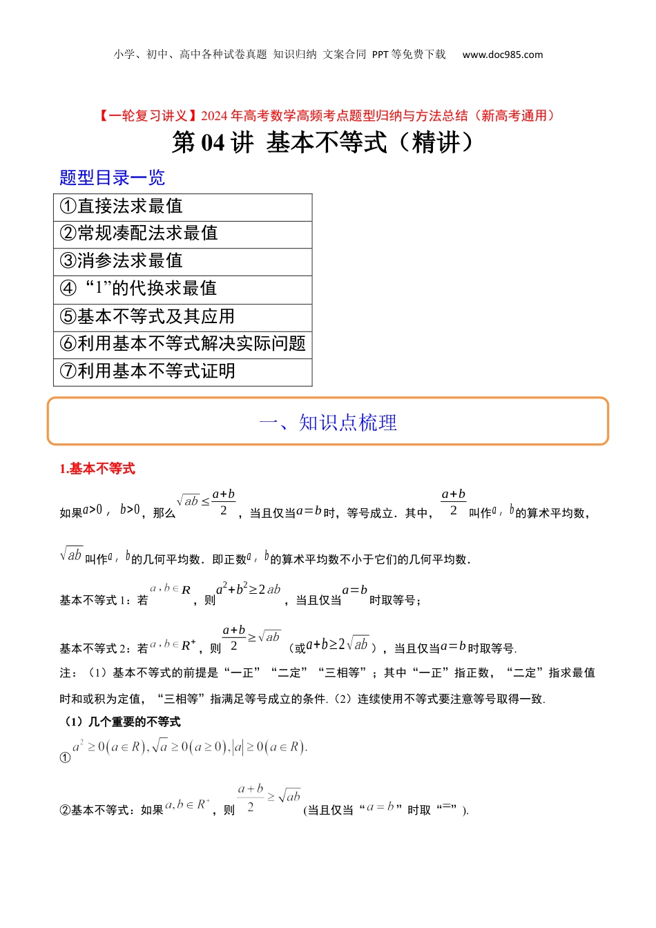 小学、初中、高中各种试卷真题知识归纳文案合同PPT等免费下载www.doc985.com【一轮复习讲义】2024年高考数学高频考点题型归纳与方法总结(新高考通用)第04讲基本不等式(精讲)题型目录一览①直接法求最值②常规凑配法求最值③消参法求最值④“1”的代换求最值⑤基本不等式及其应用⑥利用基本不等式解决实际问题⑦利用基本不等式证明1.基本不等式如果a>0,b>0,那么√ab≤a+b2,当且仅当a=b时,等号成立.其中,a+b2叫作a,b的算术平均数,√ab叫作a,b的几何平均数.即正数a,b的算术平均数不小于它们的几何平均数.基本不等式1:若R,则a2+b2≥2ab,当且仅当a=b时取等号;基本不等式2:若R+,则a+b2≥√ab(或a+b≥2√ab),当且仅当a=b时取等号.注:(1)基本不等式的前提是“一正”“二定”“三相等”;其中“一正”指正数,“二定”指求最值时和或积为定值,“三相等”指满足等号成立的条件.(2)连续使用不等式要注意等号取得一致.(1)几个重要的不等式①②基本不等式:如果,则(当且仅当“”时取“”).一、知识点梳理小学、初中、高中各种试卷真题知识归纳文案合同PPT等免费下载www.doc985.com特例:(同号).(2)其他变形:①(沟通两和与两平方和的不等关系式)②(沟通两积与两平方和的不等关系式)③(沟通两积与两和的不等关系式)④重要不等式串:即调和平均值几何平均值算数平均值平方平均值(注意等号成立的条件).2.均值定理已知.(1)如果(定值),则(当且仅当“”时取“=”).即“和为定值,积有最大值”.(2)如果(定值),则(当且仅当“”时取“=”).即积为定值,和有最小值”.3.常见求最值模型模型一:mx+nx≥2√mn(m>0,n>0),当且仅当x=√nm时等号成立;模型二:mx+nx−a=m(x−a)+nx−a+ma≥2√mn+ma(m>0,n>0),当且仅当x−a=√nm时等号成立;模型三:xax2+bx+c=1ax+b+cx≤12√ac+b(a>0,c>0),当且仅当x=√ca时等号成立;模型四:x(n−mx)=mx(n−mx)m≤1m⋅(mx+n−mx2)2=n24m(m>0,n>0,0<x<nm),当且仅当x=n2m时等号成立.小学、初中、高中各种试卷真题知识归纳文案合同PPT等免费下载www.doc985.com题型一直接法求最值策略方法直接利用基本不等式求解,注意取等件条【典例1】下列不等式一定成立的是()A.B.C.D.【答案】D【分析】根据各项所给条件,结合均值不等式分析、判断作答.【详解】对于A,当时,,A不正确;对于B,当时,,且,若,则,B不正确;对于C,,则,即C不正确;对于D,当时,由均值不等式得成立,当且仅当时取等号,则D正确.故选:D【题型训练】一、单选题1.(2021·全国·统考高考真题)下列函数中最小值为4的是()二、题型分类精讲小学、初中、高中各种试卷真题知识归纳文案合同PPT等免费下载www.doc985.comA.B.C.D.【答案】C【分析】根据二次函数的性质可判断选项不符合题意,再根据基本不等式“一正二定三相等”,即可得出不符合题意,符合题意.【详解】对于A,,当且仅当时取等号,所以其最小值为,A不符合题意;对于B,因为,,当且仅当时取等号,等号取不到,所以其最小值不为,B不符合题意;对于C,因为函数定义域为,而,,当且仅当,即时取等号,所以其最小值为,C符合题意;对于D,,函数定义域为,而且,如当,,D不符合题意.故选:C.【点睛】本题解题关键是理解基本不等式的使用条件,明确“一正二定三相等”的意义,再结合有关函数的性质即可解出.2.(2021·全国·统考高考真题)已知,是椭圆:的两个焦点,点在上,则的最大值为()A.13B.12C.9D.6【答案】C小学、初中、高中各种试卷真题知识归纳文案合同PPT等免费下载www.doc985.com【分析】本题通过利用椭圆定义得到,借助基本不等式即可得到答案.【详解】由题,,则,所以(当且仅当时,等号成立).故选:C.【点睛】3.(2022秋·重庆南岸·高三重庆市第十一中学校校考阶段练习)下列不等式一定成立的是()A.B.C.D.【答案】C【分析】由对数的运算性质对A进行化简,对B由基本不等式成立的条件即可判断,对C化成完全平方即可判断,对D由分式的运算即可求得.【详解】对于A:,当,时取等号,即,故A错误;对于B:当为负数时,不成立,故B错误;对于C:,...