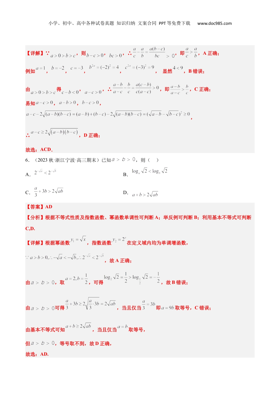 小学、初中、高中各种试卷真题知识归纳文案合同PPT等免费下载www.doc985.com【一轮复习讲义】2024年高考数学高频考点题型归纳与方法总结(新高考通用)第03练不等式与不等关系(精练)【A组在基础中考查功底】一、单选题1.(2023·全国·高三专题练习)若非零实数a,b满足,则下列不等式一定成立的是()A.B.C.D.【答案】D【分析】根据不等式的基本性质、基本不等式的条件和对数的运算,逐项判定,即可求解.【详解】对于A中,由,因为,可得,因为不确定,所以A错误;对于B中,只有当不相等时,才有成立,所以B错误;对于C中,例如,此时满足,但,所以C错误;对于D中,由不等式的基本性质,当时,可得成立,所以D正确.故选:D2.(2023·全国·高三专题练习)若,则下列不等式正确的是()A.B.C.D.【答案】C【分析】根据不等式性质判断即可.【详解】解:令,,满足,但不满足,故A错误;,,故B错误;,,,,,故C正确;,,故D错误.故选:C.3.(2023·全国·高三专题练习)已知logax>logay(0<a<1),则下列不等式恒成立的是()小学、初中、高中各种试卷真题知识归纳文案合同PPT等免费下载www.doc985.comA.y2<x2B.tanx<tanyC.D.【答案】C【分析】根据对数函数的单调性判断A、D选项,取特殊值法判断B,根据对数函数的单调性以及不等式性质判断C.【详解】 logax>logay(0<a<1),∴0<x<y,∴y2>x2,,故A和D错误;选项B,当,取x,y时,,但;显然有tanx>tany,故B错误;选项C,由0<x<y可得,故C正确;故选:C.4.(2023·全国·高三专题练习)如果,那么下列不等式成立的是()A.B.C.D.【答案】D【分析】由于,不妨令,,代入各个选项检验,只有正确,从而得出结论.【详解】解:由于,不妨令,,可得,,故A不正确.可得,,,故B不正确.可得,,,故C不正确.故选:D.二、多选题5.(2023·全国·校联考模拟预测)若,则下列结论正确的是()A.B.C.D.【答案】ACD【分析】由不等式的性质判断.小学、初中、高中各种试卷真题知识归纳文案合同PPT等免费下载www.doc985.com【详解】 ,则,,∴,即,A正确;例如,,,,,显然,B错误;由得,,∴,即,C正确;易知,,,,∴,D正确;故选:ACD.6.(2023秋·浙江宁波·高三期末)已知,则()A.B.C.D.【答案】AD【分析】根据不等式性质及指数函数、幂函数单调性可判断A;举反例可判断B;利用基本不等式可判断C,D.【详解】根据幂函数,指数函数在定义域内均为单调增函数,,故A正确;由,取,可得,故B错误;由可得,当且仅当即取等号,C错误;由基本不等式可知,当且仅当取等号,但,等号取不到,故D正确,故选:AD.小学、初中、高中各种试卷真题知识归纳文案合同PPT等免费下载www.doc985.com7.(2023秋·浙江嘉兴·高三统考期末)若实数满足,则()A.B.C.D.【答案】BCD【分析】运用不等式的性质,结合对数函数的单调性、作差比较法逐一判断即可.【详解】A:由,因此本选项不正确;B:由,因此本选项正确;C:因为,所以,因此本选项正确;D:因为,所以,因此本选项正确,故选:BCD三、填空题8.(2023·高三课时练习)以下三个命题:①“”是“”的充分条件;②“”是“”的充要条件;③“”是“”的充要条件.其中,真命题的序号是______.(写出所有满足要求的命题序号)【答案】②③【分析】根据不等式的性质一一判断求解.【详解】对于①,若,则,所以“”不是“”的充分条件,①错误;对于②,因为,所以“”是“”的充要条件,②正确;小学、初中、高中各种试卷真题知识归纳文案合同PPT等免费下载www.doc985.com对于③,若,则,若,则即,所以“”是“”的充要条件,③正确,故答案为:.②③9.(2023·全国·高三专题练习)已知,,的取值范围是_______________【答案】【分析】设,解出,再利用不等式的可加性求解即可得出.【详解】设,即,∴,解得.∴, ,∴①, ,∴②,①②,得,即的取值范围.故答案为:.四、解答题10.(2023·全国·高三专题练习)已知,,.(1)试比较与的大小,并证明;(2)分别求,的最小值.【答案】(1);证明见解析;(2)...