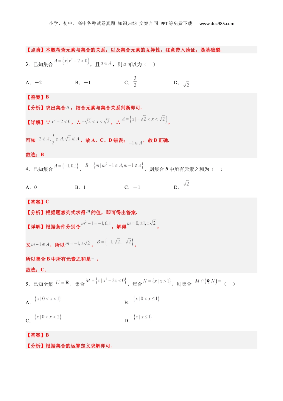 小学、初中、高中各种试卷真题知识归纳文案合同PPT等免费下载www.doc985.com【一轮复习讲义】2024年高考数学高频考点题型归纳与方法总结(新高考通用)第01讲集合(精练)【A组在基础中考查功底】一、单选题1.已知集合,,则的子集共有()A.2个B.3个C.4个D.8个【答案】C【分析】先通过集合的交集运算得出,即可根据集合内元素的个数得出子集个数.【详解】集合,,,则的子集共有个,故选:C.2.已知其,则由的值构成的集合是()A.B.C.D.【答案】D【分析】分,讨论,求出,再带入集合看是否满足互异性即可.【详解】解:,当,即时,,集合中有相同元素,舍去;当,即(舍)或时,,符合,故由的值构成的集合是.故选:D小学、初中、高中各种试卷真题知识归纳文案合同PPT等免费下载www.doc985.com【点睛】本题考查元素与集合的关系,以及集合元素的互异性,注意带入验证,是基础题.3.已知集合,且,则a可以为()A.-2B.-1C.D.【答案】B【分析】求出集合,结合元素与集合关系判断即可.【详解】 ,∴,∴,可知,故A、C、D错误;,故B正确.故选:B4.已知集合,,则集合B中所有元素之和为()A.0B.1C.-1D.【答案】C【分析】根据题意列式求得的值,即可得出答案.【详解】根据条件分别令,解得,又,所以,,所以集合B中所有元素之和是,故选:C.5.已知全集,集合,集合,则集合()A.B.C.D.【答案】B【分析】根据集合的运算定义求解即可.小学、初中、高中各种试卷真题知识归纳文案合同PPT等免费下载www.doc985.com【详解】由解得,所以,因为,所以,所以,故选:B.6.已知集合,集合,则()A.B.C.D.【答案】C【分析】化简集合,根据并集运算法则求.【详解】不等式的解集为,所以,又,所以.故选:C.7.已知集合,若,则由实数的所有可能的取值组成的集合为()A.B.C.D.【答案】D【分析】分类讨论,当时满足题意,当,解出,由,解得或【详解】当时,,满足题意.当时,,小学、初中、高中各种试卷真题知识归纳文案合同PPT等免费下载www.doc985.com若,则或,即或综上所述,的所有取值为故选:D8.已知集合,若,则的值不可能是()A.B.C.0D.3【答案】B【分析】由集合A中的元素,计算可能出现在集合B中的元素,得到的值的范围.【详解】若,则的值可能是-3,0,3,不可能是-1.故选:B.9.已知集合,,若,则的取值范围为()A.B.C.D.【答案】C【分析】由得出,再分类集合是空集和不是空集求解的取值范围即可.【详解】,,,当时,即时,,满足,当时,有,解得,小学、初中、高中各种试卷真题知识归纳文案合同PPT等免费下载www.doc985.com综上,的取值范围为,故选:C.10.已知集合,,则集合的子集个数为()A.1B.2C.3D.4【答案】B【分析】由题意可得,,从而可得,写出的子集即可得答案.【详解】解:因为,,所以,所以的子集为,共2个.故选:B.11.已知集合,,且,则的所有取值组成的集合为()A.B.C.D.【答案】D【分析】根据集合的包含关系分类讨论求解.【详解】因为,所以,所以,若,则或,经检验均满足题意,若,则或,经检验满足题意,与互异性矛盾,综上的所有取值为:,0,2,故选:D.12.设集合,,则中元素的个数是()A.2B.1C.0D.以上都不对【答案】A【分析】表示以为圆心,为半径的圆,表示直线小学、初中、高中各种试卷真题知识归纳文案合同PPT等免费下载www.doc985.com上的点,求两个图象交点个数即可.【详解】表示以为圆心,为半径的圆,表示直线上的点,圆心到直线的距离,可知直线与圆相交,故中元素有2个.故选:A【点睛】本题主要考查了集合的表示法,求两个集合的交集,注意数形结合,属于基础题.13.对于两个非空实数集合和,我们把集合记作.若集合,则中元素的个数为()A.1B.2C.3D.4【答案】C【分析】计算,得到元素个数.【详解】,则,则中元素的个数为故选:C14.已知全集,集合,,则图中阴影部分表示的集合为()A.B.C.D.【答案】C小学、初中、高中各种试卷真题知识归纳文案合同PPT等免费下载www.doc985.com【分析】求出集合,阴影部分表示为:,再分析求解即可.【详解】因为,所以,又,全...