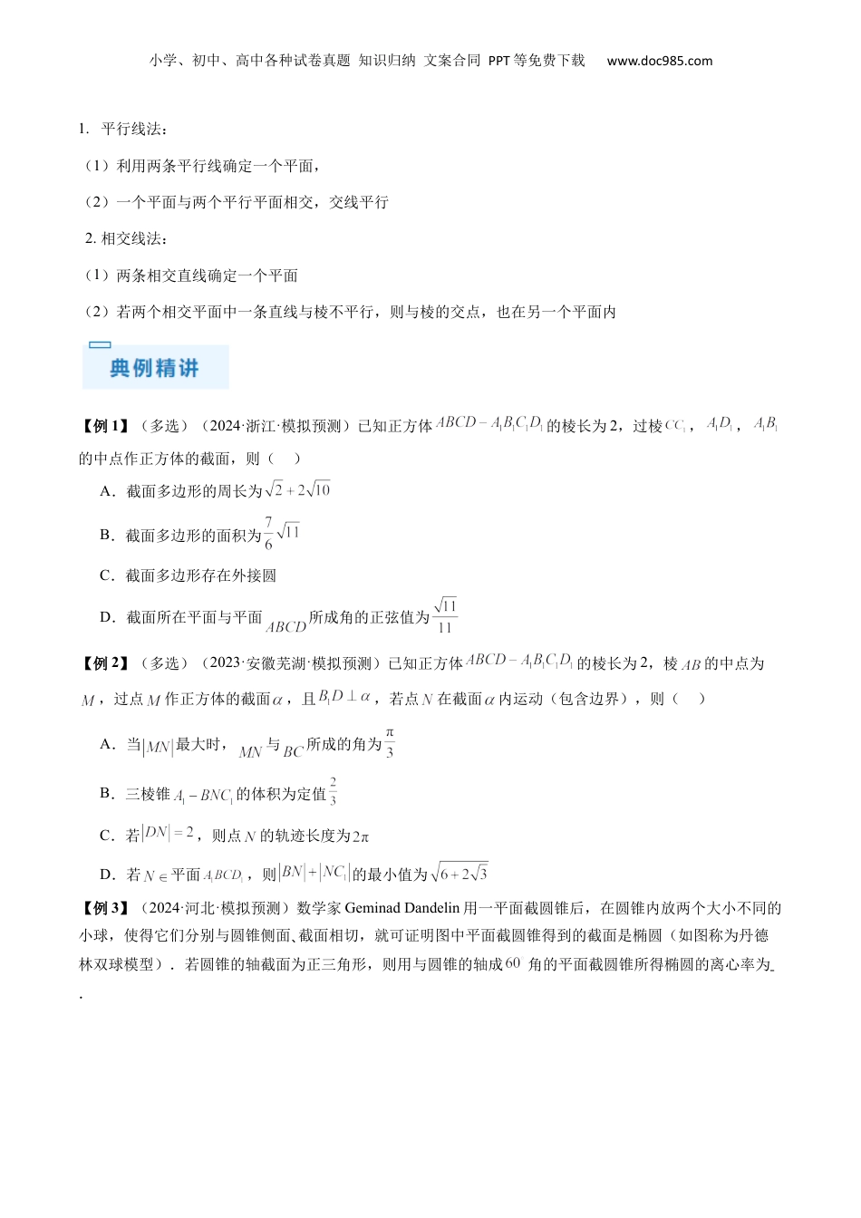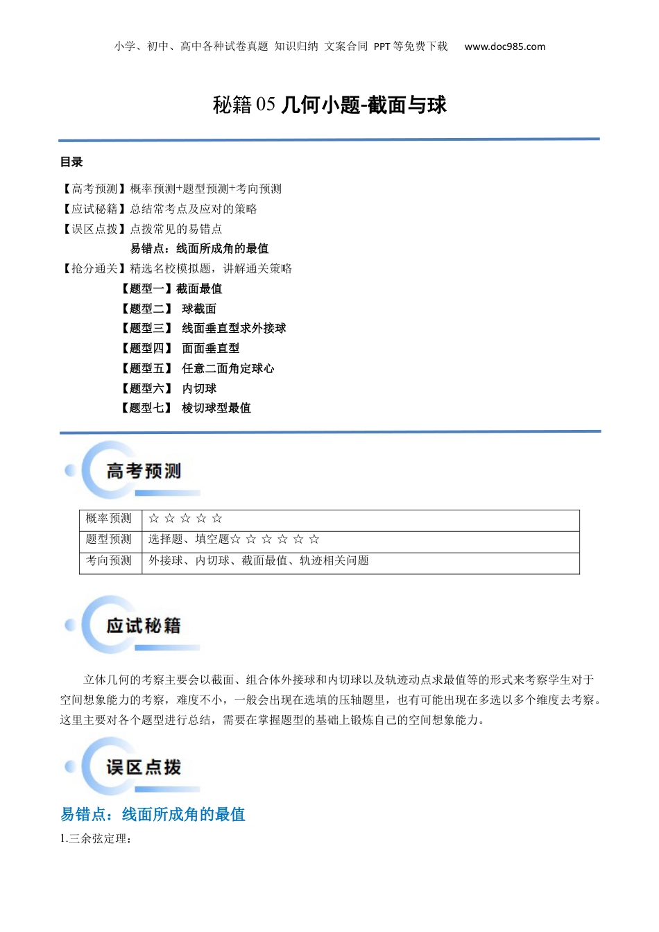 小学、初中、高中各种试卷真题知识归纳文案合同PPT等免费下载www.doc985.com秘籍05几何小题-截面与球目录【高考预测】概率预测+题型预测+考向预测【应试秘籍】总结常考点及应对的策略【误区点拨】点拨常见的易错点易错点:线面所成角的最值【抢分通关】精选名校模拟题,讲解通关策略【题型一】截面最值【题型二】球截面【题型三】线面垂直型求外接球【题型四】面面垂直型【题型五】任意二面角定球心【题型六】内切球【题型七】棱切球型最值概率预测☆☆☆☆☆题型预测选择题、填空题☆☆☆☆☆☆考向预测外接球、内切球、截面最值、轨迹相关问题立体几何的考察主要会以截面、组合体外接球和内切球以及轨迹动点求最值等的形式来考察学生对于空间想象能力的考察,难度不小,一般会出现在选填的压轴题里,也有可能出现在多选以多个维度去考察。这里主要对各个题型进行总结,需要在掌握题型的基础上锻炼自己的空间想象能力。易错点:线面所成角的最值1.三余弦定理:小学、初中、高中各种试卷真题知识归纳文案合同PPT等免费下载www.doc985.com设A为面α上一点,过A的斜线AO在面α上的射影为AB,AC为面上的一条直线,则cosθ=cosθ1⋅cosθ2说明:线面角是斜线与平面内任意直线的所成角的最小值,即线面角是线线角的最小值,又称最小角定理.2.三正弦定理:设二面角M−AB−N的度数为α,在平面上M上有一条射线AC,它和棱AB所成角为β,和平面N所成角为γ,则sinγ=sinα⋅sinβ.说明:二面角是半平面内的一条直线与另一半平面所成线面角的最大值,即二面角是线面角的最大值.例(23-24高三上·广东深圳·期末)已知矩形ABCD中,,,将沿BD折起至,当与AD所成角最大时,三棱锥的体积等于()A.B.C.D.变式1:(2023·全国·模拟预测)已知长方体中,,,M为上一动点,当AM与所成角为45°时,三棱锥外接球的体积为()A.B.C.D.【题型一】截面最值求截面方法:小学、初中、高中各种试卷真题知识归纳文案合同PPT等免费下载www.doc985.com1.平行线法:(1)利用两条平行线确定一个平面,(2)一个平面与两个平行平面相交,交线平行2.相交线法:(1)两条相交直线确定一个平面(2)若两个相交平面中一条直线与棱不平行,则与棱的交点,也在另一个平面内【例1】(多选)(2024·浙江·模拟预测)已知正方体的棱长为2,过棱,,的中点作正方体的截面,则()A.截面多边形的周长为B.截面多边形的面积为C.截面多边形存在外接圆D.截面所在平面与平面所成角的正弦值为【例2】(多选)(2023·安徽芜湖·模拟预测)已知正方体的棱长为2,棱的中点为,过点作正方体的截面,且,若点在截面内运动(包含边界),则()A.当最大时,与所成的角为B.三棱锥的体积为定值C.若,则点的轨迹长度为D.若平面,则的最小值为【例3】(2024·河北·模拟预测)数学家GeminadDandelin用一平面截圆锥后,在圆锥内放两个大小不同的小球,使得它们分别与圆锥侧面、截面相切,就可证明图中平面截圆锥得到的截面是椭圆(如图称为丹德林双球模型).若圆锥的轴截面为正三角形,则用与圆锥的轴成角的平面截圆锥所得椭圆的离心率为.小学、初中、高中各种试卷真题知识归纳文案合同PPT等免费下载www.doc985.com【变式1】(多选)(2024·吉林·模拟预测)如图,在棱长为1的正方体中,M,N分别是,的中点,为线段上的动点,则下列说法正确的是()A.一定是异面直线B.存在点,使得C.直线与平面所成角的正切值的最大值为D.过M,N,P三点的平面截正方体所得截面面积的最大值为【变式2】(23-24高三下·江西·开学考试)在正四面体中,M为PA边的中点,过点M作该正四面体外接球的截面,记最大的截面半径为R,最小的截面半径为r,则;若记该正四面体和其外接球的体积分别为和,则.【变式3】(2024·山东日照·一模)已知正四棱锥的所有棱长都为2;点E在侧棱SC上,过点E且垂直于SC的平面截该棱锥,得到截面多边形H,则H的边数至多为,H的面积的最大值为.小学、初中、高中各种试卷真题知识归纳文案合同PPT等免费下载www.doc985.com【题型二】球截面用一个平面去截球,若平面经过球心,所得的截面称为球的大圆;若平面不...