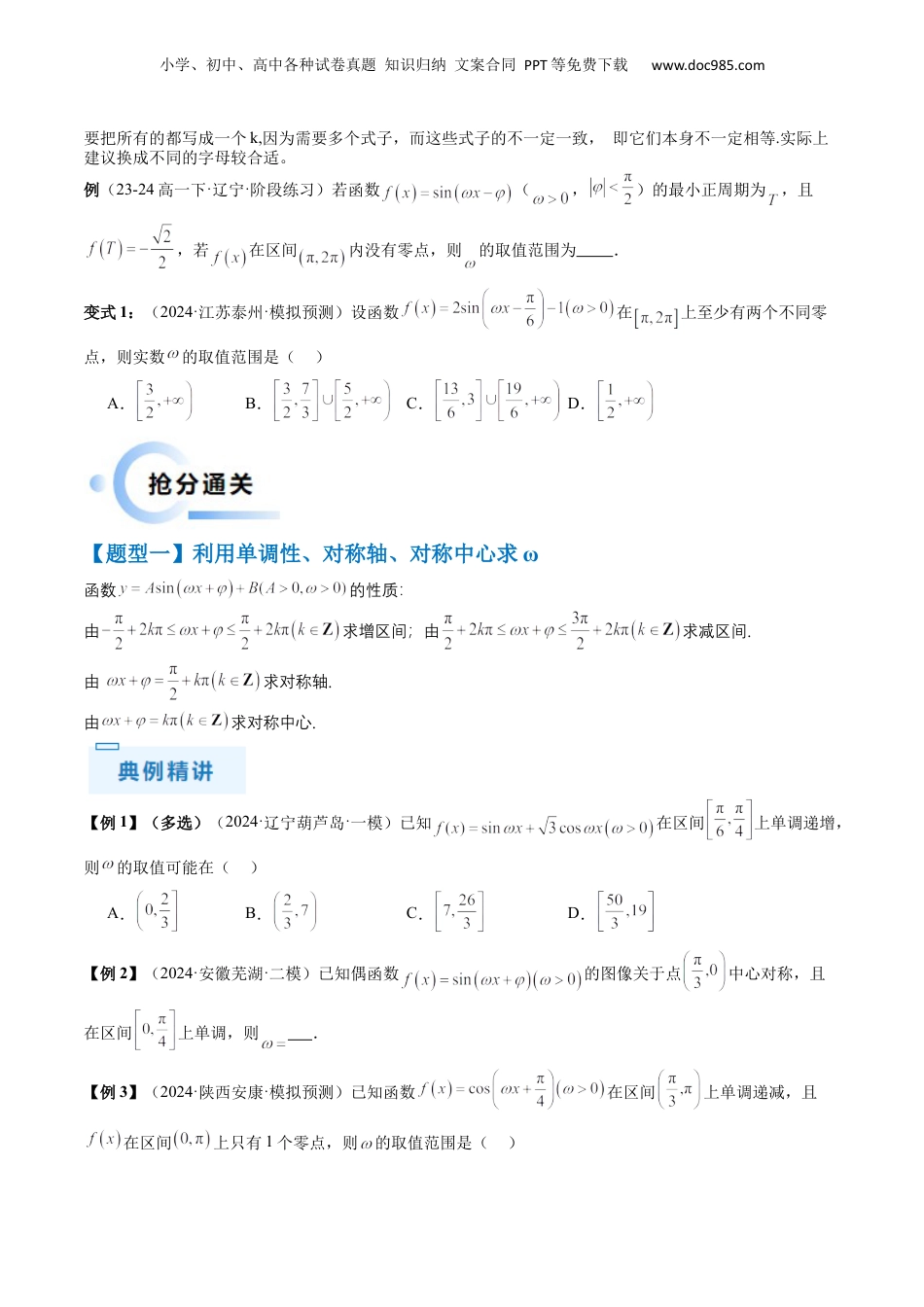 小学、初中、高中各种试卷真题知识归纳文案合同PPT等免费下载www.doc985.com秘籍04三角函数求归类目录【高考预测】概率预测+题型预测+考向预测【应试秘籍】总结常考点及应对的策略【误区点拨】点拨常见的易错点易错点:多个条件同时出现易弄混k的取值【抢分通关】精选名校模拟题,讲解通关策略【题型一】利用单调性、对称轴、对称中心求ω【题型二】极(最)值点“恰有”型求ω【题型三】极(最)值点“没有”型求ω【题型四】极(最)值点“至少、至多”型求ω【题型五】最值与恒成立型求ω概率预测☆☆☆☆☆题型预测选择题、填空题☆☆☆☆☆考向预测求的范围和最值三角函数作为基础题题型之一,在新结构试卷中,原本第一道解答题的位置可能被替代,所以小题的三角函数问题就会突出,常考的齐次化切、范围相关的问题都会是今年的重点题型,范围相关的问题一般有整体法和卡根法两种解法,根据学生掌握情况自主学习,这里用的大多是整体法,需要清晰的分清对于三角函数图象的影响以及题干的条件从而用对应的方法解决。易错点:多个条件同时出现易弄混k的取值易错提醒:涉及到对称轴对称中心以及单调性多个同时出现时,,不小学、初中、高中各种试卷真题知识归纳文案合同PPT等免费下载www.doc985.com要把所有的都写成一个k,因为需要多个式子,而这些式子的不一定一致,即它们本身不一定相等.实际上建议换成不同的字母较合适。例(23-24高一下·辽宁·阶段练习)若函数(,)的最小正周期为,且,若在区间内没有零点,则的取值范围为.变式1:(2024·江苏泰州·模拟预测)设函数在上至少有两个不同零点,则实数的取值范围是()A.B.C.D.【题型一】利用单调性、对称轴、对称中心求ω函数的性质:由求增区间;由求减区间.由求对称轴.由求对称中心.【例1】(多选)(2024·辽宁葫芦岛·一模)已知在区间上单调递增,则的取值可能在()A.B.C.D.【例2】(2024·安徽芜湖·二模)已知偶函数的图像关于点中心对称,且在区间上单调,则.【例3】(2024·陕西安康·模拟预测)已知函数在区间上单调递减,且在区间上只有1个零点,则的取值范围是()小学、初中、高中各种试卷真题知识归纳文案合同PPT等免费下载www.doc985.comA.B.C.D.【变式1】(2024·陕西榆林·二模)已知函数在上单调,的图象关于点中心对称且关于直线对称,则的取值个数是()A.1B.2C.3D.4【变式2】(2024·安徽池州·模拟预测)已知函数的部分图像如图所示,则()A.直线是的对称轴B.点是的对称中心C.在区间上单调递减D.当时,的值域为【变式3】(多选)(2024·辽宁丹东·一模)已知函数(,)满足,且在上单调递减,则()A.B.为奇函数C.的对称轴为,D.在上有3个零点【题型二】极(最)值点“恰有”型求ω小学、初中、高中各种试卷真题知识归纳文案合同PPT等免费下载www.doc985.com【例1】(多选)(2024·全国·一模)设函数在区间上恰有两个极值点,两个零点,则的取值可能是()A.B.2C.D.【例2】(2024·广西·二模)已知函数在区间上恰有两个零点,则实数的取值范围是()A.B.C.D.【例3】(2024·全国·模拟预测)已知函数.若,,且在上恰有3个极值点,则实数的取值范围为()A.B.C.D.【变式1】(多选)(2024·广东·一模)已知函数的图象向左平移个单位后到函数的图象(如图所示),则()A.B.在上为增函数C.当时,函数在上恰有两个不同的极值点小学、初中、高中各种试卷真题知识归纳文案合同PPT等免费下载www.doc985.comD.是函数的图象的一条对称轴【变式2】(2024·辽宁抚顺·一模)已知是函数的两个零点,且,若将函数的图象向左平移个单位后得到的图象关于轴对称,且函数在内恰有2个最值点,则实数的取值范围为.【变式3】(2024·山东烟台·一模)若函数在上恰有5个零点,且在上单调递增,则正实数的取值范围为.【题型三】极(最)值点“没有”型求ω涉及到三角函数图像性质的运用,在这里需注意:两对称轴之间的距离为半个周期;相邻对称轴心之间的距离为半个周期;相邻对称轴和对称中心之间的距离为个周期.【例1】(2024·陕西西安·二模)已知函...