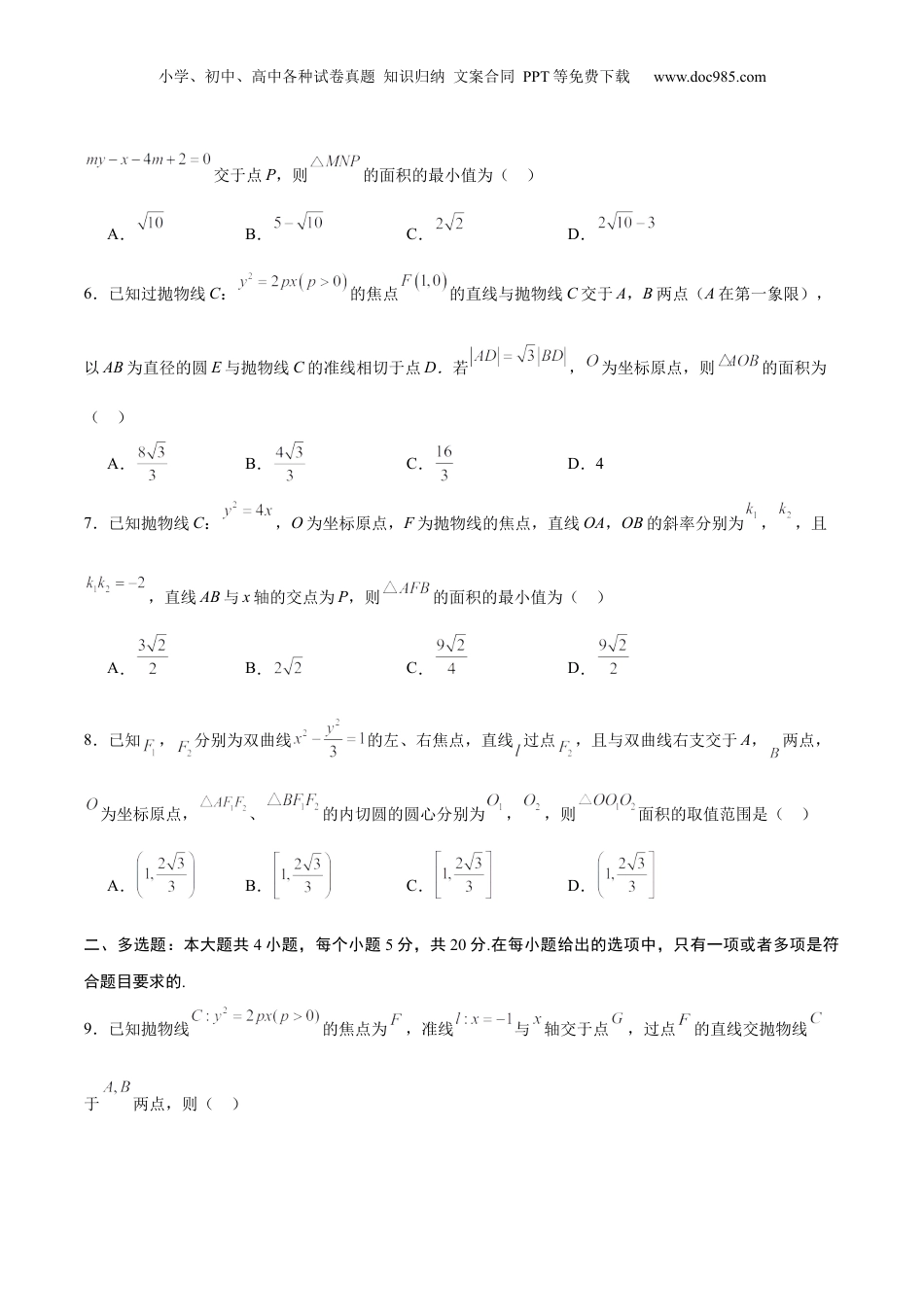 小学、初中、高中各种试卷真题知识归纳文案合同PPT等免费下载www.doc985.com专题27圆锥曲线中的面积问题考试时间:120分钟满分:150分一、单选题:本大题共8小题,每个小题5分,共40分.在每小题给出的选项中,只有一项是符合题目要求的.1.已知是抛物线上一点,为抛物线的焦点,点,若,则的面积为()A.B.C.D.2.已知点是椭圆上一点,椭圆的左、右焦点分别为、,且,则的面积为()A.6B.12C.D.3.已知是抛物线的准线,为的焦点,分别为和上的两点,与轴交于点,且四边形的面积为,则的方程为()A.B.C.D.4.已知双曲线的左右焦点为,P为右支上除顶点外的任意一点,圆I为的内切圆,且与x轴切于A点,过作,垂足为B,若,则的面积为()A.B.C.9D.25.已知直线l:与x轴、y轴分别交于M,N两点,动直线:和:小学、初中、高中各种试卷真题知识归纳文案合同PPT等免费下载www.doc985.com交于点P,则的面积的最小值为()A.B.C.D.6.已知过抛物线C:的焦点的直线与抛物线C交于A,B两点(A在第一象限),以AB为直径的圆E与抛物线C的准线相切于点D.若,为坐标原点,则的面积为()A.B.C.D.47.已知抛物线C:,O为坐标原点,F为抛物线的焦点,直线OA,OB的斜率分别为,,且,直线AB与x轴的交点为P,则的面积的最小值为()A.B.C.D.8.已知,分别为双曲线的左、右焦点,直线过点,且与双曲线右支交于A,两点,为坐标原点,、的内切圆的圆心分别为,,则面积的取值范围是()A.B.C.D.二、多选题:本大题共4小题,每个小题5分,共20分.在每小题给出的选项中,只有一项或者多项是符合题目要求的.9.已知拋物线的焦点为,准线与轴交于点,过点的直线交抛物线于两点,则()小学、初中、高中各种试卷真题知识归纳文案合同PPT等免费下载www.doc985.comA.B.C.以线段为直径的圆一定与直线相切D.的面积的最小值为410.设抛物线的焦点为,为坐标原点,直线与C交于A,B两点,以AB为直径的圆与y轴交于D,E两点,则()A.B.C.是钝角D.的面积小于的面积11.已知椭圆,为的右焦点,为的左顶点,为直线与的两个交点,则()A.的取值范围是B.周长的最小值为C.的面积的最大值为D.直线与的斜率之积为12.已知椭圆的左,右焦点分别为,过点垂直于x轴的直线交椭圆C于A,B两点,,若点P是椭圆C上的动点,则下列说法正确的是()A.的最小值为B.的面积的最大值为C.的取值范围为D.C上有且只有4个点P,使得是直角三角形三、填空题:本大题共4小题,每小题5分,共20分.把答案填在答题卡中的横线上.13.设,是双曲线:的两个焦点,为坐标原点,点P在的右支上,且小学、初中、高中各种试卷真题知识归纳文案合同PPT等免费下载www.doc985.com,则的面积为.14.已知抛物线的焦点为F,过点F作两条互相垂直的直线,,且直线,分别与抛物线C交于A,B和D,E,则四边形ADBE面积的最小值是.15.已知抛物线,圆,设为坐标原点,过圆心的直线与圆交于点,直线分别交抛物线于点(点不与点重合).记的面积为,的面积为,则的最大值.16.抛物线的弦与过弦的端点的两条切线所围成的三角形常被称为阿基米德三角形.阿基米德三角形有一些有趣的性质,如:若抛物线的弦过焦点,则过弦的端点的两条切线的交点在其准线上.设抛物线,弦AB过焦点,为其阿基米德三角形,则的面积的最小值为.四、解答题:本大题共6小题,共70分.解答应写出必要的文字说明、证明过程或演算步骤.17.已知椭圆的一个焦点为,且过点.(1)求椭圆的方程;(2)直线与椭圆交于两点,求面积的最大值及此时直线的方程.小学、初中、高中各种试卷真题知识归纳文案合同PPT等免费下载www.doc985.com18.椭圆的左顶点为,右顶点为,满足,且椭圆的离心率为.(1)求椭圆的标准方程;(2)已知点在椭圆的内部,直线和直线分别与椭圆交于另外的点和点,若的面积为,求的值.19.设椭圆的左、右顶点分别为,且焦距为.点在椭圆上且异于两点,若直线与的斜率之积为.(1)求椭圆的标准方程;(2)过点作不与轴重合的直线与椭圆相交于两点,直线的方程为:,过点作垂直于直线,交于点.求面积的最大值.20.已知的两顶点坐标,.(1)求动点的轨迹的方...