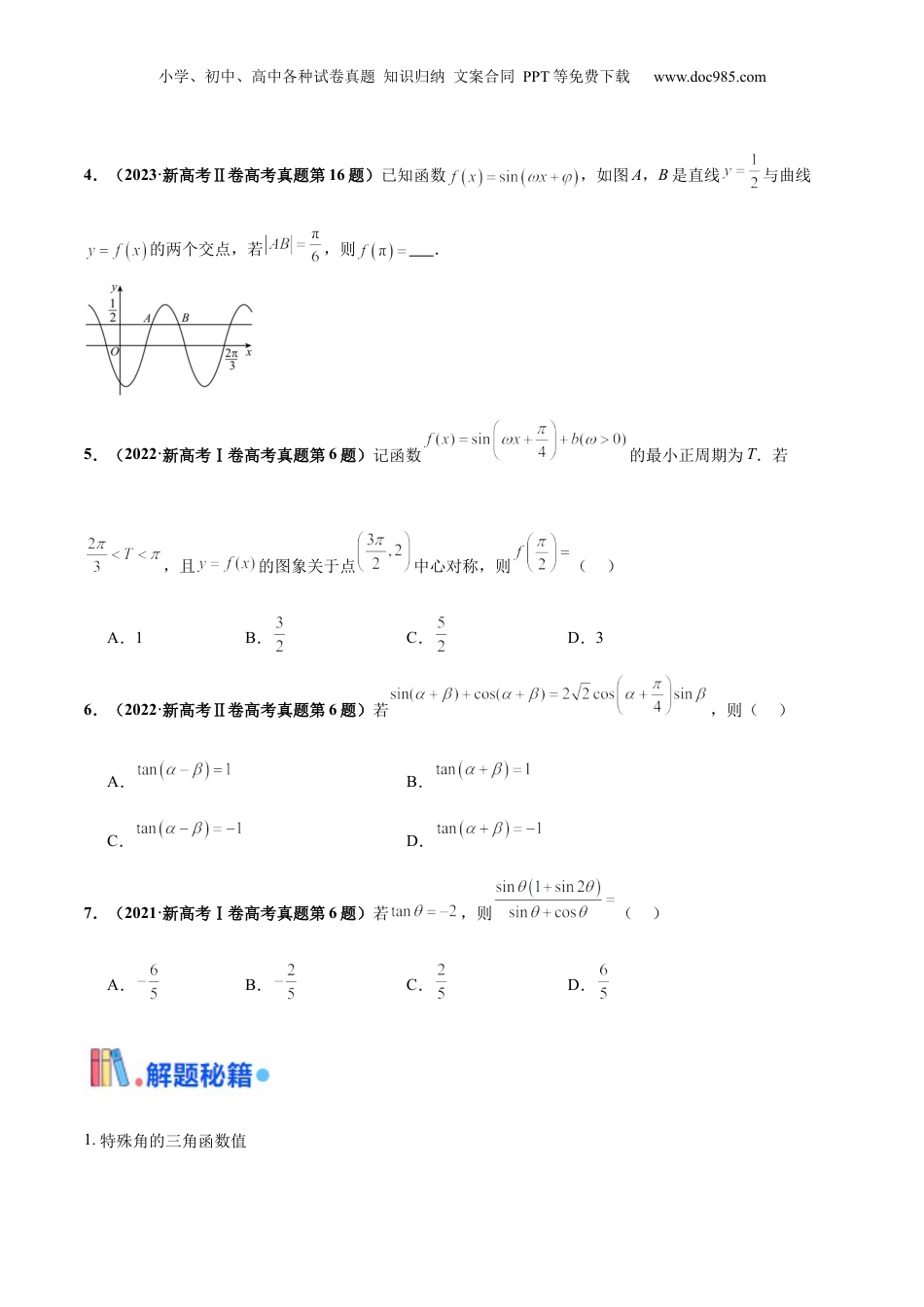 小学、初中、高中各种试卷真题知识归纳文案合同PPT等免费下载www.doc985.com押新高考5题三角函数与解三角形考点4年考题考情分析三角函数与解三角形2023年新高考Ⅰ卷第8、15题2023年新高考Ⅱ卷第7、16题2022年新高考Ⅰ卷第6题2022年新高考Ⅱ卷第6题2021年新高考Ⅰ卷第6题2020年新高考Ⅰ卷第10、15题2020年新高考Ⅱ卷第11、16题三角函数与解三角形会以单选题、多选题、填空题、解答题4类题型进行考查,单选题难度较易或一般,纵观近几年的新高考试题,分别考查三角函数的图象与性质,三角恒等变换,本内容是新高考冲刺的重点复习内容。可以预测2024年新高考命题方向将继续以三角函数的图象与性质、值域及参数范围、三角恒等变换、解三角形及其实际应用等问题展开命题.1.(2023·新高考Ⅰ卷高考真题第8题)已知,则().A.B.C.D.2.(2023·新高考Ⅰ卷高考真题第15题)已知函数在区间有且仅有3个零点,则的取值范围是.3.(2023·新高考Ⅱ卷高考真题第7题)已知为锐角,,则().A.B.C.D.小学、初中、高中各种试卷真题知识归纳文案合同PPT等免费下载www.doc985.com4.(2023·新高考Ⅱ卷高考真题第16题)已知函数,如图A,B是直线与曲线的两个交点,若,则.5.(2022·新高考Ⅰ卷高考真题第6题)记函数的最小正周期为T.若,且的图象关于点中心对称,则()A.1B.C.D.36.(2022·新高考Ⅱ卷高考真题第6题)若,则()A.B.C.D.7.(2021·新高考Ⅰ卷高考真题第6题)若,则()A.B.C.D.1.特殊角的三角函数值小学、初中、高中各种试卷真题知识归纳文案合同PPT等免费下载www.doc985.com2.同角三角函数的基本关系平方关系:商数关系:3.正弦的和差公式,4.余弦的和差公式,5.正切的和差公式,6.正弦的倍角公式7.余弦的倍角公式升幂公式:,降幂公式:,小学、初中、高中各种试卷真题知识归纳文案合同PPT等免费下载www.doc985.com8.正切的倍角公式9.推导公式10.辅助角公式,,其中,11.正弦定理(1)基本公式:(其中为外接圆的半径)(2)变形12.三角形中三个内角的关系,,13.余弦定理(1)边的余弦定理,,(2)角的余弦定理,,14.三角形的面积公式小学、初中、高中各种试卷真题知识归纳文案合同PPT等免费下载www.doc985.com1.(2024·广东湛江·二模)函数在上的值域为()A.B.C.D.2.(2024·全国·二模)若函数的图象关于轴对称,则()A.B.C.D.3.(2024·山东济南·一模)已知a,b,c分别为三个内角A,B,C的对边,且,则()A.B.C.D.4.(2024·黑龙江齐齐哈尔·二模)在中,,,则()A.B.C.D.5.(2024·辽宁大连·一模)若,且,则()A.B.C.D.16.(2024·贵州·模拟预测)如图,甲秀楼位于贵州省贵阳市南明区甲秀路,是该市的标志性建筑之一.甲秀楼始建于明朝,后楼毁重建,改名“凤来阁”,清代甲秀楼多次重修,并恢复原名、现存建筑是宣统元年(1909年)重建.甲秀楼上下三层,白石为栏,层层收进.某研究小组将测量甲秀楼最高点离地面的高度,选取了与该楼底在同一水平面内的两个测量基点与,现测得,,,在点测得甲秀楼顶端的仰角为,则甲秀楼的高度约为(参考数据:,)()小学、初中、高中各种试卷真题知识归纳文案合同PPT等免费下载www.doc985.comA.B.C.D.7.(2024·湖南·模拟预测)湖南省衡阳市的来雁塔,始建于明万历十九年(1591年),因鸿雁南北迁徙时常在境内停留而得名.1983年被湖南省人民政府公布为重点文物保护单位.为测量来雁塔的高度,因地理条件的限制,分别选择C点和一建筑物DE的楼顶E为测量观测点,已知点A为塔底,在水平地面上,来雁塔AB和建筑物DE均垂直于地面(如图所示).测得,在C点处测得E点的仰角为30°,在E点处测得B点的仰角为60°,则来雁塔AB的高度约为()(,精确到)A.B.C.D.8.(2024·云南·一模)已知,则()A.B.C.D.小学、初中、高中各种试卷真题知识归纳文案合同PPT等免费下载www.doc985.com9.(2024·全国·模拟预测)已知,则()A.B.C.D.10.(2024·重庆·模拟预测)已知角θ满足,则()A.B.C.D.11.(2024·全国·模拟预测)已知为锐角,,则()A.B...