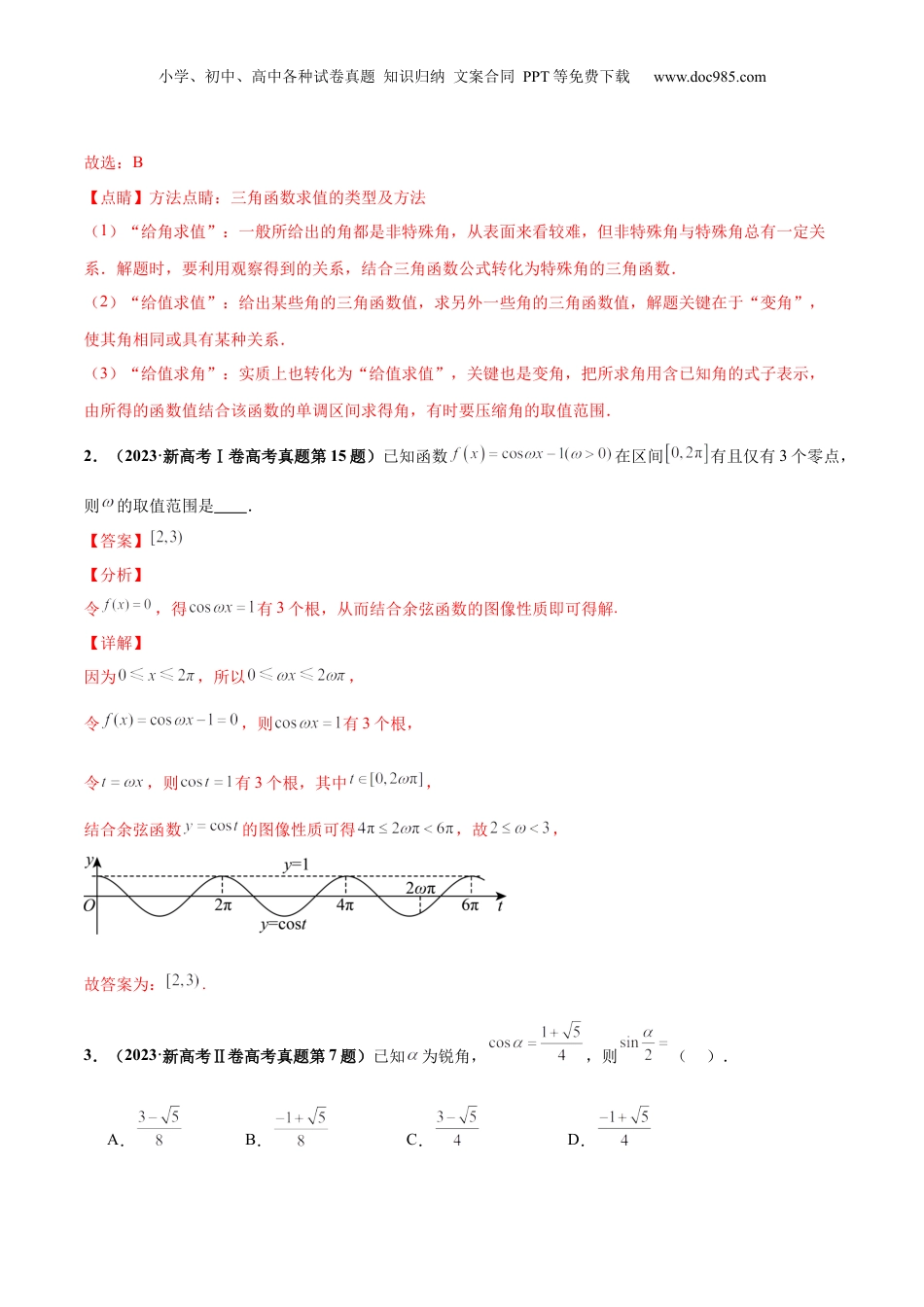 小学、初中、高中各种试卷真题知识归纳文案合同PPT等免费下载www.doc985.com押新高考5题三角函数与解三角形考点4年考题考情分析三角函数与解三角形2023年新高考Ⅰ卷第8、15题2023年新高考Ⅱ卷第7、16题2022年新高考Ⅰ卷第6题2022年新高考Ⅱ卷第6题2021年新高考Ⅰ卷第6题2020年新高考Ⅰ卷第10、15题2020年新高考Ⅱ卷第11、16题三角函数与解三角形会以单选题、多选题、填空题、解答题4类题型进行考查,单选题难度较易或一般,纵观近几年的新高考试题,分别考查三角函数的图象与性质,三角恒等变换,本内容是新高考冲刺的重点复习内容。可以预测2024年新高考命题方向将继续以三角函数的图象与性质、值域及参数范围、三角恒等变换、解三角形及其实际应用等问题展开命题.1.(2023·新高考Ⅰ卷高考真题第8题)已知,则().A.B.C.D.【答案】B【分析】根据给定条件,利用和角、差角的正弦公式求出,再利用二倍角的余弦公式计算作答.【详解】因为,而,因此,则,所以.小学、初中、高中各种试卷真题知识归纳文案合同PPT等免费下载www.doc985.com故选:B【点睛】方法点睛:三角函数求值的类型及方法(1)“给角求值”:一般所给出的角都是非特殊角,从表面来看较难,但非特殊角与特殊角总有一定关系.解题时,要利用观察得到的关系,结合三角函数公式转化为特殊角的三角函数.(2)“给值求值”:给出某些角的三角函数值,求另外一些角的三角函数值,解题关键在于“变角”,使其角相同或具有某种关系.(3)“给值求角”:实质上也转化为“给值求值”,关键也是变角,把所求角用含已知角的式子表示,由所得的函数值结合该函数的单调区间求得角,有时要压缩角的取值范围.2.(2023·新高考Ⅰ卷高考真题第15题)已知函数在区间有且仅有3个零点,则的取值范围是.【答案】【分析】令,得有3个根,从而结合余弦函数的图像性质即可得解.【详解】因为,所以,令,则有3个根,令,则有3个根,其中,结合余弦函数的图像性质可得,故,故答案为:.3.(2023·新高考Ⅱ卷高考真题第7题)已知为锐角,,则().A.B.C.D.小学、初中、高中各种试卷真题知识归纳文案合同PPT等免费下载www.doc985.com【答案】D【分析】根据二倍角公式(或者半角公式)即可求出.【详解】因为,而为锐角,解得:.故选:D.4.(2023·新高考Ⅱ卷高考真题第16题)已知函数,如图A,B是直线与曲线的两个交点,若,则.【答案】【分析】设,依题可得,,结合的解可得,,从而得到的值,再根据以及,即可得,进而求得.【详解】设,由可得,由可知,或,,由图可知,,即,.小学、初中、高中各种试卷真题知识归纳文案合同PPT等免费下载www.doc985.com因为,所以,即,.所以,所以或,又因为,所以,.故答案为:.【点睛】本题主要考查根据图象求出以及函数的表达式,从而解出,熟练掌握三角函数的有关性质,以及特殊角的三角函数值是解题关键.5.(2022·新高考Ⅰ卷高考真题第6题)记函数的最小正周期为T.若,且的图象关于点中心对称,则()A.1B.C.D.3【答案】A【分析】由三角函数的图象与性质可求得参数,进而可得函数解析式,代入即可得解.【详解】由函数的最小正周期T满足,得,解得,又因为函数图象关于点对称,所以,且,所以,所以,,所以.小学、初中、高中各种试卷真题知识归纳文案合同PPT等免费下载www.doc985.com故选:A6.(2022·新高考Ⅱ卷高考真题第6题)若,则()A.B.C.D.【答案】C【分析】由两角和差的正余弦公式化简,结合同角三角函数的商数关系即可得解.【详解】[方法一]:直接法由已知得:,即:,即:所以故选:C[方法二]:特殊值排除法解法一:设β=0则sinα+cosα=0,取,排除A,B;再取α=0则sinβ+cosβ=2sinβ,取β,排除D;选C.[方法三]:三角恒等变换所以即小学、初中、高中各种试卷真题知识归纳文案合同PPT等免费下载www.doc985.com故选:C.7.(2021·新高考Ⅰ卷高考真题第6题)若,则()A.B.C.D.【答案】C【分析】将式子先利用二倍角公式和平方关系配方化简,然后增添分母(),进行齐次化处理,化为正切的表达式,代入即可得到结果.【详解】将式子进行齐次化处理...