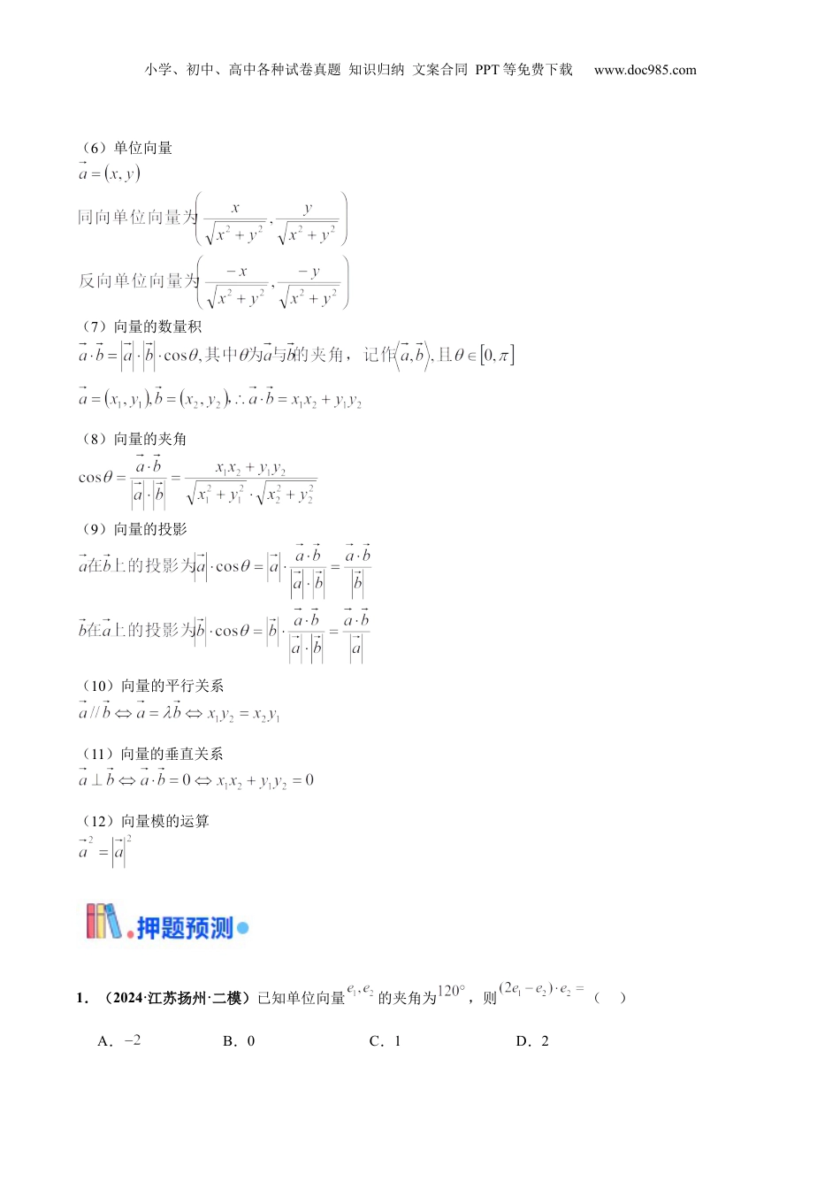 小学、初中、高中各种试卷真题知识归纳文案合同PPT等免费下载www.doc985.com押新高考2题平面向量考点4年考题考情分析平面向量2023年新高考Ⅰ卷第3题2023年新高考Ⅱ卷第13题2022年新高考Ⅰ卷第3题2022年新高考Ⅱ卷第4题2021年新高考Ⅰ卷第10题2021年新高考Ⅱ卷第15题2020年新高考Ⅰ卷第7题2020年新高考Ⅱ卷第3题高考中平面向量均是以小题的形式进行考查,难度较易或一般,纵观近几年的新高考试题,分别考查了平面向量的基本定理,平面向量的坐标运算,平面向量数量积与夹角公式,可以预测2024年新高考命题方向将继续围绕平面向量数量积运算、坐标运算等展开命题.1.(2023·新高考Ⅰ卷高考真题第3题)已知向量,若,则()A.B.C.D.2.(2023·新高考Ⅱ卷高考真题第13题)已知向量,满足,,则.3.(2022·新高考Ⅰ卷高考真题第3题)在中,点D在边AB上,.记,则()小学、初中、高中各种试卷真题知识归纳文案合同PPT等免费下载www.doc985.comA.B.C.D.4.(2022·新高考Ⅱ卷高考真题第4题)已知向量,若,则()A.B.C.5D.65.(2021·新高考Ⅰ卷高考真题第10题)已知为坐标原点,点,,,,则()A.B.C.D.6.(2021·新高考Ⅱ卷高考真题第15题)已知向量,,,_______.向量的运算(1)两点间的向量坐标公式:,,终点坐标始点坐标(2)向量的加减法,,(3)向量的数乘运算,则:(4)向量的模,则的模(5)相反向量已知,则;已知小学、初中、高中各种试卷真题知识归纳文案合同PPT等免费下载www.doc985.com(6)单位向量(7)向量的数量积(8)向量的夹角(9)向量的投影(10)向量的平行关系(11)向量的垂直关系(12)向量模的运算1.(2024·江苏扬州·二模)已知单位向量的夹角为,则()A.B.0C.1D.2小学、初中、高中各种试卷真题知识归纳文案合同PPT等免费下载www.doc985.com2.(2024·湖北·一模)若,,则()A.B.C.3D.53.(2024·湖北·二模)已知正方形的边长为2,若,则()A.2B.C.4D.4.(2024·山东济南·一模)已知,,若,则()A.1B.C.D.5.(2024·山东潍坊·一模)已知平面向量,,若,则实数()A.B.C.D.26.(2024·河北·模拟预测)平面向量满足,则在方向上的投影向量为()A.B.C.D.7.(2024·浙江·模拟预测)已知向量,向量在向量上的投影向量()A.B.C.D.8.(2024·湖南·模拟预测)已知平面向量,,则在上的投影向量为()A.B.C.D.9.(2024·河北沧州·模拟预测)已知向量与的夹角为,且,,则()A.B.C.4D.小学、初中、高中各种试卷真题知识归纳文案合同PPT等免费下载www.doc985.com10.(2024·福建龙岩·一模)已知向量,则()A.B.C.D.11.(2024·福建厦门·二模)在平面直角坐标系中,点在直线上.若向量,则在上的投影向量为()A.B.C.D.12.(2024·湖南·模拟预测)已知与的夹角为,则()A.B.C.D.13.(2024·浙江·模拟预测)已知向量是平面上两个不共线的单位向量,且,则()A.三点共线B.三点共线C.三点共线D.三点共线14.(2024·江苏·一模)已知平面向量满足,则与的夹角为()A.B.C.D.15.(2024·广东佛山·模拟预测)在中,,若,线段与交于点,则()A.B.C.D.小学、初中、高中各种试卷真题知识归纳文案合同PPT等免费下载www.doc985.com16.(2024·湖北武汉·二模)在平面直角坐标系中为原点,,,则向量在向量上的投影向量为()A.B.C.D.17.(2024·浙江·一模)已知平面向量满足:与的夹角为,若,则()A.0B.1C.D.18.(2024·广东湛江·一模)已知向量,均为单位向量,,若向量与向量的夹角为,则()A.B.C.D.19.(2024·广东佛山·二模)已知与为两个不共线的单位向量,则()A.B.C.若,则D.若,则20.(2024·辽宁·模拟预测)如图,在平行四边形中,为线段的中点,,,,则()小学、初中、高中各种试卷真题知识归纳文案合同PPT等免费下载www.doc985.comA.20B.22C.24D.25