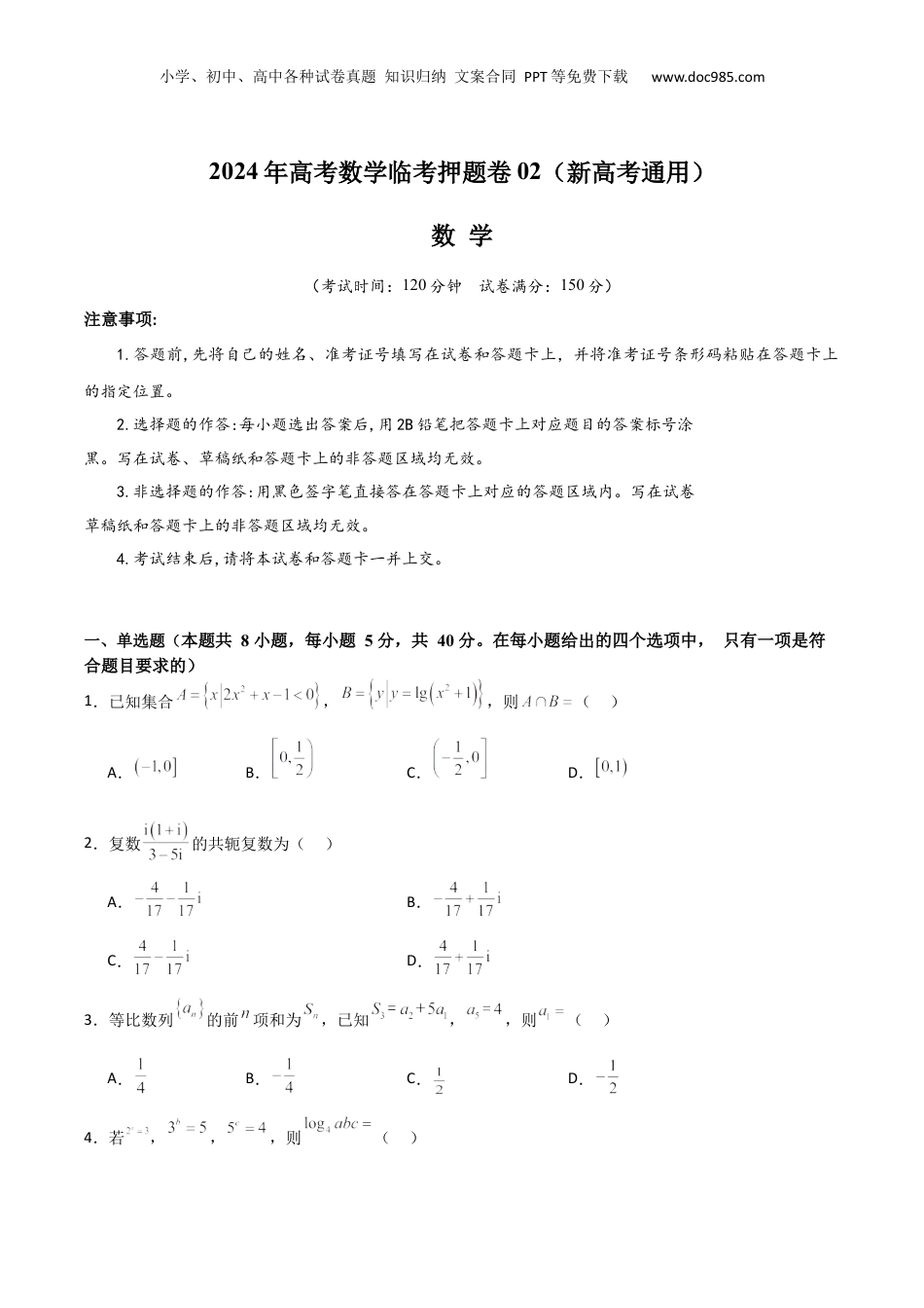 小学、初中、高中各种试卷真题知识归纳文案合同PPT等免费下载www.doc985.com2024年高考数学临考押题卷02(新高考通用)数学(考试时间:120分钟试卷满分:150分)注意事项:1.答题前,先将自己的姓名、准考证号填写在试卷和答题卡上,并将准考证号条形码粘贴在答题卡上的指定位置。2.选择题的作答:每小题选出答案后,用2B铅笔把答题卡上对应题目的答案标号涂黑。写在试卷、草稿纸和答题卡上的非答题区域均无效。3.非选择题的作答:用黑色签字笔直接答在答题卡上对应的答题区域内。写在试卷草稿纸和答题卡上的非答题区域均无效。4.考试结束后,请将本试卷和答题卡一并上交。一、单选题(本题共8小题,每小题5分,共40分。在每小题给出的四个选项中,只有一项是符合题目要求的)1.已知集合,,则()A.B.C.D.2.复数的共轭复数为()A.B.C.D.3.等比数列的前项和为,已知,,则()A.B.C.D.4.若,,,则()小学、初中、高中各种试卷真题知识归纳文案合同PPT等免费下载www.doc985.comA.B.C.D.15.关于函数(,,),有下列四个说法:①的最大值为3②的图象可由的图象平移得到③的图象上相邻两个对称中心间的距离为④的图象关于直线对称若有且仅有一个说法是错误的,则()A.B.C.D.6.设为坐标原点,圆与轴切于点,直线交圆于两点,其中在第二象限,则()A.B.C.D.7.祖暅是我国南北朝时期伟大的数学家.祖暅原理用现代语言可以描述为“夹在两个平行平面之间的两个几何体,被平行于这两个平面的任意平面所截,如果截得的面积总相等,那么这两个几何体的体积相等”.例如,可以用祖暅原理推导半球的体积公式,如图,底面半径和高都为的圆柱与半径为的半球放置在同一底平面上,然后在圆柱内挖去一个半径为,高为的圆锥后得到一个新的几何体,用任何一个平行于底面的平面去截这两个几何体时,所截得的截面面积总相等,由此可证明半球的体积和新几何体的体积相等.若用平行于半球底面的平面去截半径为的半球,且球心到平面的距离为,则平面与半球底面之间的几何体的体积是()小学、初中、高中各种试卷真题知识归纳文案合同PPT等免费下载www.doc985.comA.B.C.D.8.定义,对于任意实数,则的值是()A.B.C.D.二、多选题(本题共3小题,每小题6分,共18分。在每小题给出的选项中,有多项符合题目要求。全部选对得6分,部分选对得部分分,有选错得0分)9.已知等比数列的公比为,前项和为,前项积为,且,,则()A.数列是递增数列B.数列是递减数列C.若数列是递增数列,则D.若数列是递增数列,则10.有n(,)个编号分别为1,2,3,…,n的盒子,1号盒子中有2个白球和1个黑球,其余盒子中均有1个白球和1个黑球.现从1号盒子任取一球放入2号盒子;再从2号盒子任取一球放入3号盒子;…;以此类推,记“从号盒子取出的球是白球”为事件(,2,3,…,n),则()A.B.C.D.小学、初中、高中各种试卷真题知识归纳文案合同PPT等免费下载www.doc985.com11.抛物线的焦点为,、是抛物线上的两个动点,是线段的中点,过作准线的垂线,垂足为,则()A.若,则直线的斜率为或B.若,则C.若和不平行,则D.若,则的最大值为三、填空题(本题共3小题,每小题5分,共15分)12.的展开式中的系数为.13.设双曲线C:(,)的一个焦点为F,过F作一条渐近线的垂线,垂足为E.若线段EF的中点在C上,则C的离心率为.14.已知,且,,则.四、解答题(本题共5小题,共77分,其中15题13分,16题15分,17题15分,18题17分,19题17分,解答应写出文字说明、证明过程或演算步骤)15.记的内角A,B,C的对边分别为a,b,c,已知.(1)求A;(2)若为锐角三角形,,求b的取值范围.16.如图,在四棱锥中,四边形ABCD是边长为2的正方形,平面平面ABCD,,点E是线段AD的中点,.小学、初中、高中各种试卷真题知识归纳文案合同PPT等免费下载www.doc985.com(1)证明://平面BDM;(2)求平面AMB与平面BDM的夹角.17.已知某种机器的电源电压U(单位:V)服从正态分布.其电压通常有3种状态:①不超过200V;②在200V~240V之间③超过240V.在上述三种状态下,该机器生产的零件为不合格品的概率分别...