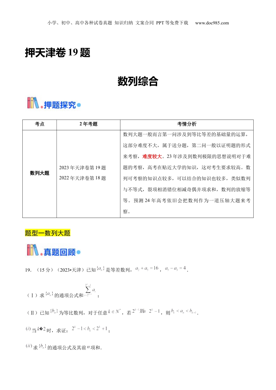 小学、初中、高中各种试卷真题知识归纳文案合同PPT等免费下载www.doc985.com押天津卷19题数列综合考点2年考题考情分析数列大题2023年天津卷第19题2022年天津卷第18题数列大题一般而言第一问涉及到等比等差的基础量的运算,这部分难度不大,属于送分题,第二问一般以证明题的形式来考察,难度较大。23年涉及到数列极限的思想说明对于难题的考察,高考在贴近大学的知识,这对考生要求较高。数列可考察的知识点较多,可以结合的知识也较多,类似数列与不等式,裂项相消错位相减奇偶并项求和,数列的放缩等等。预测24年高考依旧会把数列作为一道压轴大题来考察。题型一数列大题19.(15分)(2023•天津)已知是等差数列,,.(Ⅰ)求的通项公式和;(Ⅱ)已知为等比数列,对于任意,若,则.当时,求证:;求的通项公式及其前项和.小学、初中、高中各种试卷真题知识归纳文案合同PPT等免费下载www.doc985.com【答案】(Ⅰ),.(Ⅱ)证明见解析;,.【分析】(Ⅰ)建立方程组求出首项和公差即可求解.(Ⅱ)根据数列递推关系,利用极限思想分别求出公比和首项,即可得到结论.【解答】解:(Ⅰ)是等差数列,,.,得,,则的通项公式,中的首项为,项数为,则.(Ⅱ),,,即,当时,.,且,即,综上,故成立;成立,小学、初中、高中各种试卷真题知识归纳文案合同PPT等免费下载www.doc985.com为等比数列,设公比为,当时,,,则,即,即,当,,,,时,,,即,即,当,,,则,则,即的通项公式为,则的其前项和.18.(15分)(2022•天津)设是等差数列,是等比数列,且.小学、初中、高中各种试卷真题知识归纳文案合同PPT等免费下载www.doc985.com(1)求与的通项公式;(2)设的前项和为,求证:;(3)求[ak+1﹣(﹣1)kak]bk.【答案】(1)an=2n1﹣,bn=2n1﹣.(2)见证明过程.(3).【分析】(1)设等差数列{an}的公差为d,等比数列{bn}的公比为q,由a1=b1=a2﹣b2=a3﹣b3=1,可得1+d﹣q=1,1+2d﹣q2=1,解得d,q,即可得出an.(2)由等比数列的性质及通项公式与前n项和的关系结合分析法能证明(Sn+1+an+1)bn=Sn+1bn+1﹣Snbn;(3)先求出[]b2k1﹣+[a2k+1﹣(﹣1)2k2k]b2k=2k•4k,利用并项求和,结合错位相减法能求出结果.【解答】解:(1)设等差数列{an}的公差为d,等比数列{bn}的公比为q, a1=b1=a2﹣b2=a3﹣b3=1,∴1+d﹣q=1,1+2d﹣q2=1,解得d=q=2,∴an=1+2(n1﹣)=2n1﹣,bn=2n1﹣.(2)证明: bn+1=2bn≠0,∴要证明(Sn+1+an+1)bn=Sn+1bn+1﹣Snbn,即证明(Sn+1+an+1)bn=2Sn+1•bn﹣Snbn,即证明Sn+1+an+1=2Sn+1﹣Sn,即证明an+1=Sn+1﹣Sn,由数列的通项公式和前n项和的关系得:an+1=Sn+1﹣Sn,∴(Sn+1+an+1)bn=Sn+1bn+1﹣Snbn.小学、初中、高中各种试卷真题知识归纳文案合同PPT等免费下载www.doc985.com(3) []b2k1﹣+[a2k+1﹣(﹣1)2k2k]b2k=(4k1+4﹣k3﹣)×22k2﹣+[4k+1﹣(4k1﹣)]×22k1﹣=2k•4k,∴[ak+1﹣(﹣1)kak]bk={[a2k﹣(﹣1)2k1﹣a2k1﹣]b2k1﹣+[a2k]b2k}=2k•4k,设Tn=.则+…+2n×4n,①∴4Tn=2×42+4×43+6×44+…+2n×4n+1,②①﹣②,得:﹣3Tn=2(4+42+43+44+…+4n)﹣2n•4n+1==,∴Tn=,∴[ak+1﹣(﹣1)kak]bk=.一、公式法(1)等差数列的前n项和小学、初中、高中各种试卷真题知识归纳文案合同PPT等免费下载www.doc985.com(2)等比数列的前n项和(3)一些常见的数列的前n项和:①;②;③;④二、几种数列求和的常用方法(1)分组求和法:一个数列的通项公式是由若干个等差或等比或可求和的数列组成的,则求和时可用分组求和法,分别求和后相加减.(2)并项求和法:一个数列的前n项和中,可两两结合求解,则称之为并项求和.(3)裂项相消法:把数列的通项拆成两项之差,在求和时中间的一些项可以相互抵消,从而求得前n项和.(4)错位相减法:如果一个数列的各项是由一个等差数列和一个等比数列的对应项之积构成的,那么求这个数列的前项和即可用错位相减法求解.(5)倒序相加法:如果一个数列与首末两端等“距离”的两项的和相等或等于同一个常数,那么求...