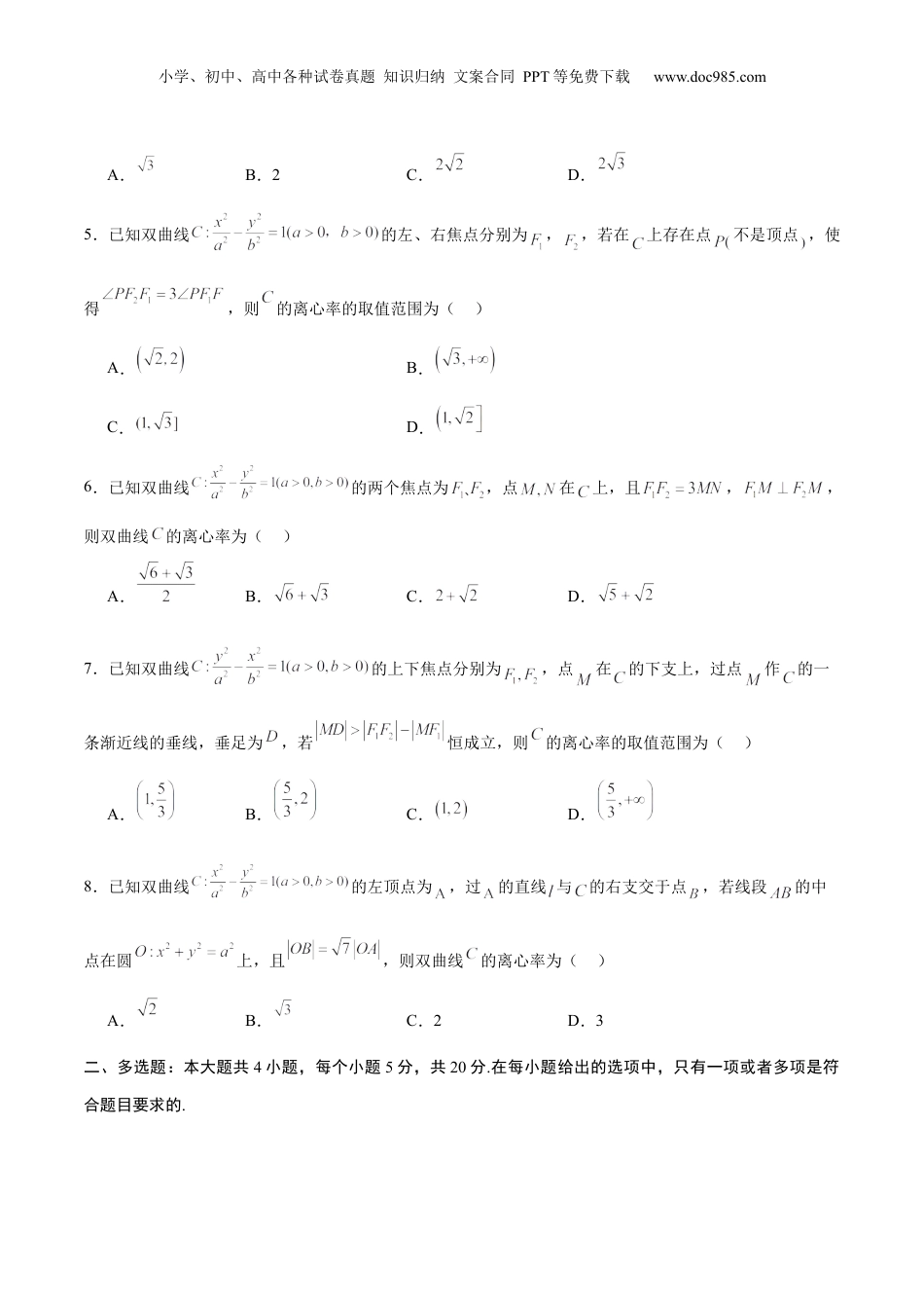 小学、初中、高中各种试卷真题知识归纳文案合同PPT等免费下载www.doc985.com专题12双曲线中的离心率问题限时:120分钟满分:150分一、单选题:本大题共8小题,每个小题5分,共40分.在每小题给出的选项中,只有一项是符合题目要求的.1.设、分别是双曲线的左、右焦点,过作轴的垂线与相交于、两点,若为正三角形,则的离心率为()A.B.C.D.2.若双曲线的一条渐近线被圆所截得的弦长为,则的离心率为()A.B.C.D.3.已知双曲线:(,)的右焦点为,、两点在双曲线的左、右两支上,且,,,且点在双曲线上,则双曲线的离心率为()A.B.C.D.4.如图,双曲线的左、右焦点分别为,,直线过点与双曲线的两条渐近线分别交于两点.若是的中点,且,则此双曲线的离心率为()小学、初中、高中各种试卷真题知识归纳文案合同PPT等免费下载www.doc985.comA.B.2C.D.5.已知双曲线的左、右焦点分别为,,若在上存在点不是顶点,使得,则的离心率的取值范围为()A.B.C.D.6.已知双曲线的两个焦点为,点在上,且,,则双曲线的离心率为()A.B.C.D.7.已知双曲线的上下焦点分别为,点在的下支上,过点作的一条渐近线的垂线,垂足为,若恒成立,则的离心率的取值范围为()A.B.C.D.8.已知双曲线的左顶点为,过的直线与的右支交于点,若线段的中点在圆上,且,则双曲线的离心率为()A.B.C.2D.3二、多选题:本大题共4小题,每个小题5分,共20分.在每小题给出的选项中,只有一项或者多项是符合题目要求的.小学、初中、高中各种试卷真题知识归纳文案合同PPT等免费下载www.doc985.com9.双曲线的离心率为,双曲线的离心率为,则的值不可能是()A.B.C.D.10.双曲线的离心率为e,若过点能作该双曲线的两条切线,则e可能取值为().A.B.C.D.211.已知双曲线的左右焦点分别为、,过点的直线与圆相切,且与交于两点,若,则的离心率可能为()A.B.C.D.12.已知、是双曲线(,)的左、右焦点,过作双曲线一条渐近线的垂线,垂足为点,交另一条渐近线于点,且,则该双曲线的离心率为().A.B.C.D.三、填空题:本大题共4小题,每小题5分,共20分.把答案填在答题卡中的横线上.13.双曲线的一条渐近线方程为,则其离心率是.14.已知双曲线方程为,左焦点关于一条渐近线的对称点在另一条渐近线上,则该双曲线的离心率为.15.已知双曲线的右焦点为,直线与双曲线交于两点,与双曲小学、初中、高中各种试卷真题知识归纳文案合同PPT等免费下载www.doc985.com线的渐近线交于两点,若,则双曲线的离心率是.16.已知双曲线的左、右焦点分别为,双曲线的左顶点为A,以为直径的圆交双曲线的一条渐近线于P,Q两点,其中点Q在y轴右侧,若,则该双曲线的离心率的取值范围是.四、解答题:本大题共6小题,共70分.解答应写出必要的文字说明、证明过程或演算步骤.17.已知,分别为双曲线的左、右焦点,P为双曲线右支上的任意一点,当取最小值时,求双曲线的离心率e的取值范围.18.已知椭圆与双曲线,有相同的左、右焦点,,若点是与在第一象限内的交点,且,设与的离心率分别为,,求的取值范围.小学、初中、高中各种试卷真题知识归纳文案合同PPT等免费下载www.doc985.com19.已知双曲线T:离心率为e,圆O:.(1)若e=2,双曲线T的右焦点为,求双曲线方程;(2)若圆O过双曲线T的右焦点F,圆O与双曲线T的四个交点恰好四等分圆周,求的值;(3)若R=1,不垂直于x轴的直线l:y=kx+m与圆O相切,且l与双曲线T交于点A,B时总有,求离心率e的取值范围.20.已知点是双曲线右支上一点,、是双曲线的左、右焦点,,.(1)求双曲线的离心率;(2)设、分别是△的外接圆半径和内切圆半径,求.21.已知双曲线的左、右焦点分别为,,A为双曲线C左支上一点,小学、初中、高中各种试卷真题知识归纳文案合同PPT等免费下载www.doc985.com.(1)求双曲线C的离心率;(2)设点A关于x轴的对称点为B,D为双曲线C右支上一点,直线与x轴交点的横坐标分别为,且,求双曲线C的方程.22.已知双曲线,若直线与双曲线交于两点,线段的中点为,且(为坐标原点).(1)求双曲线的离心率;(2)若直线不经过双曲线的右顶点,且以为直径的圆经过点,证明直线恒过定点,并求出点的坐标.