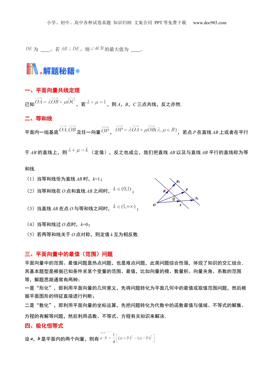 小学、初中、高中各种试卷真题知识归纳文案合同PPT等免费下载www.doc985.com押天津卷14~15题平面向量线性运算、函数性质综合应用考点2年考题考情分析平面向量线性运算2023年天津卷第14题2022年天津卷第14题近两年高考对于平面向量的线性运算考察难度较大,主要考察平面向量基本定理以及平面向量的数量积运算,而且近两年高考对于数量积运算考察时都结合了基本不等式的内容。整体来看综合性较强,难度较大,可以预测24年高考很可能仍会结合基本不等式和数量积运算来考察。函数性质综合应用2023年天津卷第15题2022年天津卷第15题高考对于函数性质的综合考察难度较大,需要考生熟练掌握函数图像与性质,常考察分段函数,零点问题,参数范围问题,考查形式较多,并在解题过程中大多涉及数学中重要的分类讨论思想,整体综合性较强,属于填空压轴题。题型一平面向量线性运算14.(5分)(2023•天津)在中,,,点为的中点,点为的中点,若设,,则可用,表示为;若,则的最大值为.14.(5分)(2022•天津)在中,,,是中点,,试用,表示小学、初中、高中各种试卷真题知识归纳文案合同PPT等免费下载www.doc985.com为,若,则的最大值为.一、平面向量共线定理已知,若,则A,B,C三点共线,反之亦然.二、等和线平面内一组基底及任一向量,,若点P在直线AB上或者在平行于AB的直线上,则(定值),反之也成立,我们把直线AB以及与直线AB平行的直线称为等和线.(1)当等和线恰为直线AB时,k=1;(2)当等和线在O点和直线AB之间时,;(3)当直线AB在点O与等和线之间时,;(4)当等和线过O点时,k=0;(5)若两等和线关于O点对称,则定值k互为相反数.三、平面向量中的最值(范围)问题平面向量中的范围、最值问题是热点问题,也是难点问题,此类问题综合性强,体现了知识的交汇组合.其基本题型是根据已知条件求某个变量的范围、最值,比如向量的模、数量积、向量夹角、系数的范围等,解题思路通常有两种:一是“形化”,即利用平面向量的几何意义,先将问题转化为平面几何中的最值或取值范围问题,然后根据平面图形的特征直接进行判断;二是“数化”,即利用平面向量的坐标运算,先把问题转化为代数中的函数最值与值域、不等式的解集、方程的有解等问题,然后利用函数、不等式、方程有关知识来解决.四、极化恒等式设a,b是平面内的两个向量,则有小学、初中、高中各种试卷真题知识归纳文案合同PPT等免费下载www.doc985.com证明:,①,②将两式相减可得,这个等式在数学上我们称为极化恒等式.①几何解释1(平行四边形模型)以,为一组邻边构造平行四边形,,则,由,得.即“从平行四边形一个顶点出发的两个边向量的数量积是和对角线长与差对角线长平方差的”.②几何解释2(三角形模型)在平行四边形模型结论的基础上,若设M为对角线的交点,则由变形为,得,该等式即是极化恒等式在三角形中的体现,也是我们最常用的极化恒等式的几何模型.注:具有三角几何背景的数学问题利用极化恒等式考虑尤为简单,让“秒杀”向量成为另一种可能;我们从极化恒等式看到向量的数量积可转化为中线长与半底边长的平方差,此恒等式的精妙之处在于建立向量与几何长度(数量)之间的桥梁,实现向量与几何、代数的巧妙结合.五.基本不等式如果a>0,b>0,那么√ab≤a+b2,当且仅当a=b时,等号成立.其中,a+b2叫作a,b的算术平均数,√ab叫作a,b的几何平均数.即正数a,b的算术平均数不小于它们的几何平均数.基本不等式1:若R,则a2+b2≥2ab,当且仅当a=b时取等号;基本不等式2:若R+,则a+b2≥√ab(或a+b≥2√ab),当且仅当a=b时取等号.注:(1)基本不等式的前提是“一正”“二定”“三相等”;其中“一正”指正数,“二定”指求最值时和或积为定值,“三相等”指满足等号成立的条件.(2)连续使用不等式要注意等号取得一致.小学、初中、高中各种试卷真题知识归纳文案合同PPT等免费下载www.doc985.com(1)几个重要的不等式①②基本不等式:如果,则(当且仅当“”时取“”).特例:(同号).(2)其他变形:①(沟通两和与两平方和的不等关系式)②(沟通两积与两平方和的不等关系式)③(沟通两积与两和...