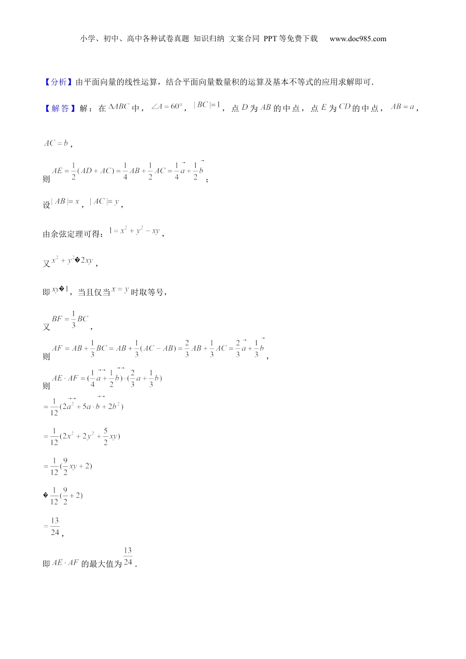 小学、初中、高中各种试卷真题知识归纳文案合同PPT等免费下载www.doc985.com押天津卷14~15题平面向量线性运算、函数性质综合应用考点2年考题考情分析平面向量线性运算2023年天津卷第14题2022年天津卷第14题近两年高考对于平面向量的线性运算考察难度较大,主要考察平面向量基本定理以及平面向量的数量积运算,而且近两年高考对于数量积运算考察时都结合了基本不等式的内容。整体来看综合性较强,难度较大,可以预测24年高考很可能仍会结合基本不等式和数量积运算来考察。函数性质综合应用2023年天津卷第15题2022年天津卷第15题高考对于函数性质的综合考察难度较大,需要考生熟练掌握函数图像与性质,常考察分段函数,零点问题,参数范围问题,考查形式较多,并在解题过程中大多涉及数学中重要的分类讨论思想,整体综合性较强,属于填空压轴题。题型一平面向量线性运算14.(5分)(2023•天津)在中,,,点为的中点,点为的中点,若设,,则可用,表示为;若,则的最大值为.【答案】;.小学、初中、高中各种试卷真题知识归纳文案合同PPT等免费下载www.doc985.com【分析】由平面向量的线性运算,结合平面向量数量积的运算及基本不等式的应用求解即可.【解答】解:在中,,,点为的中点,点为的中点,,,则;设,,由余弦定理可得:,又,即,当且仅当时取等号,又,则,则,即的最大值为.小学、初中、高中各种试卷真题知识归纳文案合同PPT等免费下载www.doc985.com故答案为:;.14.(5分)(2022•天津)在中,,,是中点,,试用,表示为,若,则的最大值为.【答案】;.【分析】由题意,利用两个向量加减法及其几何意义,两个向量的数量积公式,基本不等式,求出的最小值,可得的最大值.【解答】解:中,,,是中点,,如图:.,,,即,即,即,当且仅当时,等号成立,故的最小值为,故的最大值为,即的最大值为,故答案为:;.小学、初中、高中各种试卷真题知识归纳文案合同PPT等免费下载www.doc985.com一、平面向量共线定理已知,若,则A,B,C三点共线,反之亦然.二、等和线平面内一组基底及任一向量,,若点P在直线AB上或者在平行于AB的直线上,则(定值),反之也成立,我们把直线AB以及与直线AB平行的直线称为等和线.(1)当等和线恰为直线AB时,k=1;(2)当等和线在O点和直线AB之间时,;(3)当直线AB在点O与等和线之间时,;(4)当等和线过O点时,k=0;(5)若两等和线关于O点对称,则定值k互为相反数.三、平面向量中的最值(范围)问题平面向量中的范围、最值问题是热点问题,也是难点问题,此类问题综合性强,体现了知识的交汇组合.其基本题型是根据已知条件求某个变量的范围、最值,比如向量的模、数量积、向量夹角、系数的范围等,解题思路通常有两种:一是“形化”,即利用平面向量的几何意义,先将问题转化为平面几何中的最值或取值范围问题,然后根据平面图形的特征直接进行判断;二是“数化”,即利用平面向量的坐标运算,先把问题转化为代数中的函数最值与值域、不等式的解集、方程的有解等问题,然后利用函数、不等式、方程有关知识来解决.小学、初中、高中各种试卷真题知识归纳文案合同PPT等免费下载www.doc985.com四、极化恒等式设a,b是平面内的两个向量,则有证明:,①,②将两式相减可得,这个等式在数学上我们称为极化恒等式.①几何解释1(平行四边形模型)以,为一组邻边构造平行四边形,,则,由,得.即“从平行四边形一个顶点出发的两个边向量的数量积是和对角线长与差对角线长平方差的”.②几何解释2(三角形模型)在平行四边形模型结论的基础上,若设M为对角线的交点,则由变形为,得,该等式即是极化恒等式在三角形中的体现,也是我们最常用的极化恒等式的几何模型.注:具有三角几何背景的数学问题利用极化恒等式考虑尤为简单,让“秒杀”向量成为另一种可能;我们从极化恒等式看到向量的数量积可转化为中线长与半底边长的平方差,此恒等式的精妙之处在于建立向量与几何长度(数量)之间的桥梁,实现向量与几何、代数的巧妙结合.五.基本不等式如果a>0,b>0,那么√ab≤a+b2,当且仅当a=b时,等号成立.其中,a+b2叫作a,b的...
