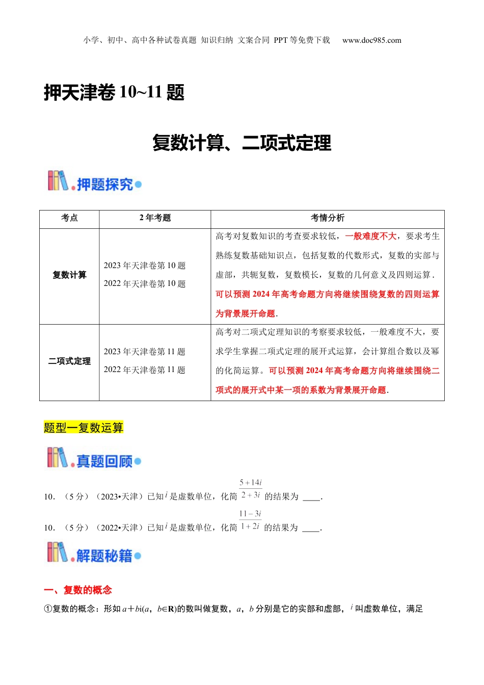 小学、初中、高中各种试卷真题知识归纳文案合同PPT等免费下载www.doc985.com押天津卷10~11题复数计算、二项式定理考点2年考题考情分析复数计算2023年天津卷第10题2022年天津卷第10题高考对复数知识的考查要求较低,一般难度不大,要求考生熟练复数基础知识点,包括复数的代数形式,复数的实部与虚部,共轭复数,复数模长,复数的几何意义及四则运算.可以预测2024年高考命题方向将继续围绕复数的四则运算为背景展开命题.二项式定理2023年天津卷第11题2022年天津卷第11题高考对二项式定理知识的考察要求较低,一般难度不大,要求学生掌握二项式定理的展开式运算,会计算组合数以及幂的化简运算。可以预测2024年高考命题方向将继续围绕二项式的展开式中某一项的系数为背景展开命题.题型一复数运算10.(5分)(2023•天津)已知是虚数单位,化简的结果为.10.(5分)(2022•天津)已知是虚数单位,化简的结果为.一、复数的概念①复数的概念:形如a+bi(a,b∈R)的数叫做复数,a,b分别是它的实部和虚部,叫虚数单位,满足小学、初中、高中各种试卷真题知识归纳文案合同PPT等免费下载www.doc985.com(1)当且仅当b=0时,a+bi为实数;(2)当b≠0时,a+bi为虚数;(3)当a=0且b≠0时,a+bi为纯虚数.其中,两个实部相等,虚部互为相反数的复数互为共轭复数.②两个复数相等(两复数对应同一点)③复数的模:复数的模,其计算公式二、复数的加、减、乘、除的运算法则1、复数运算(1)(2)其中,叫z的模;是的共轭复数.(3).实数的全部运算律(加法和乘法的交换律、结合律、分配律及整数指数幂运算法则)都适用于复数.1.是虚数单位,复数满足,则.2.是虚数单位,复数.3.已知是纯虚数(其中,是虚数单位),则.小学、初中、高中各种试卷真题知识归纳文案合同PPT等免费下载www.doc985.com4.是虚数单位,复数,则的虚部为.5.为虚数单位,复数,则.6.是虚数单位,复数.7.是复数单位,化简的结果为.8.已知是虚数单位,化简的结果为.9.已知复数(其中为虚数单位),则.10.设为虚数单位,若复数满足.则.11.若复数满足(其中是虚数单位),则的虚部为.12.若复数,则.13.已知复数满足.(其中为虚数单位),则复数的虚部为.14.复数满足,则.15.若,则.题型二二项式定理11.(5分)(2023•天津)在的展开式中,项的系数为.11.(5分)(2022•天津)的展开式中的常数项为.小学、初中、高中各种试卷真题知识归纳文案合同PPT等免费下载www.doc985.com1.二项式定理二项式定理(a+b)n=Can+Can-1b1+…+Can-kbk+…+Cbn(n∈N*)二项展开式的通项Tk+1=Can-kbk,它表示展开式的第k+1项二项式系数C(k=0,1,…,n)2.二项式系数的性质(1)对称性:与首末两端“等距离”的两个二项式系数相等.(2)增减性与最大值:当n是偶数时,中间的一项取得最大值;当n是奇数时,中间的两项与相等,且同时取得最大值.(3)各二项式系数的和:(a+b)n的展开式的各二项式系数的和等于2n.常用结论1.两个常用公式(1)C+C+C+…+C=2n.(2)C+C+C+…=C+C+C+…=2n-1.2.二项展开式的三个重要特征(1)字母a的指数按降幂排列由n到0.(2)字母b的指数按升幂排列由0到n.(3)每一项字母a的指数与字母b的指数的和等于n.1.若的展开式中常数项为,则.2.的展开式中项的系数是.(用数字作答)3.在的展开式中,常数项为(请用数字作答)4.在的展开式中,的系数是.小学、初中、高中各种试卷真题知识归纳文案合同PPT等免费下载www.doc985.com5.若的展开式中的系数为160,则实数的值为.6.已知二项式,则其展开式中含的项的系数为.7.在的二项展开式中,的系数为(请用数字作答).8.的展开式中的系数为.9.若在的展开式中,的系数为.(用数字作答)10.的二项展开式中的常数项为.