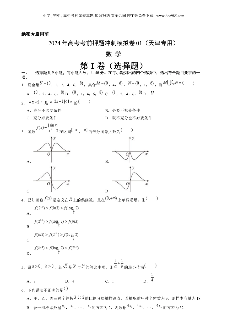 小学、初中、高中各种卷真知文案合同试题识归纳PPT等免下费载www.doc985.com绝密★启用前2024年高考考前押题冲刺模拟卷01(天津专用)数学第Ⅰ卷(选择题)一、选择题共9小题,每小题5分,共45分。在每小题列出的四个选项中,选出符合题目要求的一项。1.设全集,1,2,4,6,,集合,4,,,1,,则A.,2,4,6,B.,1,4,6,C.,2,4,6,D.2.“”是“”的A.充分不必要条件B.必要不充分条件C.充分必要条件D.既不充分也不必要条件3.函数在区间,的部分图象大致为A.B.C.D.4.已知函数是定义在上的偶函数,且在上单调递增,则A.B.C.D.5.设,.若是与的等比中项,则的最小值为A.8B.4C.1D.6.下列说法不正确的是A.甲、乙、丙三种个体按的比例分层抽样调查,若抽取的甲种个体数为9,则样本容量为18B.设一组样本数据,,,的方差为2,则数据,,,的方差为32小学、初中、高中各种卷真知文案合同试题识归纳PPT等免下费载www.doc985.comC.在一个列联表中,计算得到的值,则的值越接近1,可以判断两个变量相关的把握性越大D.已知随机变量,且,则7.已知双曲线的一条渐近线方程是,它的一个焦点在抛物线的准线上,则双曲线的方程为A.B.C.D.8.如图,在正四棱柱中,是侧棱上一点,且.设三棱锥的体积为,正四棱柱的体积为,则的值为A.B.C.D.9.已知函数,的最小正周期为,为了得到函数的图象,只要将的图象A.向左平移个单位长度B.向右平移个单位长度C.向左平移个单位长度D.向右平移个单位长度第Ⅱ卷(非选择题)二、填空题共6小题,每小题5分,共30分.10.若为虚数单位,则.11.的二项展开式中的常数项为.66666666666612.假设某市场供应的灯泡中,甲厂产品占,乙厂产品占,甲厂产品的合格率是,乙厂产品的合格率是,在该市场中随机购买一个灯泡,是合格品的概率为;如果买到的灯泡是合格品,那么它是甲厂产品的概率为.小学、初中、高中各种卷真知文案合同试题识归纳PPT等免下费载www.doc985.com13.若圆与圆的公共弦的长为,则.14.已知平行四边形的面积为,,,为线段的中点,若为线段上的一点,且,则;的值为.15.设函数,对任意,,恒成立,则实数的取值范围是.三、解答题共5小题,共75分.解答应写出文字说明,演算步骤或证明过程.16.在中,内角,,的对边分别为,,,若,,(1)求的值;(2)求的值.17.三棱台中,若面,,,,,分别是,中点.(Ⅰ)求证:平面;(Ⅱ)求二面角的正弦值;(Ⅲ)求点到平面的距离.18.已知等差数列的前项和为,且,,数列的前项和为,且.(1)求数列,的通项公式;(2)设,数列的前项和为,求;(3)设,求数列的前项和.19.已知椭圆的离心率,且点,在椭圆上.(1)求椭圆的方程;(2)若椭圆的左焦点为,右顶点为,点,是椭圆上的动点,直线与轴交于点,点是轴上一点,,与椭圆交于点,若的面积为,求直线的方程.小学、初中、高中各种卷真知文案合同试题识归纳PPT等免下费载www.doc985.com20.已知函数,.(1)设,求函数的单调增区间;(2)设,求证:存在唯一的,使得函数的图象在点,处的切线与函数的图象也相切;(3)求证:对任意给定的正数,总存在正数,使得不等式成立.