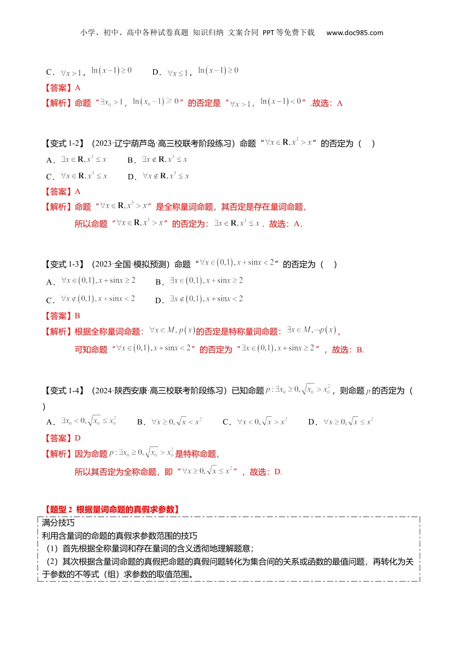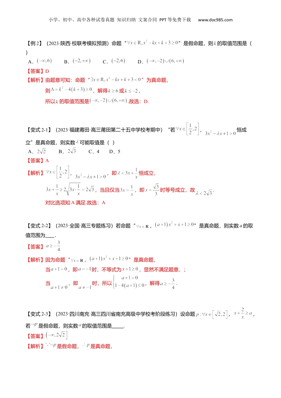 小学、初中、高中各种试卷真题知识归纳文案合同PPT等免费下载www.doc985.com热点1-2常用逻辑用语与一元二次不等式恒(能)成立常用逻辑用语是高考数学的重要考点,常见考查真假命题的判断;全称量词、特称量词命题以及命题的否定;偶尔涉及充分条件与必要条件以及根据描述进行逻辑推理等,中等偏易难度。但一般很少单独考考查,常与函数、不等式、数列、三角函数、立体几何等交汇,热点是“充要条件”,考生复习时需多注意这方面。不等式是高考数学的重要内容。其中,“含参不等式恒成立与能成立问题”把不等式、函数、三角、几何等内容有机地结合起来,其以覆盖知识点多、综合性强、解法灵活等特点备受高考命题者的青睐。【题型1含有一个量词命题的否定】满分技巧对全称(存在)量词命题进行否定的方法全称(存在)量词命题的否定与命题的否定有一定的区别,否定全称量词命题和存在量词命题时:(1)改写量词,全称量词改写为存在量词,存在量词改写为全称量词;(2)否定结论,而一般命题的否定只需直接否定结论即可.【注意】对于省略量词的命题,应先挖掘命题中的隐含的量词,改写成含量词的完整形式,再写出命题的否定.【例1】(2023·四川成都·统考二模)命题“,”的否定是()A.,B.,C.,D.,【答案】A【解析】根据全称命题的否定为特称命题知:命题“,”的否定是“,,”故选:A.【变式1-1】(2023·山东青岛·高三青岛二中校考期中)命题“,”的否定是()A.,B.,小学、初中、高中各种试卷真题知识归纳文案合同PPT等免费下载www.doc985.comC.,D.,【答案】A【解析】命题“,”的否定是“,”.故选:A【变式1-2】(2023·辽宁葫芦岛·高三校联考阶段练习)命题“”的否定为()A.B.C.D.【答案】A【解析】命题“”是全称量词命题,其否定是存在量词命题,所以命题“”的否定为:.故选:A.【变式1-3】(2023·全国·模拟预测)命题“”的否定为()A.B.C.D.【答案】B【解析】根据全称量词命题:的否定是特称量词命题:,可知命题“”的否定为“”,故选:B.【变式1-4】(2024·陕西安康·高三校联考阶段练习)已知命题,则命题的否定为()A.B.C.D.【答案】D【解析】因为命题是特称命题,所以其否定为全称命题,即“”,故选:D.【题型2根据量词命题的真假求参数】满分技巧利用含量词的命题的真假求参数范围的技巧(1)首先根据全称量词和存在量词的含义透彻地理解题意;(2)其次根据含量词命题的真假把命题的真假问题转化为集合间的关系或函数的最值问题,再转化为关于参数的不等式(组)求参数的取值范围。小学、初中、高中各种试卷真题知识归纳文案合同PPT等免费下载www.doc985.com【例2】(2023·陕西·校联考模拟预测)命题“”是假命题,则的取值范围是()A.B.C.D.【答案】D【解析】由题意可知:命题“”为真命题,则,解得或,所以的取值范围是.故选:D.【变式2-1】(2023·福建莆田·高三莆田第二十五中学校考期中)“若,恒成立”是真命题,则实数可能取值是()A.B.C.4D.5【答案】A【解析】,,即恒成立,,当且仅当,即时等号成立,故.对比选项知A满足.故选:A【变式2-2】(2023·全国·高三专题练习)若命题“,”是真命题,则实数a的取值范围为.【答案】【解析】因为命题“,”是真命题,当,即时,不等式为,显然不满足题意,;当,即时,所以,解得.【变式2-3】(2023·四川南充·高三四川省南充高级中学校考阶段练习)设命题,,若是假命题,则实数的取值范围是.【答案】【解析】是假命题,是真命题,小学、初中、高中各种试卷真题知识归纳文案合同PPT等免费下载www.doc985.com,,,,当时,,当且仅当时,即时,等号成立,,可取到,,.【变式2-4】(2023·江西鹰潭·贵溪市实验中学校考模拟预测)若命题:“,”是假命题,则的取值范围是.【答案】【解析】因为命题:“,”是假命题,所以命题“”是真命题,若,即或,当时,不等式为,恒成立,满足题意;当时,不等式为,不恒成立,不满足题意;当时,则需要满足,即,解得,综上所述,的取值范围是.【题型3充分与必要条件的判断】满分技巧充分、必要条件的三种判断方...