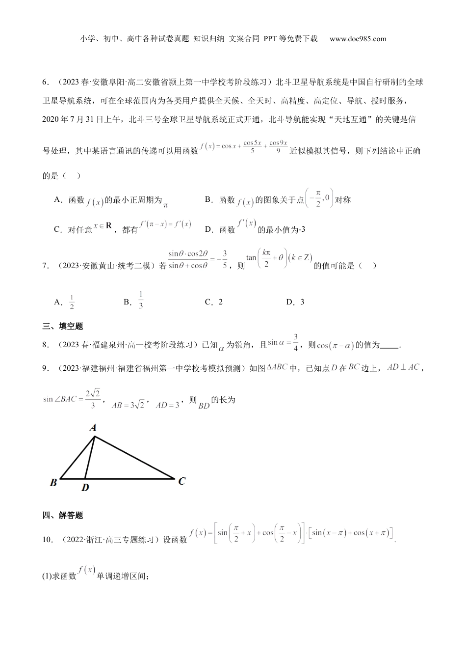 小学、初中、高中各种试卷真题知识归纳文案合同PPT等免费下载www.doc985.com第18课三角函数的诱导公式(分层专项精练)【一层练基础】一、单选题1.(2023秋·高一课时练习)若,则()A.B.C.D.2.(2022·陕西西安·西安中学校考模拟预测)若,则实数的值为()A.B.C.D.3.(2023·山东青岛·山东省青岛第五十八中学校考一模)已知为锐角,且,则()A.B.C.D.4.(2023·全国·高三专题练习)若是纯虚数,则的值为()A.B.C.D.二、多选题5.(2023·全国·高三专题练习)下列各式的值为的是().A.sinB.sincosC.D.小学、初中、高中各种试卷真题知识归纳文案合同PPT等免费下载www.doc985.com6.(2023春·安徽阜阳·高二安徽省颍上第一中学校考阶段练习)北斗卫星导航系统是中国自行研制的全球卫星导航系统,可在全球范围内为各类用户提供全天候、全天时、高精度、高定位、导航、授时服务,2020年7月31日上午,北斗三号全球卫星导航系统正式开通,北斗导航能实现“天地互通”的关键是信号处理,其中某语言通讯的传递可以用函数近似模拟其信号,则下列结论中正确的是()A.函数的最小正周期为B.函数的图象关于点对称C.对任意,都有D.函数的最小值为-37.(2023·安徽黄山·统考二模)若,则的值可能是()A.B.C.2D.3三、填空题8.(2023春·福建泉州·高一校考阶段练习)已知为锐角,且,则的值为.9.(2023·福建福州·福建省福州第一中学校考模拟预测)如图中,已知点在边上,,,,,则的长为四、解答题10.(2022·浙江·高三专题练习)设函数.(1)求函数单调递增区间;小学、初中、高中各种试卷真题知识归纳文案合同PPT等免费下载www.doc985.com(2)求函数在区间上的最值.【二层练综合】一、单选题1.(2023·全国·高三专题练习)若,,则等于()A.B.C.D.二、多选题2.(2023春·广东广州·高二执信中学校考阶段练习)已知函数()A.为的周期B.对于任意,函数都满足C.函数在上单调递减D.的最小值为三、填空题3.(2023·全国·高三专题练习)已知,,,均为锐角,则.四、解答题4.(2023·全国·高三专题练习)已知的内角,,的对边分别为,,.若.(1)求角;(2)若,求边上的高的取值范围.【三层练能力】一、多选题小学、初中、高中各种试卷真题知识归纳文案合同PPT等免费下载www.doc985.com1.(2023·全国·高三专题练习)已知函数,其中是自然对数的底数,下列说法中,正确的是()A.在是增函数B.是奇函数C.在上有两个极值点D.设,则满足的正整数的最小值是二、填空题2.(2022·全国·高三专题练习)已知函数,数列中,,则数列的前100项之和.