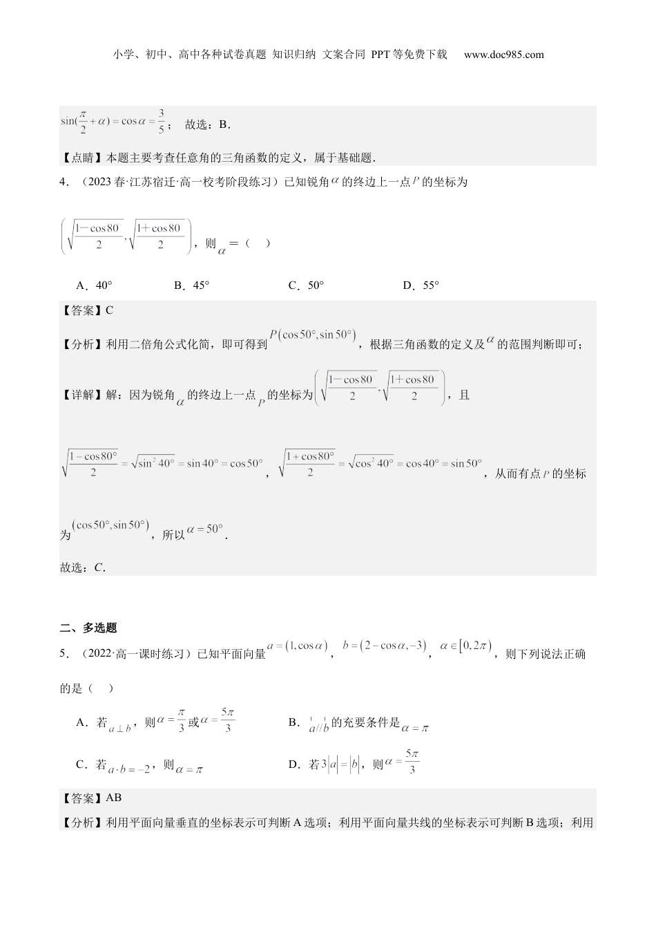 小学、初中、高中各种试卷真题知识归纳文案合同PPT等免费下载www.doc985.com第16课任意角的三角函数(分层专项精练)【一层练基础】一、单选题1.(2023秋·福建福州·高一福建省福州第一中学校考期末)已知角终边经过点,若,则()A.B.C.D.【答案】C【分析】根据三角函数的定义,列出方程,即可求解.【详解】由题意,角终边经过点,可得,又由,根据三角函数的定义,可得且,解得.故选:C.2.(2023·全国·高三专题练习)已知角的大小如图所示,则()A.B.5C.D.【答案】A小学、初中、高中各种试卷真题知识归纳文案合同PPT等免费下载www.doc985.com【分析】由图中的信息可知,化简即可.【详解】由图可知,,;故选:A.3.(2023春·北京·高一校考期中)如图,角以为始边,它的终边与单位圆相交于点,且点的横坐标为,则的值为()A.B.C.D.【答案】B【分析】由题意利用任意角的三角函数的定义,求得的值.【详解】角以为始边,它的终边与单位圆相交于点,且点的横坐标为,所以则小学、初中、高中各种试卷真题知识归纳文案合同PPT等免费下载www.doc985.com;故选:B.【点睛】本题主要考查任意角的三角函数的定义,属于基础题.4.(2023春·江苏宿迁·高一校考阶段练习)已知锐角的终边上一点的坐标为,则=()A.40°B.45°C.50°D.55°【答案】C【分析】利用二倍角公式化简,即可得到,根据三角函数的定义及的范围判断即可;【详解】解:因为锐角的终边上一点的坐标为,且,,从而有点的坐标为,所以.故选:C.二、多选题5.(2022·高一课时练习)已知平面向量,,,则下列说法正确的是()A.若,则或B.的充要条件是C.若,则D.若,则【答案】AB【分析】利用平面向量垂直的坐标表示可判断A选项;利用平面向量共线的坐标表示可判断B选项;利用小学、初中、高中各种试卷真题知识归纳文案合同PPT等免费下载www.doc985.com平面向量数量积的坐标运算可判断C选项;利用平面向量的模长公式可判断D选项.【详解】对于A,若,则,解得,因为,所以或,故A正确;对于B,若,则,解得或(舍去),因为,所以,即,当时,,,,则,即,故B正确;对于C,若,则,解得,因为,所以,故C错误;对于D,若,则,整理得,解得或,因为,所以或或,故D错误.故选:AB.6.(2023秋·高一课时练习)在平面直角坐标系中,角顶点在原点,以正半轴为始边,终边经过点,则下列各式的值恒大于0的是()A.B.C.D.【答案】AB【分析】根据角终边经过点,结合三角函数的定义可以判断角的正弦、余弦、正切的正负性,对四个选项逐一判断即可选出正确答案.【详解】由题意知角在第四象限,所以,,.小学、初中、高中各种试卷真题知识归纳文案合同PPT等免费下载www.doc985.com选项A,;选项B,;选项C,;选项D,符号不确定.故选:AB.7.(2023·全国·高三专题练习)已知角的终边与单位圆交于点,则()A.B.C.D.【答案】AC【分析】点代入单位圆的方程求出点可得,再由弦化切可得答案.【详解】角的终边与单位圆交于点,,,,当时,;当时,.故选:AC.三、填空题8.(2023春·四川泸州·高一四川省泸县第四中学校考阶段练习)在平面直角坐标系中,点绕着原点顺时针旋转得到点,点的横坐标为.【答案】【分析】根据三角函数定义求得,确定与x轴正半轴的夹角为,结合三角函数定义以及两角差的余弦公式即可求得答案.小学、初中、高中各种试卷真题知识归纳文案合同PPT等免费下载www.doc985.com【详解】由题意得,设与x轴正半轴的夹角为,则,则与x轴正半轴的夹角为,故点的横坐标为,故答案为:9.(2020秋·江苏泰州·高三江苏省姜堰第二中学校考阶段练习)欧拉公式(为虚数单位)是由瑞士著名数学家欧拉发明的,它将指数函数的定义域扩大到复数,建立了三角函数和指数函数的关系,它不仅出现在数学分析里,而且在复变函数论里也占有非常重要的地位,被誉为“数学中的天桥”.根据欧拉公式可知,表示的复数在复平面中位于第象限.【答案】三【分析】由欧拉公式可得,则表示的复数在复平面中对应的点为.判断点所在的象限,即得答案.【详解】由欧拉公式可得,则表示的复数在复平面中对应的点为....