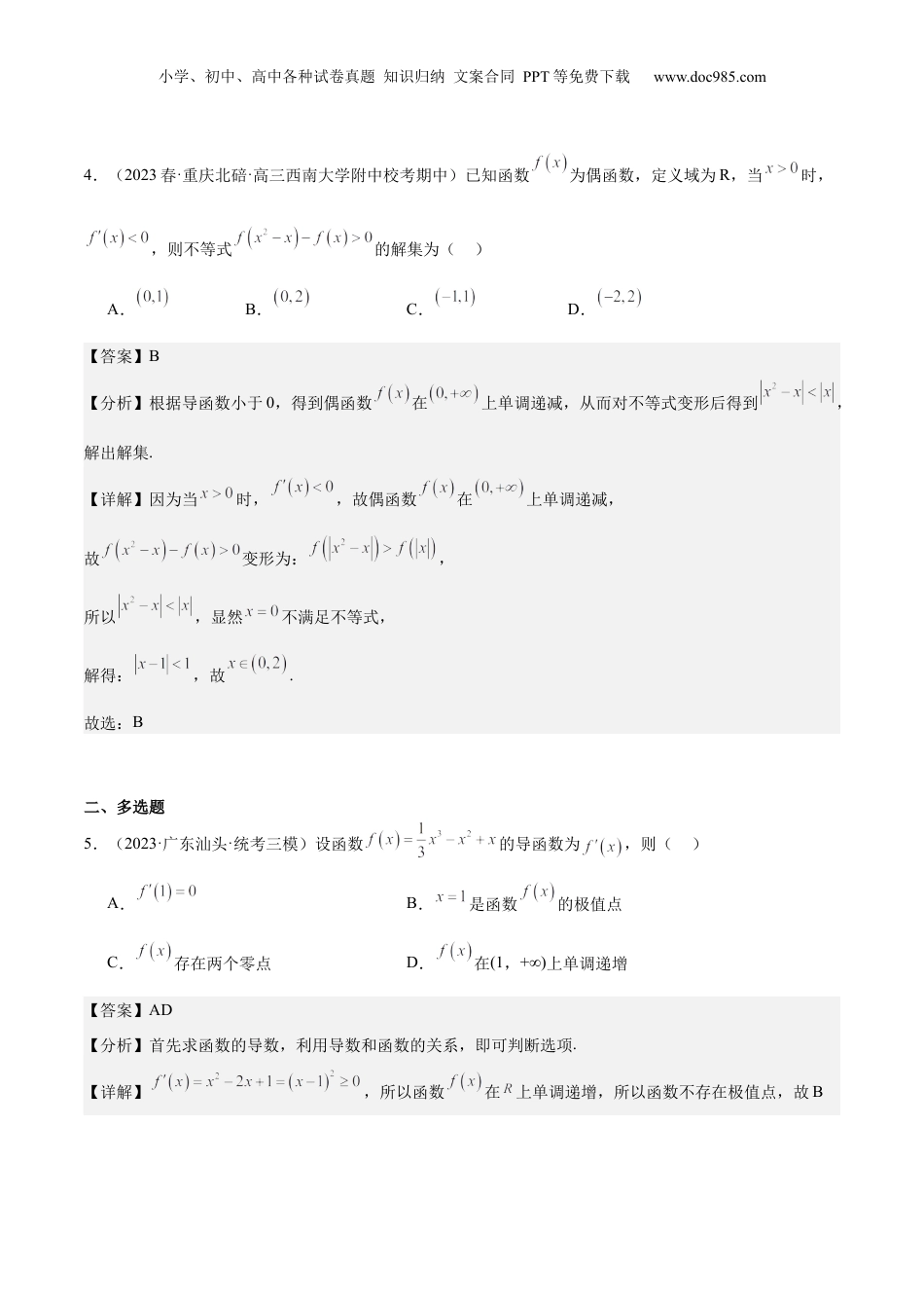 小学、初中、高中各种试卷真题知识归纳文案合同PPT等免费下载www.doc985.com第13课导数与函数的单调性(分层专项精练)【一层练基础】一、单选题1.(2023春·广东东莞·高二东莞实验中学校考阶段练习)对任意的,当时,恒成立,则实数的取值范围是()A.B.C.D.【答案】C【分析】将不等式等价变形,构造函数,再借助函数单调性、最值求解作答.【详解】依题意,,令,,则对任意的,当时,,即有函数在上单调递减,因此,,,而,则,所以实数的取值范围是.故选:C2.(2023·全国·高三专题练习)已知是定义在R上的偶函数,当时,,则不等式的解集是()A.B.C.D.【答案】D小学、初中、高中各种试卷真题知识归纳文案合同PPT等免费下载www.doc985.com【分析】利用导函数证明在单调递增,再根据奇偶性和单调性解不等式即可.【详解】当时,,因为,所以恒成立,所以在单调递增,又因为是定义在R上的偶函数,所以在单调递减,所以,所以由可得,解得,故选:D.3.(2023春·河南开封·高二校考期中)若函数在区间上单调递增,则的取值范围是()A.B.C.D.【答案】B【分析】先求导数,利用在上恒成立,分离参数进行求解.【详解】,因为在区间上单调递增,所以在上恒成立,即在上恒成立,因为二次函数的图象的对称轴为,且开口向上所以的最小值为1,所以.故选:B.小学、初中、高中各种试卷真题知识归纳文案合同PPT等免费下载www.doc985.com4.(2023春·重庆北碚·高三西南大学附中校考期中)已知函数为偶函数,定义域为R,当时,,则不等式的解集为()A.B.C.D.【答案】B【分析】根据导函数小于0,得到偶函数在上单调递减,从而对不等式变形后得到,解出解集.【详解】因为当时,,故偶函数在上单调递减,故变形为:,所以,显然不满足不等式,解得:,故.故选:B二、多选题5.(2023·广东汕头·统考三模)设函数的导函数为,则()A.B.是函数的极值点C.存在两个零点D.在(1,+∞)上单调递增【答案】AD【分析】首先求函数的导数,利用导数和函数的关系,即可判断选项.【详解】,所以函数在上单调递增,所以函数不存在极值点,故B小学、初中、高中各种试卷真题知识归纳文案合同PPT等免费下载www.doc985.com错误,D正确;,故A正确;,得,中,,所以恒成立,即方程只有一个实数根,即,故C错误.故选:AD6.(2023·全国·高三专题练习)已知函数,则()A.在单调递增B.有两个零点C.曲线在点处切线的斜率为D.是奇函数【答案】AC【分析】利用导数研究函数的单调性,结合单调性即可判断零点个数,根据导数的几何意义,以及奇偶性的定义,对每个选项进行逐一分析,即可判断和选择.【详解】对A:,定义域为,则,由都在单调递增,故也在单调递增,又,故当时,,单调递减;当时,,单调递增;故A正确;对B:由A知,在单调递减,在单调递增,又,故只有一个零点,B错误;对C:,根据导数几何意义可知,C正确;对D:定义域为,不关于原点对称,故是非奇非偶函数,D错误.小学、初中、高中各种试卷真题知识归纳文案合同PPT等免费下载www.doc985.com故选:AC.三、填空题7.(2023春·河北石家庄·高二河北新乐市第一中学校考阶段练习)已知函数,则不等式的解集是.【答案】【分析】由定义可判断函数的奇偶性,求导可得其单调性,从而可求解不等式.【详解】因为函数,所以,即函数为奇函数,且,则函数为增函数,则不等式等价于,即,解得,所以不等式的解集为.故答案为:8.(2023·安徽宣城·统考二模)已知函数,则不等式的解集是.【答案】【分析】令,判断的奇偶性与单调性,则问题转化为,即,即可得到自变量的不等式,解得即可.【详解】因为,令,则,小学、初中、高中各种试卷真题知识归纳文案合同PPT等免费下载www.doc985.com则函数为偶函数,又,当时,,,所以,所以在上单调递增,又,由可得,即,即,所以,解得,即不等式的解集是.故答案为:9.(2023秋·宁夏银川·高三银川一中校考阶段练习)已知函数,则不等式的解集为.【答案】【分析】先根据函数特点构造,得到其奇偶性和单调性,再对不等式变形得到,根据单调性得到,解不等式求出答案.【详解】令,定义域...