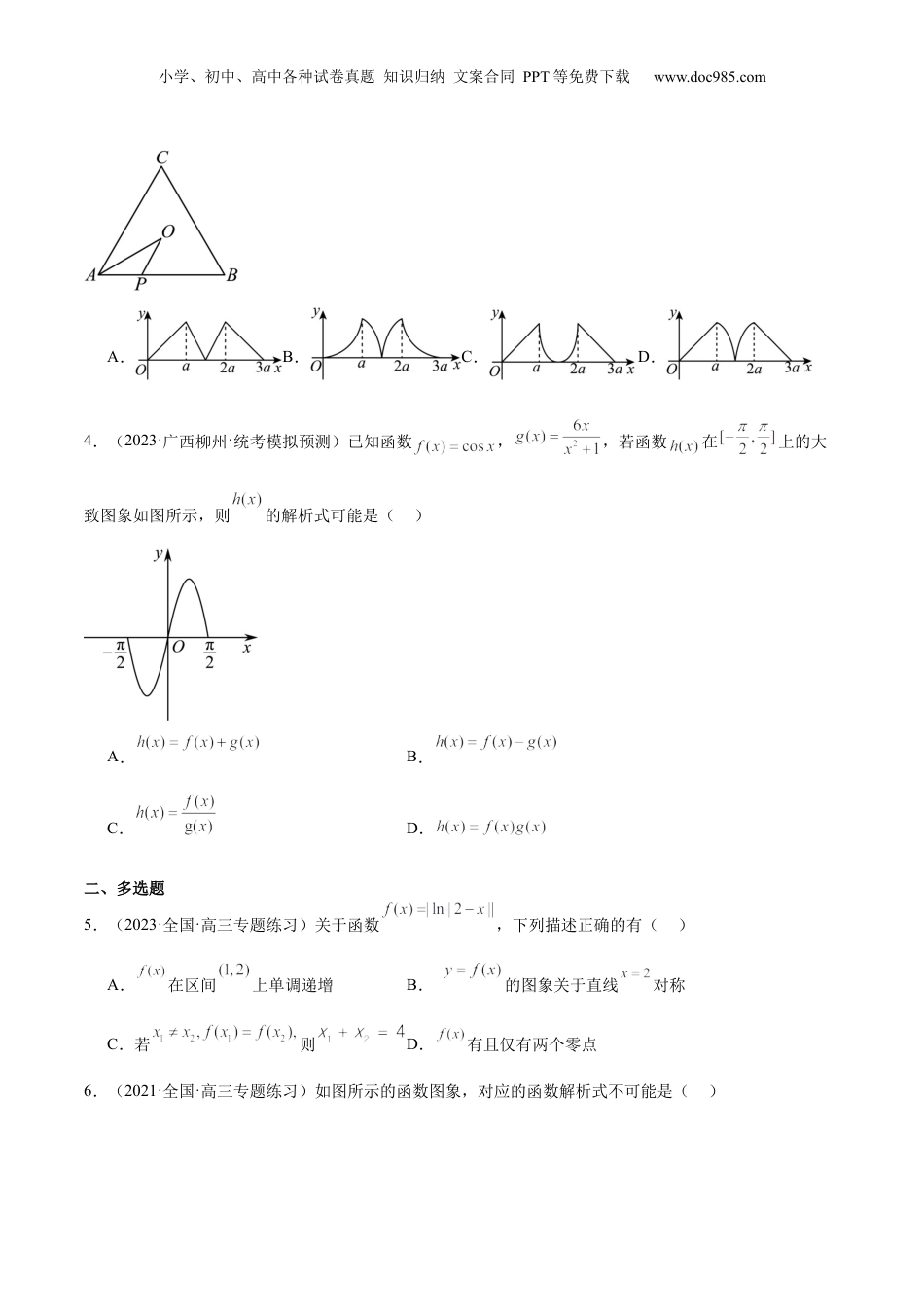 小学、初中、高中各种试卷真题知识归纳文案合同PPT等免费下载www.doc985.com第10课函数图象(分层专项精练)【一层练基础】一、单选题1.(2021·天津·统考高考真题)函数的图像大致为()A.B.C.D.2.(2023·四川泸州·四川省泸县第一中学校考二模)已知函数,则()A.在上单调递增B.的图象关于点对称C.为奇函数D.的图象关于直线对称3.(2022秋·黑龙江齐齐哈尔·高一齐齐哈尔市第一中学校校考期中)如图所示,点从点出发,按逆时针方向沿边长为的正三角形运动一周,为△的中心,设点走过的路程为,△的面积为(当、、三点共线时,记面积为0),则函数的图象大致为()小学、初中、高中各种试卷真题知识归纳文案合同PPT等免费下载www.doc985.comA.B.C.D.4.(2023·广西柳州·统考模拟预测)已知函数,,若函数在上的大致图象如图所示,则的解析式可能是()A.B.C.D.二、多选题5.(2023·全国·高三专题练习)关于函数,下列描述正确的有()A.在区间上单调递增B.的图象关于直线对称C.若则D.有且仅有两个零点6.(2021·全国·高三专题练习)如图所示的函数图象,对应的函数解析式不可能是()小学、初中、高中各种试卷真题知识归纳文案合同PPT等免费下载www.doc985.comA.B.C.D.【二层练综合】一、单选题1.(2023·江西南昌·南昌市八一中学校考三模)函数在上的图像大致为()A.B.C.D.2.(2022秋·宁夏·高三六盘山高级中学校考期中)定义在上的函数满足,,当时,,则方程在上解的个数为()A.3B.4C.5D.63.(2023·全国·高三专题练习)已知函数满足对任意恒成立,又函数的图象关于点对称,且则()A.B.C.D.4.(2022秋·河南·高一校联考阶段练习)若函数的大致图象如图,则的解析式可能是()小学、初中、高中各种试卷真题知识归纳文案合同PPT等免费下载www.doc985.comA.B.C.D.二、填空题5.(2011·江苏南京·统考一模)如图放置的等腰直角薄片,沿x轴滚动,设顶点的轨迹方程是,则在其相邻两个零点间的图象与x轴所围区域的面积为.6.(2023·全国·高三专题练习)定义在上函数满足,且当时,.若当时,,则的最小值等于.【三层练能力】一、单选题1.(2023·全国·高三专题练习)已知函数,若函数与的图象恰有5个不同公共点,则实数a的取值范围是()A.B.小学、初中、高中各种试卷真题知识归纳文案合同PPT等免费下载www.doc985.comC.D.二、多选题2.(2023春·云南红河·高二开远市第一中学校校考阶段练习)已知,若存在,使得,则下列结论正确的有()A.实数的取值范围为B.C.D.的最大值为三、填空题3.(2023·北京海淀·中关村中学校考三模)已知函数是定义域为R的偶函数,当时,,若关于x的方程有且仅有7个不同实数根,则