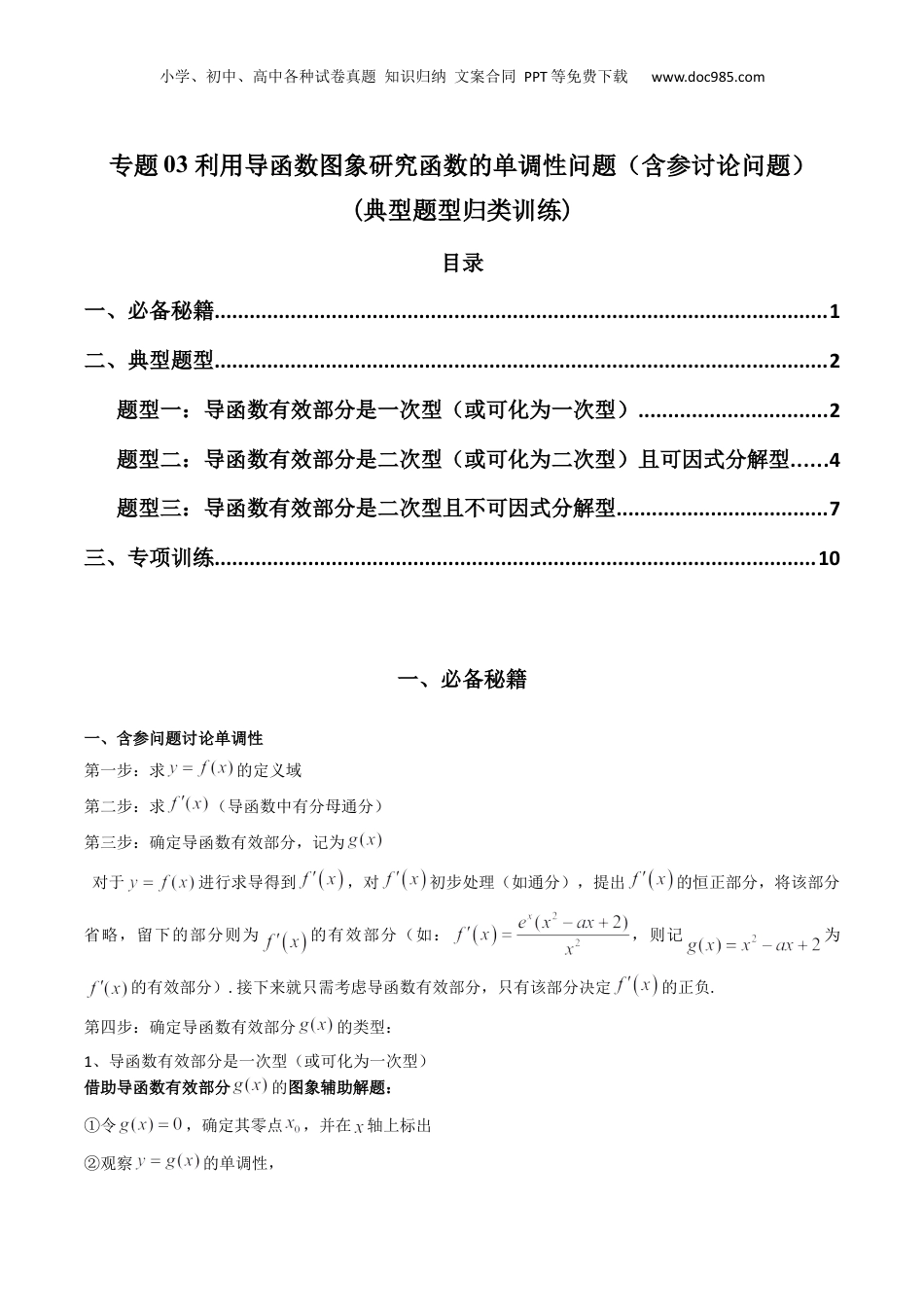 小学、初中、高中各种试卷真题知识归纳文案合同PPT等免费下载www.doc985.com专题03利用导函数图象研究函数的单调性问题(含参讨论问题)(典型题型归类训练)目录一、必备秘籍.........................................................................................................1二、典型题型.........................................................................................................2题型一:导函数有效部分是一次型(或可化为一次型)................................2题型二:导函数有效部分是二次型(或可化为二次型)且可因式分解型......4题型三:导函数有效部分是二次型且不可因式分解型....................................7三、专项训练.......................................................................................................10一、必备秘籍一、含参问题讨论单调性第一步:求的定义域第二步:求(导函数中有分母通分)第三步:确定导函数有效部分,记为对于进行求导得到,对初步处理(如通分),提出的恒正部分,将该部分省略,留下的部分则为的有效部分(如:,则记为的有效部分).接下来就只需考虑导函数有效部分,只有该部分决定的正负.第四步:确定导函数有效部分的类型:1、导函数有效部分是一次型(或可化为一次型)借助导函数有效部分的图象辅助解题:①令,确定其零点,并在轴上标出②观察的单调性,小学、初中、高中各种试卷真题知识归纳文案合同PPT等免费下载www.doc985.com③根据①②画出草图2、导函数有效部分是二次型(或可化为二次型)且可因式分解型借助导函数有效部分的图象辅助解题:①对因式分解,令,确定其零点,并在轴上标出这两个零点②观察的开口方向,③根据①②画出草图3、导函数有效部分是二次型(或可化为二次型)且不可因式分解型①对,求②分类讨论③对于,利用求根公式求的两根,④判断两根,是否在定义域内:对称轴+端点正负⑤画出草图二、含参问题讨论单调性的原则1、最高项系数含参,从0开始讨论2、两根大小不确定,从两根相等开始讨论3、考虑根是否在定义域内二、典型题型题型一:导函数有效部分是一次型(或可化为一次型)1.(2024·全国·高三专题练习)已知函数,讨论的单调性.【答案】答案见解析.【详解】由函数,可得,设,可得,①当时,恒成立,所以在单调递增;②当时,令,解得,此时单调递增,令,解得,此时单调递减,综上,当时,在单调递增;当时,在单调递减,在单调递增.小学、初中、高中各种试卷真题知识归纳文案合同PPT等免费下载www.doc985.com2.(2023·全国·高三专题练习)已知函数,讨论的单调性.【答案】答案见解析;【详解】由题可知的定义域为,,当时,,函数在上单调递减;当时,令得,∴当时,,当时,,∴在上单调递减,在上单调递增;综上,当时,函数在上单调递减;当时,在上单调递减,在上单调递增.3.(2023上·四川成都·高三成都外国语学校校考开学考试)已知函数,(1)当时,求的最值;(2)求的单调区间.【答案】(1),无最大值.(2)答案见解析【详解】(1)当时定义域为,则,所以当时,当时,所以在上单调递减,在上单调递增,所以在处取得极小值即最小值,即,无最大值.(2)定义域为,且,当时恒成立,所以在上单调递减,当时,令解得,令,解得,所以在上单调递减,在上单调递增,综上可得:当时在上单调递堿;当时在上单调递减,在上单调递增.4.(2022上·湖南邵阳·高二统考期末)设函数.(1)若曲线在点处的切线方程为,求;小学、初中、高中各种试卷真题知识归纳文案合同PPT等免费下载www.doc985.com(2)求函数的单调区间.【答案】(1)(2)答案见解析【详解】(1)由于切点在切线上,所以,函数通过点又,根据导数几何意义,;(2)由可知当时,则;当时,则;当时,的单调递减区间为,单调递增区间为当时,单调递增区间为,单调递减区间为.题型二:导函数有效部分是二次型(或可化为二次型)且可因式分解型1.(2024·全国·高三专题练习)已知函数,,讨论的单调区间.【答案】答案见解析【详解】的定义域为,,若,当时,,单调递...