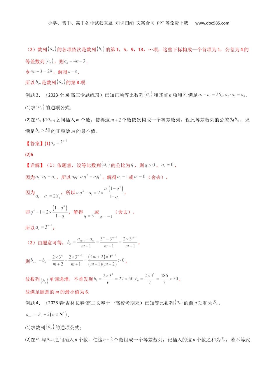 小学、初中、高中各种试卷真题知识归纳文案合同PPT等免费下载www.doc985.com专题10数列求和(插入新数列混合求和)(典型题型归类训练)目录一、典型题型........................................................1题型一:插入新数列构成等差.......................................1题型二:插入新数列构成等比.......................................5题型三:插入新数混合.............................................7二、专题10数列求和(插入新数列混合求和)专项训练..................11一、典型题型题型一:插入新数列构成等差例题1.(2023秋·湖北·高三校联考阶段练习)已知数列的前项和为,且满足:(1)求数列的通项公式;(2)在与之间插入个数,使这个数组成一个公差为的等差数列,在数列中是否存在三项(其中成等差数列)成等比数列?若存在,求出这三项;若不存在,请说明理由.【答案】(1)(2)不存在,理由见解析【详解】(1)由①得时②小学、初中、高中各种试卷真题知识归纳文案合同PPT等免费下载www.doc985.com①-②得,①中令得,是以为首项,为公比的等比数列,,(2)假设存在这样的三项成等比数列,为递增数列,不妨设,则则,成等差数列,,,由,得,所以,与题设矛盾不存在这样的三项(其中成等差数列)成等比数列.例题2.(2023·全国·高二课堂例题)已知等差数列的首项,公差,在中每相邻两项之间都插入3个数,使它们和原数列的数一起构成一个新的等差数列.(1)求数列的通项公式.(2)是不是数列的项?若是,它是的第几项?若不是,说明理由.【答案】(1)(2)是数列的第8项.【详解】(1)设数列的公差为.由题意可知,,,于是.因为,所以,所以.所以.所以数列的通项公式是.小学、初中、高中各种试卷真题知识归纳文案合同PPT等免费下载www.doc985.com(2)数列的各项依次是数列的第1,5,9,13,…项,这些下标构成一个首项为1,公差为4的等差数列,则.令,解得.所以是数列的第8项.例题3.(2023·全国·高三专题练习)已知正项等比数列和其前n项和满足.(1)求的通项公式;(2)在和之间插入m个数,使得这个数依次构成一个等差数列,设此等差数列的公差为,求满足的正整数m的最小值.【答案】(1)(2)6【详解】(1)依题意,设等比数列的公比为,则,,因为,所以,解得或(舍去),因为,所以,即,解得或(舍去),所以;(2)由题意可得,,则,故数列单调递增,不难发现,故满足题意的m的最小值为6.例题4.(2023春·吉林长春·高二长春十一高校考期末)已知等比数列的前n项和为,.(1)求数列的通项公式;(2)在与之间插入n个数,使这个数组成一个等差数列,记插入的这n个数之和为,若不等式小学、初中、高中各种试卷真题知识归纳文案合同PPT等免费下载www.doc985.com对一切恒成立,求实数的取值范围;【答案】(1)(2)【详解】(1)设等比数列的公比为q,当时,有,则①,当时,,两式相减可得:,整理得,可知,代入①可得,所以等比数列的通项公式为;(2)由已知在与之间插入n个数,组成以为首项的等差数列,设公差为,所以则,设,则是递增数列,当n为偶数时,恒成立,即,所以;当n为奇函数时,恒成立,即,所以;综上所述,的取值范围是.例题5.(2023春·广东佛山·高二南海中学校考期中)已知数列的前项和为,且.(1)求及数列的通项公式;(2)在与之间插入个数,使得这个数依次组成公差为的等差数列,求数列的前项和.【答案】(1),,小学、初中、高中各种试卷真题知识归纳文案合同PPT等免费下载www.doc985.com(2)【详解】(1)由题意,当时,,解得,当时,,即,解得,当时,由,可得,两式相减,可得,整理,得,∴数列是以2为首项,2为公比的等比数列,∴,.(2)由(1)可得,,,在与之间插入个数,使得这个数依次组成公差为的等差数列,则有,∴,∴,∴,,两式相减得,∴.题型二:插入新数列构成等比例题1.(2023·全国·高二专题练习)在数列中抽取部分项(按原来的顺序)构成一个新数列,记为,再在数列插入适当的项,使它们一起能构成一个首项为1,公比为3的等比数列.若,则数列中第项前(不含)插入的项的和最小为()A.30B...