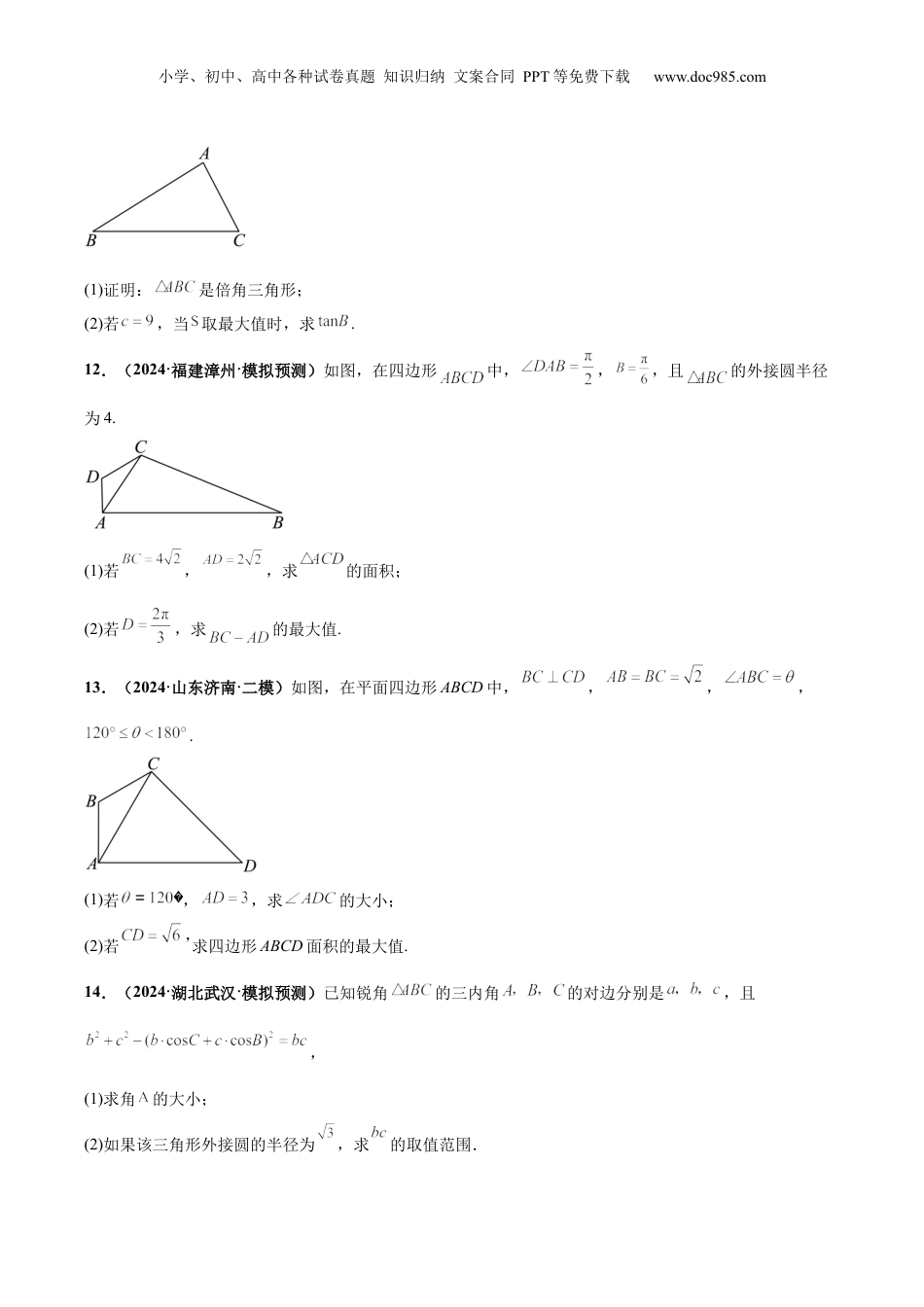 小学、初中、高中各种试卷真题知识归纳文案合同PPT等免费下载www.doc985.com黄金冲刺大题01解三角形(精选30题)1.(2024·江苏·一模)记的内角的对边分别为,已知.(1)证明:;(2)若,求的周长.2.(2024·湖南常德·三模)在中,内角,,的对边分别为,,,且.(1)求角;(2)若,,成等差数列,且的面积为,求的周长.3.(2024·江苏·一模)在中,.(1)求B的大小;(2)延长BC至点M,使得.若,求的大小.4.(2024·浙江温州·二模)记的内角所对的边分别为,已知.(1)求;(2)若,,求的面积.5.(2024·浙江嘉兴·二模)在中,内角所对的边分别是,已知.(1)求的值;(2)若为锐角三角形,,求的值.6.(2023·福建福州·模拟预测)在中,角的对边分别是,且.(1)求;(2)若面积为,求边上中线的长.小学、初中、高中各种试卷真题知识归纳文案合同PPT等免费下载www.doc985.com7.(2024·山东淄博·一模)如图,在△ABC中,的角平分线交BC于P点,.(1)若,求△ABC的面积;(2)若,求BP的长.8.(2024·安徽·模拟预测)如图,在平面四边形ABCD中,,.(1)若,,求的值;(2)若,,求四边形ABCD的面积.9.(2024·浙江·一模)在中,内角所对的边分别是,已知.(1)求角;(2)设边的中点为,若,且的面积为,求的长.10.(2024·湖北·一模)在中,已知.(1)求的大小;(2)若,求函数在上的单调递增区间.11.(2024·福建厦门·二模)定义:如果三角形的一个内角恰好是另一个内角的两倍,那么这个三角形叫做倍角三角形.如图,的面积为,三个内角所对的边分别为,且.小学、初中、高中各种试卷真题知识归纳文案合同PPT等免费下载www.doc985.com(1)证明:是倍角三角形;(2)若,当取最大值时,求.12.(2024·福建漳州·模拟预测)如图,在四边形中,,,且的外接圆半径为4.(1)若,,求的面积;(2)若,求的最大值.13.(2024·山东济南·二模)如图,在平面四边形ABCD中,,,,.(1)若,,求的大小;(2)若求四边形ABCD面积的最大值.14.(2024·湖北武汉·模拟预测)已知锐角的三内角的对边分别是,且,(1)求角的大小;(2)如果该三角形外接圆的半径为,求的取值范围.小学、初中、高中各种试卷真题知识归纳文案合同PPT等免费下载www.doc985.com15.(2024·湖南邵阳·模拟预测)在中,角的对边分别为,且的周长为.(1)求;(2)若,,为边上一点,,求的面积.16.(2024·广东梅州·二模)在中,角A,B,C所对应的边分别为a,b,c,,,(1)求A的大小:(2)点D在BC上,(Ⅰ)当,且时,求AC的长;(Ⅱ)当,且时,求的面积.17.(2024·广东广州·一模)记的内角,,的对边分别为,,,的面积为.已知.(1)求;(2)若点在边上,且,,求的周长.18.(2024·广东佛山·模拟预测)在中,角所对的边分别为,其中,.小学、初中、高中各种试卷真题知识归纳文案合同PPT等免费下载www.doc985.com(1)求角的大小;(2)如图,为外一点,,,求的最大值.19.(2024·河北石家庄·二模)在中,角A,B,C所对的边分别为a,b,c,设向量,.(1)求函数的最大值;(2)若,求的面积.20.(2024·广东·一模)设锐角三角形的内角的对边分别为,已知.(1)求;(2)若点在上(与不重合),且,求的值.21.(2024·辽宁·二模)在中,为边上一点,,且面积是面积的2倍.(1)若,求的长;(2)求的取值范围.22.(2024·黑龙江齐齐哈尔·一模)记的内角的对边分别为,已知.小学、初中、高中各种试卷真题知识归纳文案合同PPT等免费下载www.doc985.com(1)求;(2)若的面积为,求边上的中线长.23.(2024·重庆·模拟预测)如图,某班级学生用皮尺和测角仪(测角仪的高度为1.7m)测量重庆瞰胜楼的高度,测角仪底部A和瞰胜楼楼底O在同一水平线上,从测角仪顶点C处测得楼顶M的仰角,(点E在线段MO上).他沿线段AO向楼前进100m到达B点,此时从测角仪顶点D处测得楼顶M的仰角,楼尖MN的视角(N是楼尖底部,在线段MO上).(1)求楼高MO和楼尖MN;(2)若测角仪底在线段AO上的F处时,测角仪顶G测得楼尖MN的视角最大,求此时测角仪底到楼底的距离FO.参考数据:,,,24.(2024·重庆·模拟预测)在中,内角A,B,C所对的边分别为a,b,c...