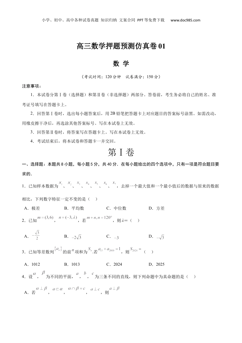 小学、初中、高中各种试卷真题知识归纳文案合同PPT等免费下载www.doc985.com高三数学押题预测仿真卷01数学(考试时间:120分钟试卷满分:150分)注意事项:1.本试卷分第Ⅰ卷(选择题)和第Ⅱ卷(非选择题)两部分。答卷前,考生务必将自己的姓名、准考证号填写在答题卡上。2.回答第Ⅰ卷时,选出每小题答案后,用2B铅笔把答题卡上对应题目的答案标号涂黑。如需改动,用橡皮擦干净后,再选涂其他答案标号。写在本试卷上无效。3.回答第Ⅱ卷时,将答案写在答题卡上。写在本试卷上无效。4.考试结束后,将本试卷和答题卡一并交回。第Ⅰ卷一、选择题:本题共8小题,每小题5分,共40分.在每小题给出的四个选项中,只有一项是符合题目要求的.1.已知样本数据为、、、、、、,去掉一个最大值和一个最小值后的数据与原来的数据相比,下列数字特征一定不变的是()A.极差B.平均数C.中位数D.方差2.已知,,若,则λ=()A.B.C.D.3.已知等差数列的前项和为.若,则()A.1012B.1013C.2024D.20254.设,为不同的平面,,,为三条不同的直线,则下列命题中为真命题的是()A.若,,,,则小学、初中、高中各种试卷真题知识归纳文案合同PPT等免费下载www.doc985.comB.若,,,则C.若,,则与异面D.若,,,则与相交5.一只小蜜蜂位于数轴上的原点处,小蜜蜂每一次具有只向左或只向右飞行一个单位或者两个单位距离的能力,且每次飞行至少一个单位.若小蜜蜂经过4次飞行后,停在位于数轴上实数3的点处,则小蜜蜂不同的飞行方式有()A.22B.28C.26D.246.在△ABC中,已知,,,D为垂足,,则()A.B.C.D.7.已知,则()A.B.C.D.8.已知点在双曲线上,过点P作双曲线的渐近线的垂线,垂足分别为A,B,若,,则()A.B.2C.D.二、选择题:本题共3小题,每小题6分,共18分.在每小题给出的选项中,有多项符合题目要求.全部选对的得6分,部分选对的得部分分,有选错的得0分.9.已知函数的部分图象如图所示,则()小学、初中、高中各种试卷真题知识归纳文案合同PPT等免费下载www.doc985.comA.B.C.的图象关于点对称D.在上单调递增10.已知复数,则下列说法正确的是()A.若,则B.若,则在复平面内对应的点在第二象限C.若,则D.若,复数在复平面内对应的点为,则直线(为原点)斜率的取值范围为11.已知定义在上的函数,其导函数分别为,且,则()A.的图象关于点中心对称B.C.D.小学、初中、高中各种试卷真题知识归纳文案合同PPT等免费下载www.doc985.com三、填空题:本题共3小题,每小题5分,共15分.12.已知集合,,那么.13.展开式中的常数项为.14.已知点在抛物线上运动,过点的两直线与圆相切,切点分别为,当取最小值时,直线的方程为.四、解答题:本题共5小题,共77分.解答应写出文字说明、证明过程或演算步骤.15.(13分)已知函数,.(1)若函数在上单调递减,求a的取值范围:(2)若直线与的图象相切,求a的值.16.(15分)如图,已知为等腰梯形,点为以为直径的半圆弧上一点,平面平面,为的中点,,.(1)求证:平面;(2)求平面与平面所成角的余弦值.小学、初中、高中各种试卷真题知识归纳文案合同PPT等免费下载www.doc985.com17.(15分)在某数字通信中,信号的传输包含发送与接收两个环节.每次信号只发送0和1中的某个数字,由于随机因素干扰,接收到的信号数字有可能出现错误,已知发送信号0时,接收为0和1的概率分别为,;发送信号1时,接收为1和0的概率分别为.假设每次信号的传输相互独立.(1)当连续三次发送信号均为0时,设其相应三次接收到的信号数字均相同的概率为,求的最小值;(2)当连续四次发送信号均为1时,设其相应四次接收到的信号数字依次为,记其中连续出现相同数字的次数的最大值为随机变量(中任意相邻的数字均不相同时,令),若,求的分布列和数学期望.18.(17分)已知椭圆的离心率为,直线过的上顶点与右顶点且与圆相切.(1)求的方程.(2)过上一点作圆的两条切线,(均不与坐标轴垂直),,与的另一个交点分别为,.证明:①直线,的斜率之积为定值;②.小学、初中、高中各种试卷真题知识归纳...