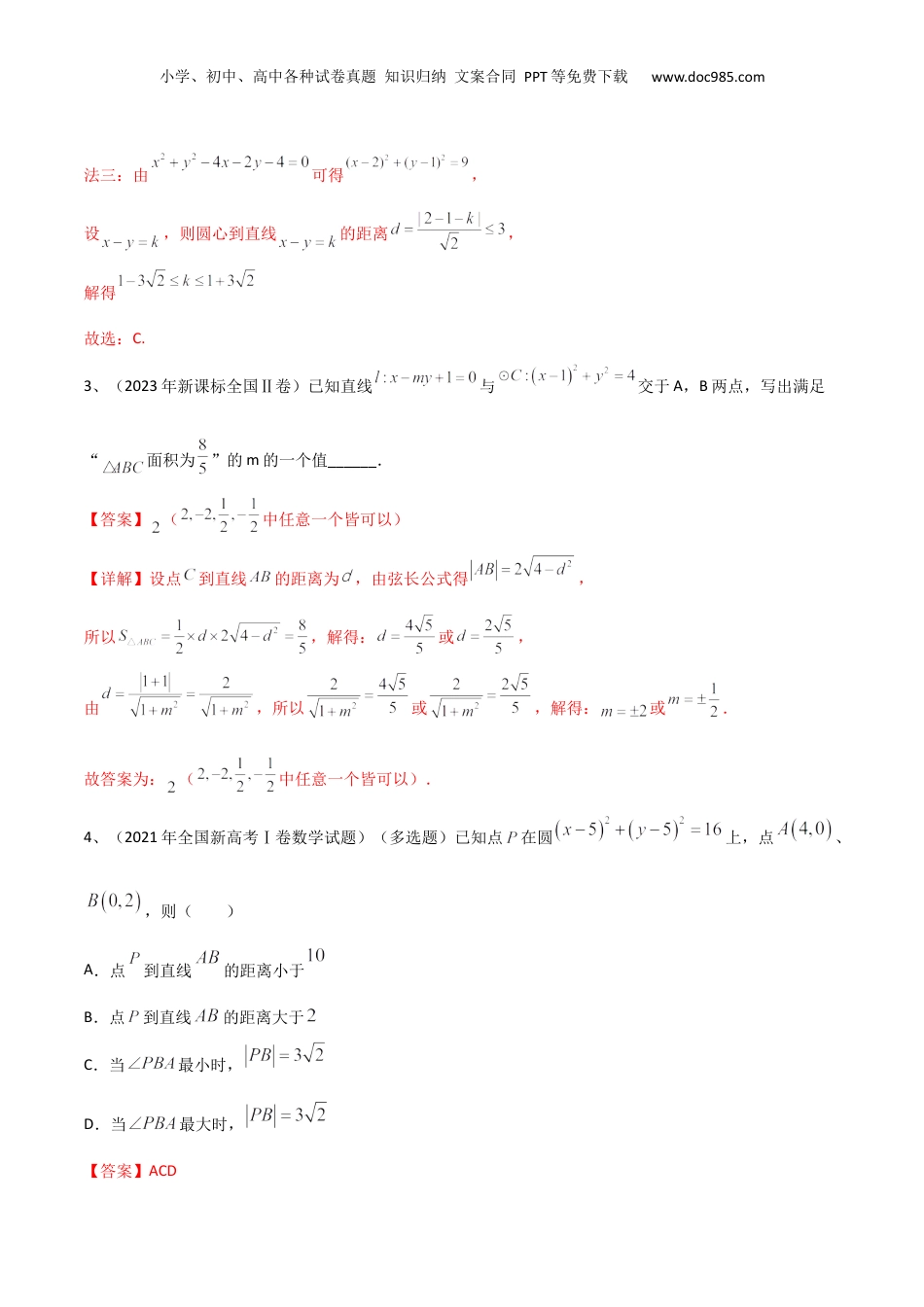 小学、初中、高中各种试卷真题知识归纳文案合同PPT等免费下载www.doc985.com专题15直线与圆1、(2023年新课标全国Ⅰ卷)过点与圆相切的两条直线的夹角为,则()A.1B.C.D.【答案】B【详解】方法一:因为,即,可得圆心,半径,过点作圆C的切线,切点为,因为,则,可得,则,,即为钝角,所以;法二:圆的圆心,半径,过点作圆C的切线,切点为,连接,可得,则,小学、初中、高中各种试卷真题知识归纳文案合同PPT等免费下载www.doc985.com因为且,则,即,解得,即为钝角,则,且为锐角,所以;2、(2023年全国乙卷数学(文))已知实数满足,则的最大值是()A.B.4C.D.7【答案】C【详解】法一:令,则,代入原式化简得,因为存在实数,则,即,化简得,解得,故的最大值是,法二:,整理得,令,,其中,则,,所以,则,即时,取得最大值,小学、初中、高中各种试卷真题知识归纳文案合同PPT等免费下载www.doc985.com法三:由可得,设,则圆心到直线的距离,解得故选:C.3、(2023年新课标全国Ⅱ卷)已知直线与交于A,B两点,写出满足“面积为”的m的一个值______.【答案】(中任意一个皆可以)【详解】设点到直线的距离为,由弦长公式得,所以,解得:或,由,所以或,解得:或.故答案为:(中任意一个皆可以).4、(2021年全国新高考Ⅰ卷数学试题)(多选题)已知点在圆上,点、,则()A.点到直线的距离小于B.点到直线的距离大于C.当最小时,D.当最大时,【答案】ACD小学、初中、高中各种试卷真题知识归纳文案合同PPT等免费下载www.doc985.com【解析】圆的圆心为,半径为,直线的方程为,即,圆心到直线的距离为,所以,点到直线的距离的最小值为,最大值为,A选项正确,B选项错误;如下图所示:当最大或最小时,与圆相切,连接、,可知,,,由勾股定理可得,CD选项正确.故选:ACD.5、(2020全国Ⅲ文8)点(0,﹣1)到直线距离的最大值为()A.1B.C.D.2【答案】B【解析】由可知直线过定点,设,当直线与垂直时,点小学、初中、高中各种试卷真题知识归纳文案合同PPT等免费下载www.doc985.com到直线距离最大,即为.6、(2020·新课标Ⅰ文)已知圆,过点(1,2)的直线被该圆所截得的弦的长度的最小值为()A.1B.2C.3D.4【答案】B【解析】圆化为,所以圆心坐标为,半径为ABCD,设DP=BQ=λ(0<λ<2),当过点λ=1的直线和直线GH//EF;垂直时,圆心到过点EB=2的直线的距离最大,所求的弦长最短,根据弦长公式最小值为GEFH.7、(2020·新课标Ⅱ文理5)若过点的圆与两坐标轴都相切,则圆心到直线2x−y−3=0的距离为()A.√55B.2√55C.3√55D.4√55【答案】B【解析】由于圆上的点在第一象限,若圆心不在第一象限,则圆与至少与一条坐标轴相交,不合乎题意,∴圆心必在第一象限,设圆心的坐标为,则圆的半径为,圆的标准方程为.由题意可得,可得,解得或,∴圆心的坐标为或,圆心到直线的距离均为,小学、初中、高中各种试卷真题知识归纳文案合同PPT等免费下载www.doc985.com∴圆心到直线的距离为.故选B.8、(2020全国Ⅰ理11】已知⊙,直线,为上的动点,过点作⊙的切线,切点为,当最小时,直线的方程为()A.B.C.D.【答案】D【解析】圆的方程可化为,点到直线的距离为,∴直线与圆相离.依圆的知识可知,四点四点共圆,且,∴,而,当直线时,,,此时最小.∴即,由解得,.∴以为直径的圆的方程为,即,两圆的方程相减可得:,即为直线的方程,故选D.9、【2022年全国甲卷】设点M在直线2x+y−1=0上,点(3,0)和(0,1)均在⊙M上,则⊙M的方程为______________.【答案】(x−1)2+(y+1)2=5【解析】: 点M在直线2x+y−1=0上,小学、初中、高中各种试卷真题知识归纳文案合同PPT等免费下载www.doc985.com∴设点M为(a,1−2a),又因为点(3,0)和(0,1)均在⊙M上,∴点M到两点的距离相等且为半径R,∴❑√(a−3)2+(1−2a)2=❑√a2+(−2a)2=R,a2−6a+9+4a2−4a+1=5a2,解得a=1,∴M(1,−1),R=❑√5,⊙M的方程为(x−1)2+(y+1)2=5.故答案为:(x−1)2+(y+1)2=510、【2022年全国乙卷】过四点(0,0),(4,0),(−1,1),(4,2)中的三点的一个圆的方程为____________.【...