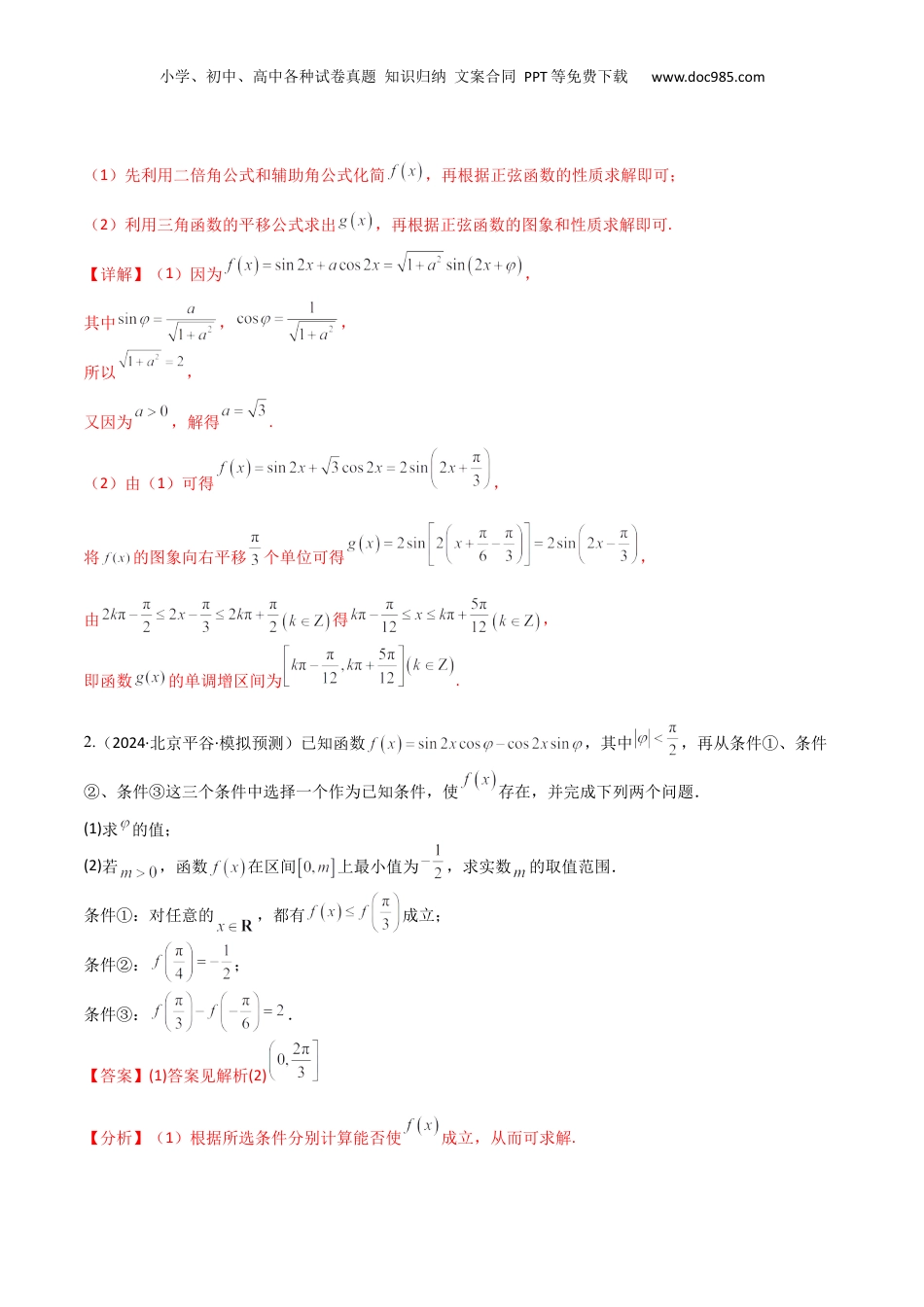 小学、初中、高中各种试卷真题知识归纳文案合同PPT等免费下载www.doc985.com大题培优01三角函数与解三角形目录【题型一】三角函数性质与恒等变形...............................................................................................................................【题型二】图像与性质:零点型.........................................................................................................................................【题型三】新结构第19题型:三角函数图像与性质型...................................................................................................【题型四】解三角形:求最大角度型...............................................................................................................................12【题型五】解三角形:边长与中线型最值.......................................................................................................................14【题型六】解三角形:角平分线型求最值.......................................................................................................................17【题型七】解三角形:高的最值型...................................................................................................................................21【题型八】解三角形:双余弦型.......................................................................................................................................23【题型九】三角形外接圆...................................................................................................................................................26【题型一】三角函数性质与恒等变形已知的部分图象求其解析式时比较容易看图得出,困难的是求待定系数和,常用如下两种方法:(1)由即可求出;确定时,若能求出离原点最近的右侧图象上升(或下降)的“零点”横坐标,则令(或),即可求出.(2)代入点的坐标,利用一些已知点(最高点、最低点或“零点”)坐标代入解析式,再结合图形解出和,若对,的符号或对的范围有要求,则可用诱导公式变换使其符合要求.1.(2024·北京延庆·一模)已知函数,的最大值为.(1)求的值;(2)将的图象向右平移个单位得到的图象,求函数的单调增区间.【答案】(1)(2)【分析】小学、初中、高中各种试卷真题知识归纳文案合同PPT等免费下载www.doc985.com(1)先利用二倍角公式和辅助角公式化简,再根据正弦函数的性质求解即可;(2)利用三角函数的平移公式求出,再根据正弦函数的图象和性质求解即可.【详解】(1)因为,其中,,所以,又因为,解得.(2)由(1)可得,将的图象向右平移个单位可得,由得,即函数的单调增区间为.2.(2024·北京平谷·模拟预测)已知函数,其中,再从条件①、条件②、条件③这三个条件中选择一个作为已知条件,使存在,并完成下列两个问题.(1)求的值;(2)若,函数在区间上最小值为,求实数的取值范围.条件①:对任意的,都有成立;条件②:;条件③:.【答案】(1)答案见解析(2)【分析】(1)根据所选条件分别计算能否使成立,从而可求解.小学、初中、高中各种试卷真题知识归纳文案合同PPT等免费下载www.doc985.com(2)根据(1)中可得,再利用整体代换法得,从而可求得,再结合,从而可求解.【详解】(1)由,若选条件①:可知当时,,因为,即,且对任意,都有恒成立,故选条件①时存在,故可选①;若选条件②:,解得或,,因为,所以与条件矛盾,故不选②;若选条件③:,所以,因为,可得,故条件③能使成立,故可选③;综上所述:故可选择条件①或③,此时.(2)由(1)知,当时,,且的最小值为,所以可得,解得,又,所以,所以的取值范围为.3.(2024·山东临沂·一模)已知向量,,函数.(1)若,且,求的值;(2)将图象上所有的点向右平移个单位,然后再向下平移1个单位,最后使所有点的纵坐标变为原来的,得...
