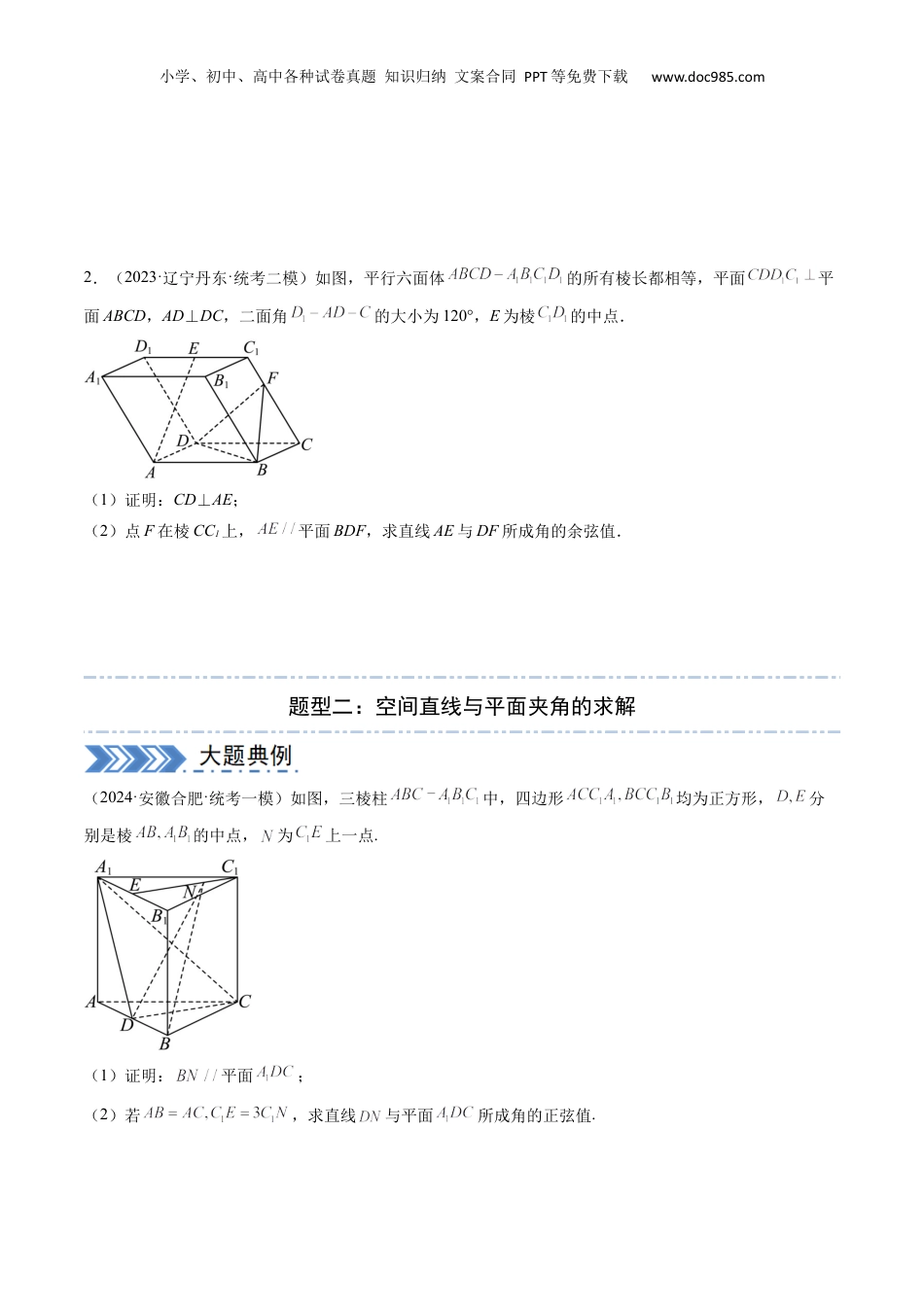 小学、初中、高中各种试卷真题知识归纳文案合同PPT等免费下载www.doc985.com大题03立体几何立体几何是高考数学的必考内容,在大题中一般分两问,第一问考查空间直线与平面的位置关系证明;第二问考查空间角、空间距离等的求解。考题难度中等,常结合空间向量知识进行考查。2024年高考有很大可能延续往年的出题方式。题型一:空间异面直线夹角的求解(2023·上海长宁·统考一模)如图,在三棱锥中,平面平面为的中点.(1)求证:;(2)若,求异面直线与所成的角的大小.小学、初中、高中各种试卷真题知识归纳文案合同PPT等免费下载www.doc985.com1、求异面直线所成角一般步骤:(1)平移:选择适当的点,线段的中点或端点,平移异面直线中的一条或两条成为相交直线.(2)证明:证明所作的角是异面直线所成的角.(3)寻找:在立体图形中,寻找或作出含有此角的三角形,并解之.(4)取舍:因为异面直线所成角的取值范围是,所以所作的角为钝角时,应取它的补角作为异面直线所成的角.2、可通过多种方法平移产生,主要有三种方法:(1)直接平移法(可利用图中已有的平行线);(2)中位线平移法;(3)补形平移法(在已知图形中,补作一个相同的几何体,以便找到平行线).3、异面直线所成角:若分别为直线的方向向量,为直线的夹角,则.1.(2023·江西萍乡·高三统考期中)如图,在正四棱台中,分别是的中点.(1)证明:平面;(2)若,且正四棱台的侧面积为9,其内切球半径为,为的中心,求异面直线与所成角的余弦值.小学、初中、高中各种试卷真题知识归纳文案合同PPT等免费下载www.doc985.com2.(2023·辽宁丹东·统考二模)如图,平行六面体的所有棱长都相等,平面平面ABCD,AD⊥DC,二面角的大小为120°,E为棱的中点.(1)证明:CD⊥AE;(2)点F在棱CC1上,平面BDF,求直线AE与DF所成角的余弦值.题型二:空间直线与平面夹角的求解(2024·安徽合肥·统考一模)如图,三棱柱中,四边形均为正方形,分别是棱的中点,为上一点.(1)证明:平面;(2)若,求直线与平面所成角的正弦值.小学、初中、高中各种试卷真题知识归纳文案合同PPT等免费下载www.doc985.com1、垂线法求线面角(也称直接法):(1)先确定斜线与平面,找到线面的交点B为斜足;找线在面外的一点A,过点A向平面做垂线,确定垂足O;(2)连结斜足与垂足为斜线AB在面上的投影;投影BO与斜线AB之间的夹角为线面角;(3)把投影BO与斜线AB归到一个三角形中进行求解(可能利用余弦定理或者直角三角形)。3、公式法求线面角(也称等体积法):用等体积法,求出斜线PA在面外的一点P到面的距离,利用三角形的正弦公式进行求解。公式为:sinθ=ℎl,其中θ是斜线与平面所成的角,ℎ是垂线段的长,l是斜线段的长。方法:已知平面β内一个多边形的面积为S,它在平面α内的射影图形的面积为S射影,平面α和平面β所成的二面角的大小为θ,则COSθ=S射影S.这个方法对于无棱二面角的求解很简便。4、直线与平面所成角:设是直线的方向向量,是平面的法向量,直线与平面的夹角为.则.1.(2024·内蒙古赤峰·高三校考开学考试)如图,在三棱台中,,,.小学、初中、高中各种试卷真题知识归纳文案合同PPT等免费下载www.doc985.com(1)证明:;(2)求直线与平面所成角的正弦值.2.(2024·浙江温州·高三统考期末)如图,以AD所在直线为轴将直角梯形ABCD旋转得到三棱台,其中,.(1)求证:;(2)若,求直线AD与平面CDF所成角的正弦值.题型三:空间平面与平面夹角的求解(2024·江苏扬州·高三统考开学考试)如图,在多面体中,四边形是边长为的正方形,,,,平面平面.小学、初中、高中各种试卷真题知识归纳文案合同PPT等免费下载www.doc985.com(1)求证:;(2)求平面与平面所成角的余弦值.1、几何法(1)定义法(棱上一点双垂线法):在二面角的棱上找一个特殊点,在两个半平面内分别过该点作垂直于棱的射线.(2)三垂线法(面上一点双垂线法):自二面角的一个面上一点向另外一个面作垂线,再由垂足向棱作垂线得到棱上的点(即斜足),斜足和面上一点的连线与斜足和垂足的连线所夹的角,即为二面角的平面角(3)垂...