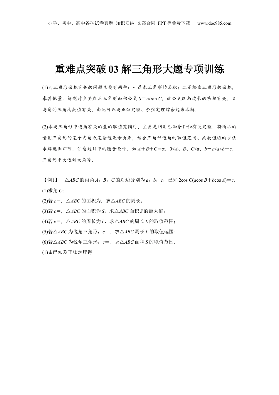 小学、初中、高中各种试卷真题知识归纳文案合同PPT等免费下载www.doc985.com重难点突破03解三角形大题专项训练(1)与三角形面积有关的问题主要有两种:一是求三角形的面积;二是给出三角形的面积,求其他量.解题时主要应用三角形面积公式S=absinC,此公式既与边长的乘积有关,又与角的三角函数值有关,由此可以与正弦定理、余弦定理综合起来求解.(2)求与三角形中边角有关的量的取值范围时,主要是利用已知条件和有关定理,将所求的量用三角形的某个内角或某条边表示出来,结合三角形边角的取值范围、函数值域的求法求解范围即可.注意题目中的隐含条件,如A+B+C=π,0<A、B、C<π,b-c<a<b+c,三角形中大边对大角等.【例1】△ABC的内角A,B,C的对边分别为a,b,c,已知2cosC(acosB+bcosA)=c.(1)求角C;(2)若c=,△ABC的面积为,求△ABC的周长;(3)若c=,△ABC的面积为S,求△ABC面积S的最大值;(4)若c=,△ABC的周长为L,求△ABC的周长L的取值范围;(5)若△ABC为锐角三角形,c=,求△ABC周长L的取值范围;(6)若△ABC为锐角三角形,c=,求△ABC面积S的取值范围.(1)由已知及正弦定理得小学、初中、高中各种试卷真题知识归纳文案合同PPT等免费下载www.doc985.com1.(2023•临沂一模)在中,角,,所对的边分别为,,,已知.(1)求;(2)若,求面积的取值范围.2.(2023•泉州模拟)在中,角,,所对的边分别是,,.已知.(1)求;(2)若,求的周长的取值范围.小学、初中、高中各种试卷真题知识归纳文案合同PPT等免费下载www.doc985.com3.(2023•德州一模)在锐角中,内角,,的对边分别为,,,且.(1)求证:;(2)若的角平分线交于,且,求面积的取值范围.4.(2023•盐城三模)在中,为的角平分线,且.(1)若,,求的面积;(2)若,求边的取值范围.小学、初中、高中各种试卷真题知识归纳文案合同PPT等免费下载www.doc985.com5.(2023•抚松县校级模拟)在①,②,③这三个条件中任选一个作为条件,补充到下面问题中,然后解答.已知锐角的内角,,所对的边分别为,,,且____(填序号).(1)若,,求的面积;(2)求的取值范围.6.(2023•龙凤区校级模拟)如图,在中,.延长到,使得,且.(1)若,求的面积;(2)当时,求面积的取值范围.小学、初中、高中各种试卷真题知识归纳文案合同PPT等免费下载www.doc985.com7.(2023•安康一模)已知中,内角,,所对的边分别为,,,且.(1)若,求外接圆的面积;(2)若为锐角三角形,且,求面积的取值范围.8.(2023•定远县校级模拟)已知的内角,,的对边分别为,,,向量,,且.(1)求角;(2)若,的面积为,求的周长.小学、初中、高中各种试卷真题知识归纳文案合同PPT等免费下载www.doc985.com9.(2023•湖南三模)在中,内角,,的对边分别为,,,且.(1)求角的大小;(2)若,且边上的高为,求的周长.10.(2023•重庆模拟)在中,角,,的对边分别为,,,已知.(1)求角;(2)若的面积为1,求的周长的最小值.小学、初中、高中各种试卷真题知识归纳文案合同PPT等免费下载www.doc985.com11.(2023•青羊区校级模拟)在锐角三角形中,角,,的对边分别为,,,为在方向上的投影向量,且满足.(1)求的值;(2)若,,求的周长.12.(2023•麒麟区校级模拟)在锐角中,角,,,的对边分别为,,,从条件①:,条件②:,条件③:这三个条件中选择一个作为已知条件.(1)求角的大小;(2)若,求周长的取值范围.小学、初中、高中各种试卷真题知识归纳文案合同PPT等免费下载www.doc985.com13.(2023•云南模拟)已知函数在上单调,且.(1)求的解析式;(2)若钝角的内角,,的对边分别是,,,且,,求周长的最大值.14.(2023•晋中模拟)的内角,,的对边分别为,,,其中,且满足.(1)求的外接圆半径;(2)若的平分线交于点,且,求的面积.小学、初中、高中各种试卷真题知识归纳文案合同PPT等免费下载www.doc985.com15.(2023•枣强县校级模拟)已知的内角,,满足.(1)求角;(2)若的外接圆半径为1,求的面积的最大值.16.(2023•湖南一模)在中,...