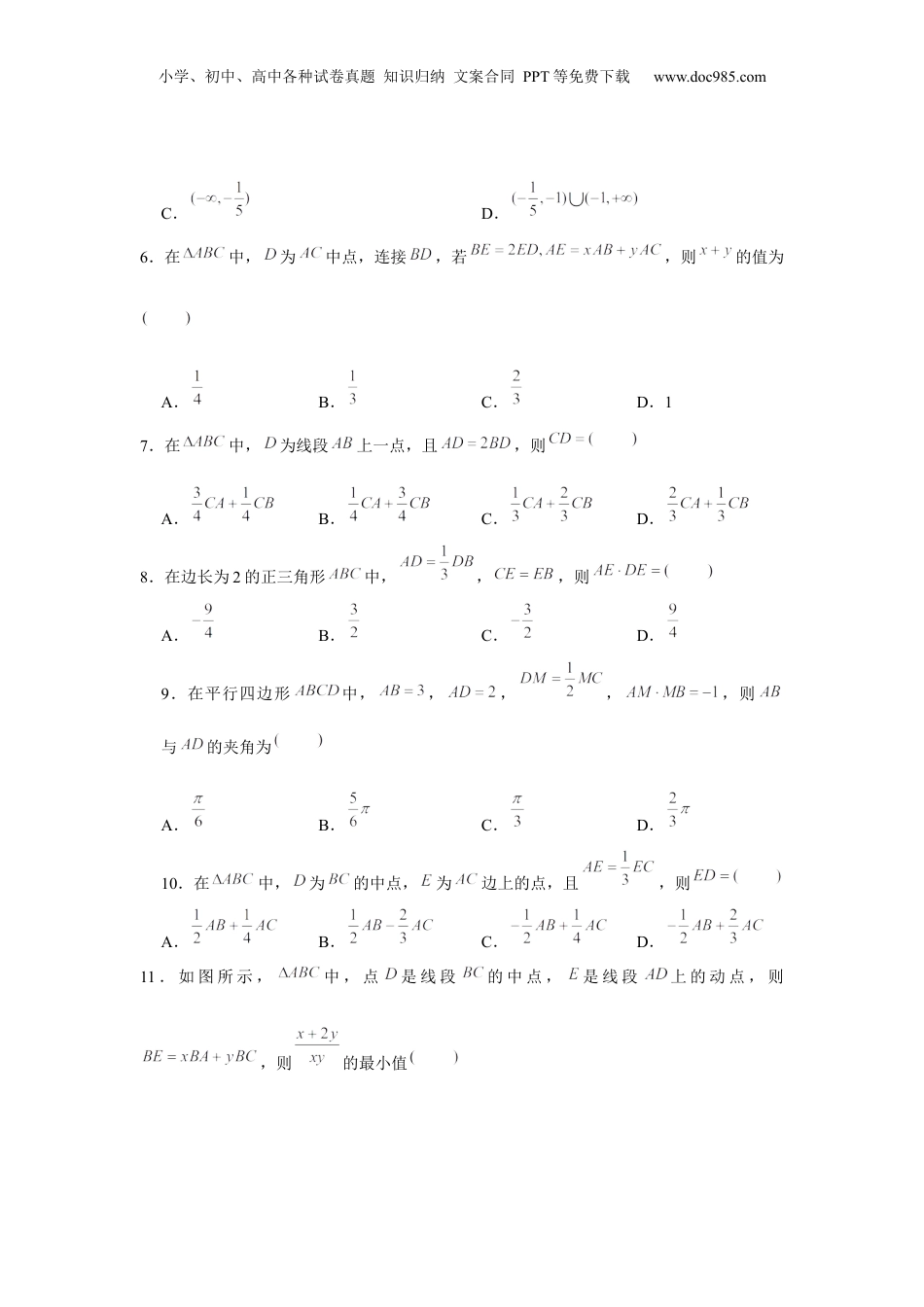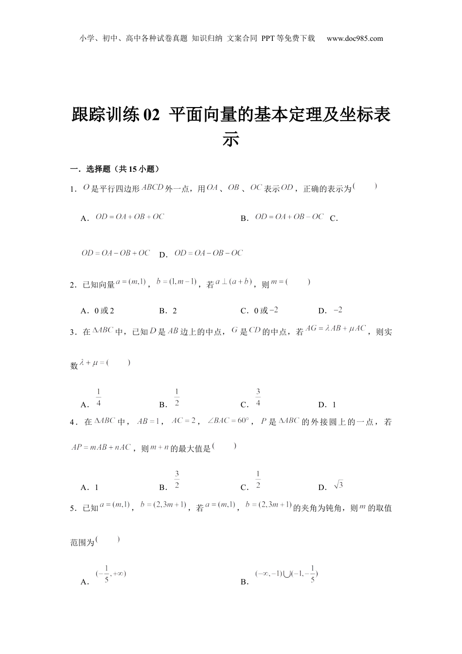 小学、初中、高中各种试卷真题知识归纳文案合同PPT等免费下载www.doc985.com跟踪训练02平面向量的基本定理及坐标表示一.选择题(共15小题)1.是平行四边形外一点,用、、表示,正确的表示为A.B.C.D.2.已知向量,,若,则A.0或2B.2C.0或D.3.在中,已知是边上的中点,是的中点,若,则实数A.B.C.D.14.在中,,,,是的外接圆上的一点,若,则的最大值是A.1B.C.D.5.已知,,若,的夹角为钝角,则的取值范围为A.B.小学、初中、高中各种试卷真题知识归纳文案合同PPT等免费下载www.doc985.comC.D.6.在中,为中点,连接,若,则的值为A.B.C.D.17.在中,为线段上一点,且,则A.B.C.D.8.在边长为2的正三角形中,,,则A.B.C.D.9.在平行四边形中,,,,,则与的夹角为A.B.C.D.10.在中,为的中点,为边上的点,且,则A.B.C.D.11.如图所示,中,点是线段的中点,是线段上的动点,则,则的最小值小学、初中、高中各种试卷真题知识归纳文案合同PPT等免费下载www.doc985.comA.1B.3C.5D.812.两个单位向量与满足,则向量与的夹角为()A.30°B.60°C.120°D.150°13.给定两个向量,,若,则的值是A.23B.C.D.14.如图,在中,,为的中点,设,,则A.B.C.D.15.在中,点是边的中点,则有A.B.C.D.二.多选题(共5小题)16.下列命题正确的是小学、初中、高中各种试卷真题知识归纳文案合同PPT等免费下载www.doc985.comA.B.单位向量,,满足C.对于向量,,有恒成立D.向量,不能作为所在平面内的一组基底17.下列两个向量,能作为基底向量的是A.B.C.D.18.如图,在平行四边形中,已知,分别是靠近,的四等分点,则下列结论正确的是A.B.C.D.19.已知向量,,则下列说法正确的是A.若,则B.若,则C.的最小值为6小学、初中、高中各种试卷真题知识归纳文案合同PPT等免费下载www.doc985.comD.若与的夹角为锐角,则20.如图所示,在边长为3的等边三角形中,,且点在以的中点为圆心,为半径的半圆上,若,则A.B.C.存在最大值D.的最大值为三.填空题(共5小题)21.已知点是的重心,过点作直线与,两边分别交于、两点,且,,,则的最小值是.22.已知向量,则与夹角的大小为.23.在平行四边形中,若,则.24.已知与的夹角为,若,则的值为.25.已知向量,若,则与的夹角为.四.解答题(共3小题)26.已知向量,.小学、初中、高中各种试卷真题知识归纳文案合同PPT等免费下载www.doc985.com(1)若,求的值;(2)若,求实数的值;(3)若与的夹角是钝角,求实数的取值范围.27.如图,在中,为重心,,延长交于点,设,.(1)若,求的值;(2)若,求的值.28.已知向量,,.(1)若,试判断,能否构成平面的一组基底?并请说明理由.小学、初中、高中各种试卷真题知识归纳文案合同PPT等免费下载www.doc985.com(2)若,且,求与的夹角大小.