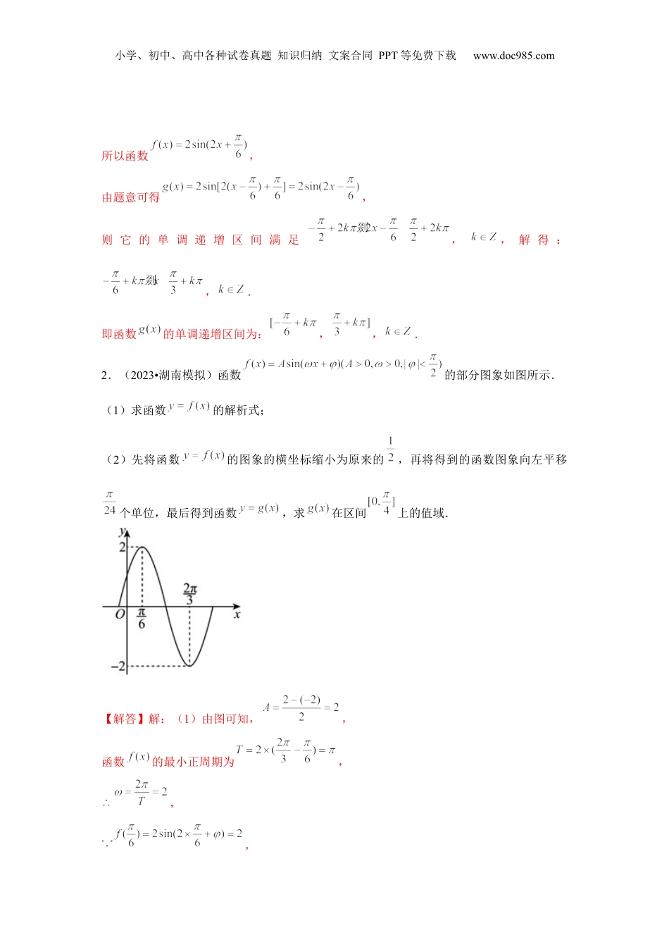 小学、初中、高中各种试卷真题知识归纳文案合同PPT等免费下载www.doc985.com重难点突破02三角函数大题专项训练1.(2023•成都模拟)已知函数,(下面①,②中选择一个作为已知条件,解答问题:(1)求的值;(2)将的图象向右平移个单位得到的图象,求函数的单调增区间.①的最大值为2;②.注:如果选择①和②分别解答,则按第一个解答计分.【解答】解:(1),若选①,因为函数的最大值为2,即,,可得;若选②,,即,由可得,解得:;综上所述:;(2)由(1)可得,则,,当时,,小学、初中、高中各种试卷真题知识归纳文案合同PPT等免费下载www.doc985.com所以函数,由题意可得,则它的单调递增区间满足,,解得:,.即函数的单调递增区间为:,,.2.(2023•湖南模拟)函数的部分图象如图所示.(1)求函数的解析式;(2)先将函数的图象的横坐标缩小为原来的,再将得到的函数图象向左平移个单位,最后得到函数,求在区间上的值域.【解答】解:(1)由图可知,,函数的最小正周期为,,,小学、初中、高中各种试卷真题知识归纳文案合同PPT等免费下载www.doc985.com,,则,,则,故;(2)将函数的图象的横坐标缩小为原来的,可得到函数的图象,再将得到的函数图象向左平移个单位,最后得到函数的图象,则,当时,,则,,在区间上的值域为.3.(2023•岳阳县模拟)已知函数部分图象如图所示.(Ⅰ)求的最小正周期及解析式;(Ⅱ)将函数的图象向右平移个单位长度得到函数的图象,求函数小学、初中、高中各种试卷真题知识归纳文案合同PPT等免费下载www.doc985.com在区间上的最大值和最小值.【解答】解:(1)由图可知,,,,所以.当时,,可得.求的解析式为:;(2)由(1)知.将函数的图象向右平移个单位长度得到函数的图象,故,,当,即时,有最大值为1;当,即时,有最小值为;小学、初中、高中各种试卷真题知识归纳文案合同PPT等免费下载www.doc985.com4.(2023•南昌二模)如图是函数的部分图象,已知.(1)求;(2)若,求.【解答】解:(1)设,,函数的最小正周期为,则,则,故,解得(负值舍去),所以,所以;(2)由(1)得,,得,即,所以,又因,则,小学、初中、高中各种试卷真题知识归纳文案合同PPT等免费下载www.doc985.com所以,所以.5.(2023•大观区校级三模)已知函数.(Ⅰ)求函数的单调递增区间;(Ⅱ)求在区间,上的最值.【解答】解:(Ⅰ).函数的单调递增区间为,解得,,,的单调递增区间为,(Ⅱ)因为,,所以.当,即时,,当,即时,.6.(2023•广州三模)已知函数,.(1)若函数图象的两条相邻对称轴之间的距离为,求的单调增区间;(2)若函数的图象关于对称,且函数在上单调,求的值.【解答】解:(1)函数的两条相邻对称轴之间的距离为,,小学、初中、高中各种试卷真题知识归纳文案合同PPT等免费下载www.doc985.com,.令,,求得,,可得它的增区间为,,.(2)若函数的图象关于对称,则,,,,由函数在上单调,,,,求得.综上可得,.7.(2023•亭湖区校级三模)已知函数的值域为,.(1)求的单调递增区间;(2)若在上恰有一个零点,求的取值范围.【解答】解:,令,则,,小学、初中、高中各种试卷真题知识归纳文案合同PPT等免费下载www.doc985.com又,在,上单调递增,故由题意有:,解得,,当,时,单调递增,解得,,即的单调递增区间为,;(2)由(1)知,,,当,时,,,结合正弦函数的图象可知:当,即时,函数在区间,上恰有一个零点,故的取值范围是,.8.(2023•安康一模)已知函数的部分图象如图所示.(1)求函数的解析式;(2)将函数图象上所有的点向右平移个单位长度,再将所得图象上每一个点的横坐标变为原来的2倍(纵坐标不变),得到函数的图象.当时,小学、初中、高中各种试卷真题知识归纳文案合同PPT等免费下载www.doc985.com方程恰有三个不相等的实数根,,,,求实数的取值范围以及的值.【解答】解:(1)由图可得:,得:,又,所以,所以,所以.又因为过点,所以,即,所以,解得,又,所以,所以.(2)图象上所有的点向右平移个单位长度,得到,将所得图象上...