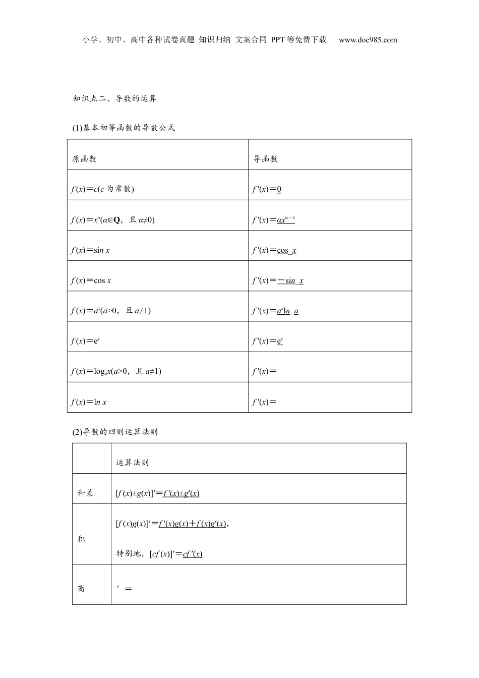 小学、初中、高中各种试卷真题知识归纳文案合同PPT等免费下载www.doc985.com专题01导数的概念及其意义、导数的运算目录题型一:导数的概念....................................................................................................................3题型二:导数的运算....................................................................................................................4题型三:导数的几何意义——求切线方程.................................................................................6题型四:导数的几何意义——求切点坐标.................................................................................9题型五:导数的几何意义——求参数的值...............................................................................10题型六:公切线问题的求法——判断公切线的条数...............................................................11题型七:公切线问题的求法——求两曲线的公切线...............................................................11题型八:公切线问题的求法——求参数的值或范围...............................................................11知识点一、导数的概念及其意义(1)导数的概念:如果当Δx→0时,平均变化率无限近于一确定的,即有限,趋个值极则称y=f(x)在x=x0处可导,并把这个确定的值叫做y=f(x)在x=x0处的导数(也称为瞬时变化率),记作f′(x0)或y′|x=x0,即f′(x0)=lim=lim.(2)导数的几何意义:函数y=f(x)在点x0处的导数的几何意义,就是曲线y=f(x)在点P(x0,f(x0))处的切线的斜率.也就是说,曲线y=f(x)在点P(x0,f(x0))处的切线的斜率是f′(x0).相应的切线方程为y-y0=f′(x0)(x-x0).(3)导函数的概念:当x=x0时,f′(x0)是一个唯一确定的数,这样,当x变化时,y=f′(x)就是x的函数,我们称它为y=f(x)的导函数(简称导数).y=f(x)的导函数有时也记作y′,即f′(x)=y′=lim.知识点总结小学、初中、高中各种试卷真题知识归纳文案合同PPT等免费下载www.doc985.com知识点二、导数的运算(1)基本初等函数的导数公式原函数导函数f(x)=c(c为常数)f′(x)=0f(x)=xα(α∈Q,且α≠0)f′(x)=αxα-1f(x)=sinxf′(x)=cos_xf(x)=cosxf′(x)=-sin_xf(x)=ax(a>0,且a≠1)f′(x)=axln_af(x)=exf′(x)=exf(x)=logax(a>0,且a≠1)f′(x)=f(x)=lnxf′(x)=(2)导数的四则运算法则运算法则和差[f(x)±g(x)]′=f′(x)±g′(x)积[f(x)g(x)]′=f′(x)g(x)+f(x)g′(x),特别地,[cf(x)]′=cf′(x)商′=小学、初中、高中各种试卷真题知识归纳文案合同PPT等免费下载www.doc985.com(g(x)≠0)(3)简单复合函数的导数一般地,对于两个函数y=f(u)和u=g(x),如果通过中间变量u,y可以表示成x的函数,那么称这个函数为函数y=f(u)和u=g(x)的复合函数,记作y=f(g(x)).它的导数与函数y=f(u),u=g(x)的导数间的关系为y′x=y′u·u′x.即y对x的导数等于y对u的导数与u对x的导数的乘积.题型一:导数的概念【要点讲解】求函数y=f(x)在点x0处导数的步骤(1)求函数的增量(2)求平均变化率(3)得导数,简记作:一差、二比、三极限.函数y=f(x)的导数f'(x)反映了函数f(x)的瞬时变化趋势,其正负号反映了变化的方向,其大小|f'(x)|反映了变化的快慢,|f'(x)|越大,曲线在这点处的切线越“陡”.【例1】(2023春•儋州校级月考)已知函数,则A.3B.5C.7D.6【变式训练1】(2023春•民勤县校级月考)已知,则A.B.C.1D.4例题精讲小学、初中、高中各种试卷真题知识归纳文案合同PPT等免费下载www.doc985.com【变式训练2】(2023春•江西月考)若,则A.1B.2C.D.【例2】(2023春•青岛期中)质点按规律做直线运动(位移单位:,时间单位:,则质点在时的瞬时速度为A.B.C.D.【变式训练1】(2023春•江西月考)已知函数,当自变量由1变到1.1时,的平均变化率为A.1B.1.1C.2D.2.1【变式训练2】(2023春•驻马店月考)已知某质点的位移与时间的关系式是,则质点在时的...