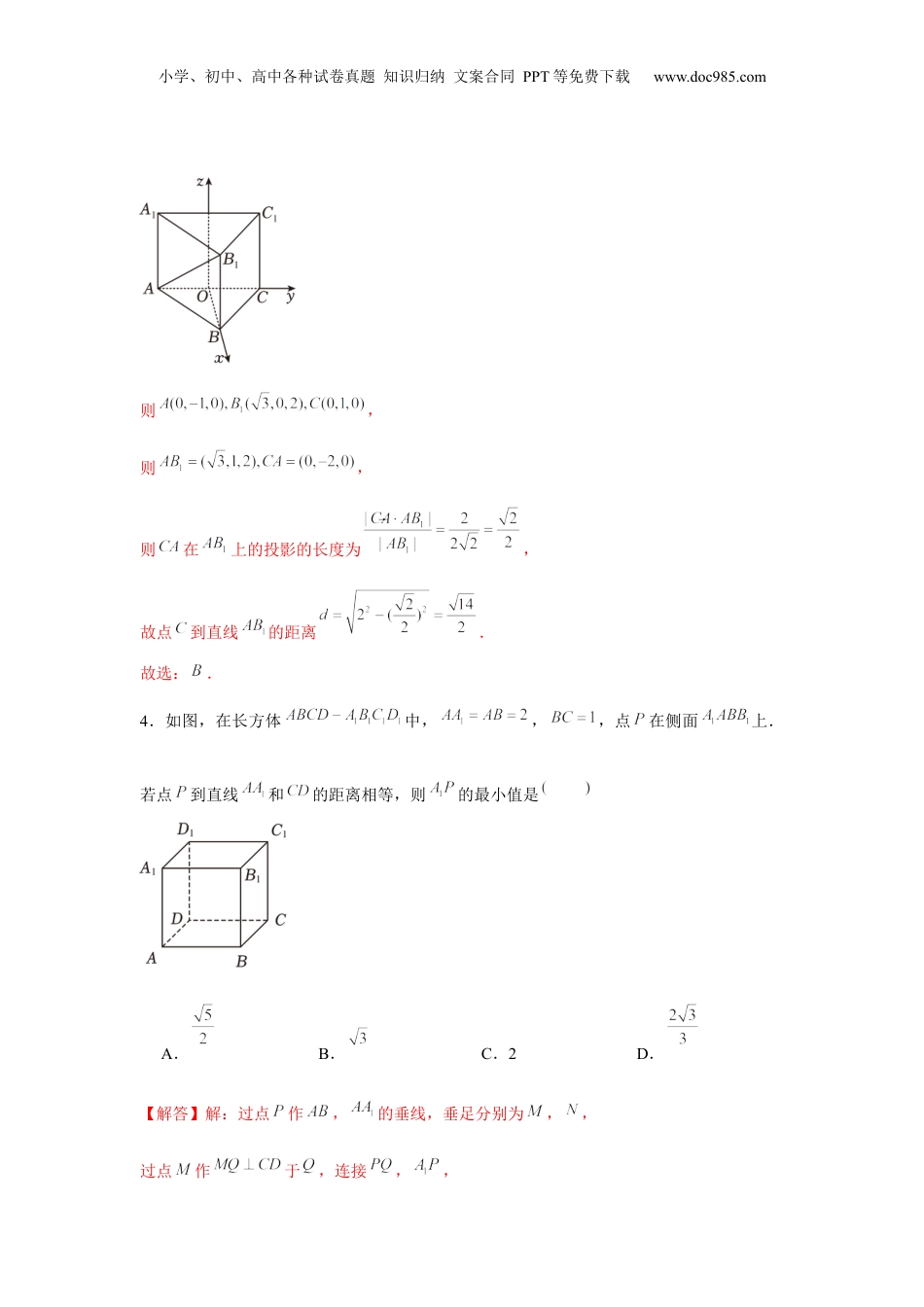 小学、初中、高中各种试卷真题知识归纳文案合同PPT等免费下载www.doc985.com跟踪训练06向量法求空间角和距离一.选择题(共15小题)1.已知,2,、,4,、,2,,则原点到平面的距离是A.B.C.2D.【解答】解:由已知可得,,设平面的法向量为,则取,则平面的一个法向量为,而,所以原点到平面的距离.故选:.2.在长方体中,,,为的中点,则点到平面的距离为A.B.C.D.【解答】解:如图所示,以为坐标原点,以,,所在直线分别为,,轴建立空间直角坐标系,小学、初中、高中各种试卷真题知识归纳文案合同PPT等免费下载www.doc985.com所以,0,,,0,,,4,,,4,,则,,设,,是平面的一个法向量,则,令,则,又,所以点到平面的距离为.故选:.3.如图,在正三棱柱中,若,则点到直线的距离为A.B.C.D.【解答】解:取的中点,为等边三角形,则,以为原点,的方向分别为,轴的正方向建立空间直角坐标系,小学、初中、高中各种试卷真题知识归纳文案合同PPT等免费下载www.doc985.com则,则,则在上的投影的长度为,故点到直线的距离.故选:.4.如图,在长方体中,,,点在侧面上.若点到直线和的距离相等,则的最小值是A.B.C.2D.【解答】解:过点作,的垂线,垂足分别为,,过点作于,连接,,小学、初中、高中各种试卷真题知识归纳文案合同PPT等免费下载www.doc985.com因为,面面,面面,面,所以面,又面,所以,又,,所以面,又面,所以,在平面上,以,为坐标轴建立平面直角坐标系,设,,则,,所以,若点到直线和得距离相等,则,即,所以,所以当,时,取得最小值为.故选:.小学、初中、高中各种试卷真题知识归纳文案合同PPT等免费下载www.doc985.com5.空间中有三点,,,,,,,,,则点到直线的距离为A.B.C.3D.【解答】解:间中有三点,,,,,,,,,,1,,的一个单位方向向量为,1,,,,,,,点到直线的距离为.故选:.6.如图,在正方体中,截面与底面所成锐二面角的正切值为小学、初中、高中各种试卷真题知识归纳文案合同PPT等免费下载www.doc985.comA.B.C.D.【解答】解:如图所示,连接交于点,连接,则,,为二面角的平面角,设,则,所以.故选:.7.已知直线,且向量是直线的一个方向向量,则实数的值为A.B.1C.2D.或2【解答】解:向量是直线的一个方向向量,直线的斜率,,解得:或.故选:.8.如图,在三棱柱中,,,,小学、初中、高中各种试卷真题知识归纳文案合同PPT等免费下载www.doc985.com,与的交点为,则A.B.C.D.【解答】解:由题意得,,,,,.故选:.9.直线的方向向量为A.B.C.D.【解答】解:根据直线方程,可得直线的斜率为,所以直线的一个方向向量为,又,,,所以也是直线的一个方向向量.故选:.小学、初中、高中各种试卷真题知识归纳文案合同PPT等免费下载www.doc985.com10.我国古代数学名著《九章算术》对立体几何问题有着深入的研究,从其中的一些数学用语可见.譬如“堑堵”指底面为直角三角形且侧棱垂直于底面的三棱柱,“阳马”指底面是矩形且有一侧棱垂直于底面的四棱锥,“鳖臑”指四个面都是直角三角形的三棱锥.现有一如图所示的“堑堵”,其中,若,则到平面的距离为A.B.C.D.【解答】解:以为坐标原点,,,所在直线分别为,,轴,建立如图所示的空间直角坐标系,则,4,,,0,,,4,,,0,,小学、初中、高中各种试卷真题知识归纳文案合同PPT等免费下载www.doc985.com所以,4,,,0,,,4,,设平面的法向量为,,,则,即,令,则,,所以,0,,所以到平面的距离为.故选:.11.如图,一块矿石晶体的形状为四棱柱,底面是正方形,,,且.则向量的模长为A.B.34C.52D.【解答】解:设,则,所以.故选:.小学、初中、高中各种试卷真题知识归纳文案合同PPT等免费下载www.doc985.com12.如图所示,在棱长为2的正方体中,点在棱上,且,则点,到平面的距离之和为A.B.C.D.【解答】解:在棱长为2的正方体中,平面,平面,则,由,得,在△中,,则,即点为中点,又因为,平面,平面,因此平面,于是点到平面的距离等于点到平面的距离,同理点到平面的距离...