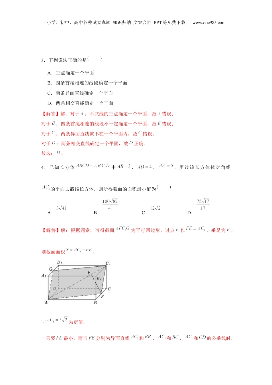 小学、初中、高中各种试卷真题知识归纳文案合同PPT等免费下载www.doc985.com跟踪训练02空间点、直线、平面之间的位置关系一.选择题(共15小题)1.如图,在正方体中,,,分别为,,上靠近,,的三等分点,,,,,,分别是,,的三等分点,,,为分别是,,的中点,则平面过A.,,B.,,C.,,D.以上都不正确【解答】解:如图所示,小学、初中、高中各种试卷真题知识归纳文案合同PPT等免费下载www.doc985.com设正方体的棱长为3,取的三等分点,则,所以延迟与交于点,连接并延长,交于和延长线于,,连接交于点,过点作交于点,平面截正方体所得截面即为,设,易知,所以,,所以,,,解得,所以点与重合,,,所以点与重合,因为,所以点与重合.故选:.2.下列说法错误的是A.空间中的三点确定一个平面B.直线和直线外一点确定一个平面C.两条相交直线确定一个平面D.两条平行直线确定一个平面【解答】解:对于,由公理2可知:过不在同一直线上的三点有且只有一个平面,故错误;对于,由公理2的推论可知:经过两条相交直线有且只有一个平面,故选项正确;对于,由公理2的推论可知:经过一条直线和这条直线外一点有且只有一个平面,故选项正确;对于,由公理2的推论可知:经过两条平行直线有且只有一个平面,故选项正确,故选:.小学、初中、高中各种试卷真题知识归纳文案合同PPT等免费下载www.doc985.com3.下列说法正确的是A.三点确定一个平面B.四条首尾相连的线段确定一个平面C.两条异面直线确定一个平面D.两条相交直线确定一个平面【解答】解:对于:不共线的三点确定一个平面,故错误;对于:四条首尾相连的线段不一定确定一个平面,故错误;对于:两条异面直线就不在一个平面内,故错误;对于:两条相交直线确定一个平面,故正确.故选:.4.已知长方体中,,,用过该长方体体对角线的平面去截该长方体,则所得截面的面积最小值为A.B.C.D.【解答】解:根据题意,可得截面为平行四边形,过点作,垂足为,则截面面积,为定值,只要最小,而当分别为异面直线和,和,和的公垂线时,小学、初中、高中各种试卷真题知识归纳文案合同PPT等免费下载www.doc985.com最小.分别求得三种情况的距离分别为,,,故,故,结合长方体的对角面的面积,,,比较所有情况可得截面面积最小值.故选:.5.正方体中,,,分别是,,的中点.那么过,,三点的截面图形是A.三角形B.四边形C.五边形D.六边形【解答】解:如图所示,过,,三点的截面图形是六边形,故选:.6.下列说法正确的是A.空间中任意三点确定一个平面B.一个西瓜切3刀可以切成7块C.垂直同一条直线的两条直线互相平行D.垂直同一个平面的两个平面互相垂直【解答】解:对于,空间中不在同一直线上的三点确定一个平面,故错误;对于,一个西瓜切3刀等价于一个球体体被三个平面切割,按照如图所示的方法切割可小学、初中、高中各种试卷真题知识归纳文案合同PPT等免费下载www.doc985.com得7块,故正确;对于,垂直于同一条直线的两条直线平行、相交或异面,故错误.对于,垂直于同一个平面的两个平面平行或相交,故错误.故选:.7.下列命题中正确的是A.三点确定一个平面B.垂直于同一直线的两条直线平行C.若直线与平面上的无数条直线都垂直,则直线D.若、、是三条直线,且与都相交,则直线、、共面【解答】解:对于选项:不共线的三点确定一个平面,故错误,对于选项:由墙角模型可知,显然错误,对于选项:根据线面垂直的判定定理,若直线与平面内的两条相交直线垂直,则直线与平面垂直,若直线与平面内的无数条平行直线垂直,则直线与平面不垂直,故错误,对于选项:因为,所以与唯一确定一个平面,设为平面,又与和都相交,所以也在平面内,即直线、、共面,故选项正确,故选:.8.已知正方体的棱长是2,,分别是棱和的中点,点在正方形(包括边界)内,当平面时,长度的最大值为.以为球心,为半径的球面与底面的交线长为A.B.C.D.小学、初中、高中各种试卷真题知识归纳文案合同PPT等免费下载www.doc985.com【解答】解:如图所示:分别取,的中点,,连接,,,所以,又平面,平面,所以平面,...