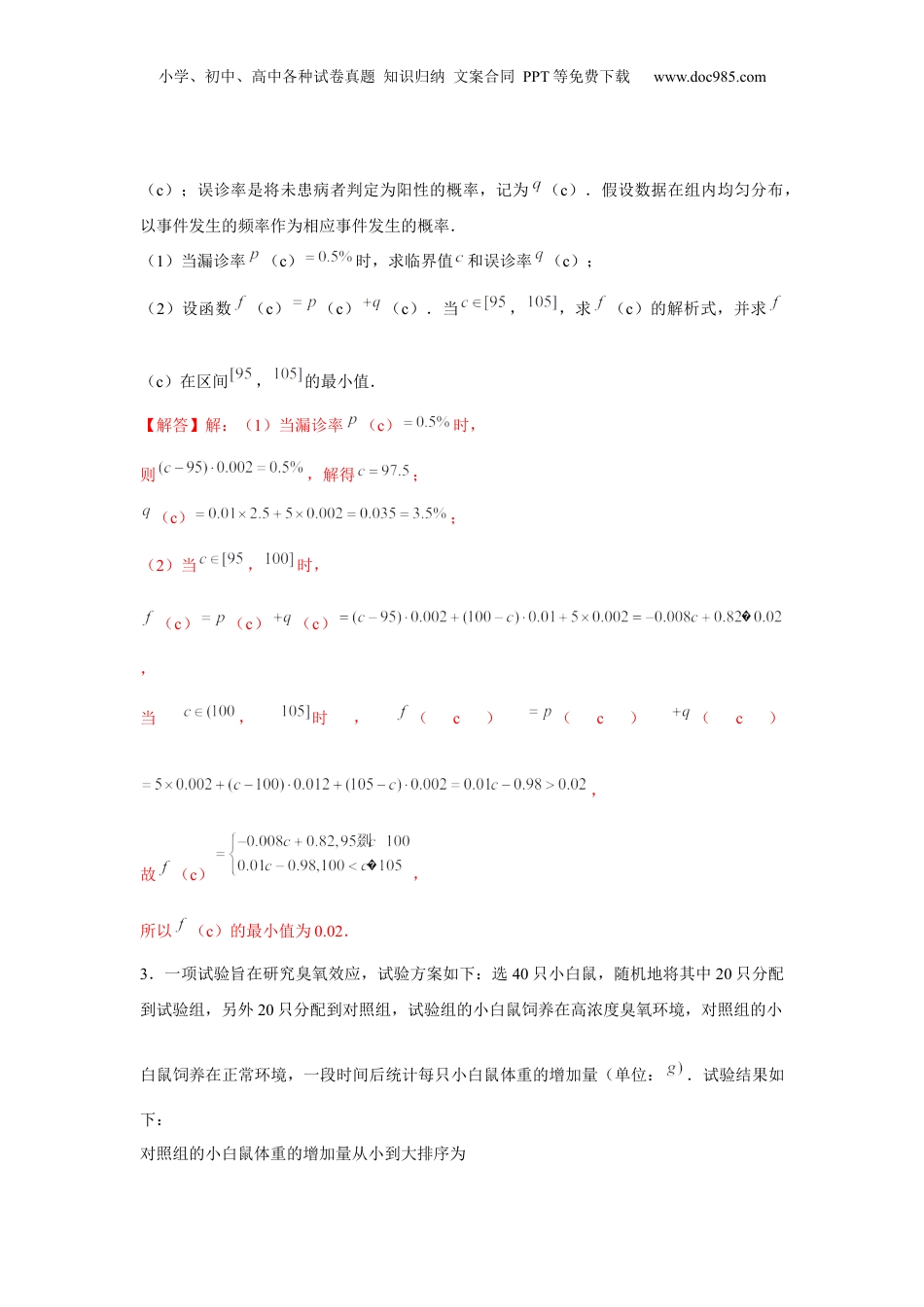 小学、初中、高中各种试卷真题知识归纳文案合同PPT等免费下载www.doc985.com重难点突破01统计与概率综合1.某厂为比较甲乙两种工艺对橡胶产品伸缩率的处理效应,进行10次配对试验,每次配对试验选用材质相同的两个橡胶产品,随机地选其中一个用甲工艺处理,另一个用乙工艺处理,测量处理后的橡胶产品的伸缩率,甲、乙两种工艺处理后的橡胶产品的伸缩率分别记为,,2,.试验结果如下:试验序号12345678910伸缩率545533551522575544541568596548伸缩率536527543530560533522550576536记,2,,,记,,,的样本平均数为,样本方差为.(1)求,;(2)判断甲工艺处理后的橡胶产品的伸缩率较乙工艺处理后的橡胶产品的伸缩率是否有显著提高.(如果,则认为甲工艺处理后的橡胶产品的伸缩率较乙工艺处理后的橡胶产品的伸缩率有显著提高,否则不认为有显著提高)【解答】解:(1)根据表中数据,计算,2,,,填表如下:试验序号12345678910小学、初中、高中各种试卷真题知识归纳文案合同PPT等免费下载www.doc985.com伸缩率545533551522575544541568596548伸缩率536527543530560533522550576536968151119182012计算平均数为,方差为.(2)由(1)知,,,所以,认为甲工艺处理后的橡胶产品的伸缩率较乙工艺处理后的橡胶产品的伸缩率有显著提高.2.某研究小组经过研究发现某种疾病的患病者与未患病者的某项医学指标有明显差异,经过大量调查,得到如下的患病者和未患病者该指标的频率分布直方图:利用该指标制定一个检测标准,需要确定临界值,将该指标大于的人判定为阳性,小于或等于的人判定为阴性,此检测标准的漏诊率是将患病者判定为阴性的概率,记为小学、初中、高中各种试卷真题知识归纳文案合同PPT等免费下载www.doc985.com(c);误诊率是将未患病者判定为阳性的概率,记为(c).假设数据在组内均匀分布,以事件发生的频率作为相应事件发生的概率.(1)当漏诊率(c)时,求临界值和误诊率(c);(2)设函数(c)(c)(c).当,,求(c)的解析式,并求(c)在区间,的最小值.【解答】解:(1)当漏诊率(c)时,则,解得;(c);(2)当,时,(c)(c)(c),当,时,(c)(c)(c),故(c),所以(c)的最小值为0.02.3.一项试验旨在研究臭氧效应,试验方案如下:选40只小白鼠,随机地将其中20只分配到试验组,另外20只分配到对照组,试验组的小白鼠饲养在高浓度臭氧环境,对照组的小白鼠饲养在正常环境,一段时间后统计每只小白鼠体重的增加量(单位:.试验结果如下:对照组的小白鼠体重的增加量从小到大排序为小学、初中、高中各种试卷真题知识归纳文案合同PPT等免费下载www.doc985.com15.218.820.221.322.523.225.826.527.530.132.634.334.835.635.635.836.237.340.543.2试验组的小白鼠体重的增加量从小到大排序为7.89.211.412.413.215.516.518.018.819.219.820.221.622.823.623.925.128.232.336.5(1)计算试验组的样本平均数;(2)(ⅰ)求40只小白鼠体重的增加量的中位数,再分别统计两样本中小于与不小于的数据的个数,完成如下列联表;对照组试验组(ⅱ)根据中的列联表,能否有的把握认为小白鼠在高浓度臭氧环境中与在正常环境中体重的增加量有差异?附:,0.1000.0500.0102.7063.8416.635【解答】解:(1)根据题意,计算试验组样本平均数为(2)由题意知,这40只小鼠体重的中位数是将两组数据合在一起,从小到大排列后第20位与第21位数据的平均数,因为原数据的第11位数据是18.8,后续依次为19.2,19.8,20.2,20.2,21.3,21.6,22.5,22.8,23.2,23.6,,所以第20位为23.2,第21位数据为23.6,小学、初中、高中各种试卷真题知识归纳文案合同PPT等免费下载www.doc985.com所以这组数据的中位数是;填写列联表如下:合计对照组61420试验组14620合计202040根据列联表中数据,计算,所以有的把握认为小白鼠在高浓度臭氧环境中与在正常环境中体重的增加量有差异.4.甲、乙两城之间的长途客车均由和两家公司运营.为了解这两家公司长途客车的运行情况,随机调查了甲、乙两城之间的500个班次,得到下面列联表:准点班次数未准点班次数2402021030(1)...