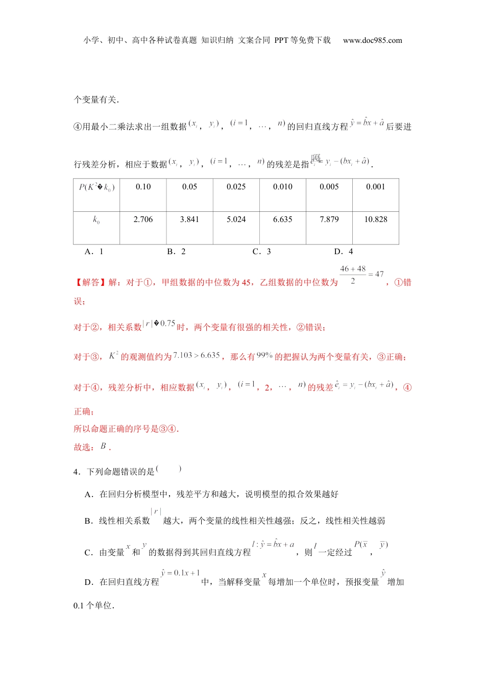 小学、初中、高中各种试卷真题知识归纳文案合同PPT等免费下载www.doc985.com跟踪训练07成对数据的统计分析一.选择题(共15小题)1.一组成对数据,,,,,,,,样本中心点为,由这组数据拟合的线性回归方程为,用最小二乘法求回归方程是为了使最小.A.总偏差平方和B.残差平方和C.回归平方和D.竖直距离和【解答】解:一组成对数据,,,,,,,,,由这组数据拟合的线性回归方程为,用最小二乘法求回归方程是为了使残差平方和最小.故选:.2.2003年春季,我国部分地区流行,党和政府采取果断措施,防治结合,很快使病小学、初中、高中各种试卷真题知识归纳文案合同PPT等免费下载www.doc985.com情得到控制,下表是某同学记载的5月1日至5月12日每天北京市治愈者数据,以及根据这些数据绘制出的散点图日期5.15.25.35.45.55.65.75.85.95.105.115.12人数100109115118121134141152168175186203下列说法:①根据此散点图,可以判断日期与人数具有线性相关关系;②根据此散点图,可以判断日期与人数具有一次函数关系.其中正确的个数为A.0个B.1个C.2个D.以上都不对【解答】解:根据数据,作出散点图,由散点图可知,日期与人数具有线性相关关系,所以①正确,②错误.故选:.3.下列四个命题中,正确命题的个数为①甲乙两组数据分别为:甲:28,31,39,42,45,55,57,58,66;;乙:,29,34,35,48,42,46,55,53,55,67.则甲乙的中位数分别为45和44.②相关系数,表明两个变量的相关性较弱.③若由一个列联表中的数据计算得的观测值,那么有的把握认为两小学、初中、高中各种试卷真题知识归纳文案合同PPT等免费下载www.doc985.com个变量有关.④用最小二乘法求出一组数据,,,,的回归直线方程后要进行残差分析,相应于数据,,,,的残差是指.0.100.050.0250.0100.0050.0012.7063.8415.0246.6357.87910.828A.1B.2C.3D.4【解答】解:对于①,甲组数据的中位数为45,乙组数据的中位数为,①错误;对于②,相关系数时,两个变量有很强的相关性,②错误;对于③,的观测值约为,那么有的把握认为两个变量有关,③正确;对于④,残差分析中,相应数据,,,2,,的残差,④正确;所以命题正确的序号是③④.故选:.4.下列命题错误的是A.在回归分析模型中,残差平方和越大,说明模型的拟合效果越好B.线性相关系数越大,两个变量的线性相关性越强;反之,线性相关性越弱C.由变量和的数据得到其回归直线方程,则一定经过,D.在回归直线方程中,当解释变量每增加一个单位时,预报变量增加0.1个单位.小学、初中、高中各种试卷真题知识归纳文案合同PPT等免费下载www.doc985.com【解答】解:比较两个模型的拟合效果,可以比较残差平方和的大小,残差平方和越小的模型,拟合效果越好,故错误;线性相关系数越大,两个变量的线性相关性越强;反之,线性相关性越弱,正确;回归直线方程,则一定经过,,正确;在回归直线方程中,当解释变量每增加一个单位时,预报变量增加0.1个单位,正确.故选:.5.2020年初,新型冠状病毒引起的肺炎疫情暴发以来,各地医疗机构采取了各种针对性的治疗方法,取得了不错的成效,某地开始使用中西医结合方法后,每周治愈的患者人数如表所示:周数12345治愈人数2173693142由表格可得关于的二次回归方程为,则此回归模型第2周的残差(实际值与预报值之差)为A.5B.4C.1D.0【解答】解:设,则,,,所以,令,得.故选:.小学、初中、高中各种试卷真题知识归纳文案合同PPT等免费下载www.doc985.com6.已知一组样本点,其中,2,3,,30,根据最小二乘法求得的回归直线方程是,则下列说法正确的是A.若所有样本点都在回归直线上,则变量间的相关系数为1B.至少有一个样本点落在回归直线上C.变量,之间的线性相关程度越强,其相关系数越接近1D.若的斜率,则变量与正相关【解答】解:选项,若所有样本点都在回归直线上,则变量间的相关系数的绝对值为1,相关系数,故错误;选项,回归直线必过样本点的中心,但样本点可能都不在回归直线上,故错误;选项,随机变量之间的线性相关程度越强,越接近1,故错误;选项,相关系数与符号相...