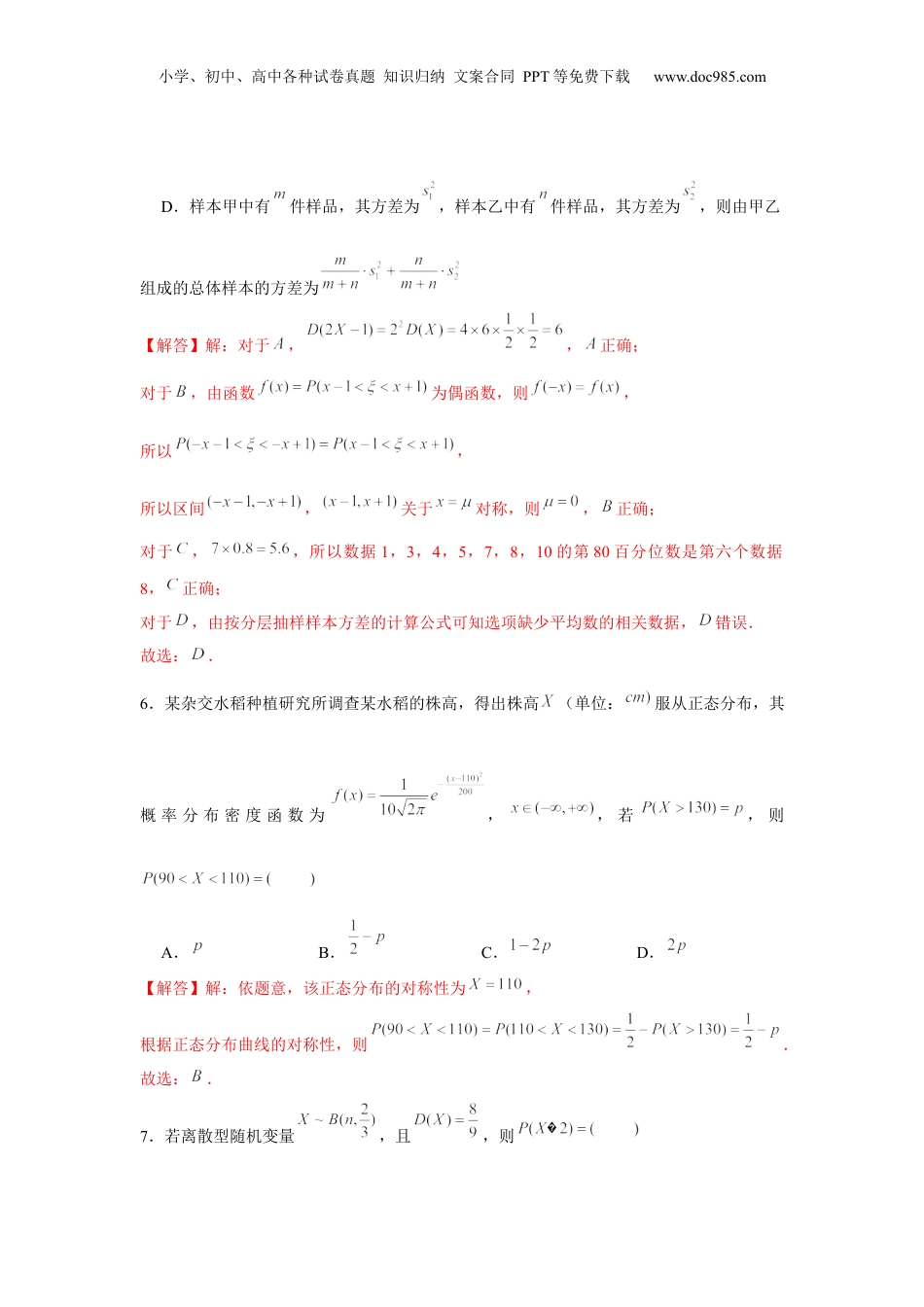 小学、初中、高中各种试卷真题知识归纳文案合同PPT等免费下载www.doc985.com跟踪训练05二项分布、超几何分布、正态分布一.选择题(共15小题)1.已知随机变量服从正态分布,若,则A.B.C.1D.4【解答】解:,,随机变量服从正态分布,,解得.故选:.2.已知随机变量服从二项分布,则A.B.C.D.【解答】解:由随机变量服从二项分布,可得.故选:.3.关于正态曲线的形状,下列描述正确的是A.由确定,越大,曲线越“矮胖”B.由确定,越大,曲线越“矮胖”C.由确定,越大,曲线越“高瘦”D.由确定,越大,曲线越“高瘦”小学、初中、高中各种试卷真题知识归纳文案合同PPT等免费下载www.doc985.com【解答】解:根据正态曲线的性质,可知正态曲线关于直线对称,在处达到最高点函数取得最大值,并由该点向左、右两边延伸时,曲线逐渐降低,决定曲线的位置和对称性:曲线的形状由确定,而且当一定时,比较若干个不同的对应的正态曲线可以发现.越大,曲线越矮胖,越小,曲线越高瘦综上所述,正确,、、错误.故选:.4.已知服从正态分布的随机变量在区间,,,和,内取值的概率分别为,和.若某校高二年级1000名学生的某次考试成绩服从正态分布,,则此次考试成绩在区间,内的学生大约有A.477人B.136人C.341人D.131人【解答】解:根据题意,根据正态分布的对称性,则,故此次考试成绩在区间,内的学生大约有136人.故选:.5.下列命题中错误的是A.已知随机变量,则B.已知随机变量,若函数为偶函数,则C.数据1,3,4,5,7,8,10的第80百分位数是8小学、初中、高中各种试卷真题知识归纳文案合同PPT等免费下载www.doc985.comD.样本甲中有件样品,其方差为,样本乙中有件样品,其方差为,则由甲乙组成的总体样本的方差为【解答】解:对于,,正确;对于,由函数为偶函数,则,所以,所以区间,关于对称,则,正确;对于,,所以数据1,3,4,5,7,8,10的第80百分位数是第六个数据8,正确;对于,由按分层抽样样本方差的计算公式可知选项缺少平均数的相关数据,错误.故选:.6.某杂交水稻种植研究所调查某水稻的株高,得出株高(单位:服从正态分布,其概率分布密度函数为,,若,则A.B.C.D.【解答】解:依题意,该正态分布的对称性为,根据正态分布曲线的对称性,则.故选:.7.若离散型随机变量,且,则小学、初中、高中各种试卷真题知识归纳文案合同PPT等免费下载www.doc985.comA.B.C.D.【解答】解:,,解得,.故选:.8.已知函数在上单调递减的概率为,且随机变量,则(附:若,则,,A.0.1359B.0.01587C.0.0214D.0.01341【解答】解:根据题意在上单调递减,可得,故,,,.故选:.9.已知随机变量,若,则A.0.64B.0.32C.0.36D.0.72【解答】解:随机变量服从正态分布,小学、初中、高中各种试卷真题知识归纳文案合同PPT等免费下载www.doc985.com曲线关于对称,.故选:.10.已知随机变量,且,则的最大值为A.B.C.D.【解答】解:因为随机变量,且,所以,即,所以,所以,令,,所以,又,当且仅当,即时取等号,所以,即的最大值为.故选:.11.南沿江高铁即将开通,某小区居民前往高铁站有①,②两条路线可走,路线①穿过市区,路程较短但交通拥挤,经测算所需时间(单位为分钟)服从正态分布;路线②骑共享单车到地铁站,乘地铁前往,路程长,但意外阻塞较少,经测算所需时间(单位小学、初中、高中各种试卷真题知识归纳文案合同PPT等免费下载www.doc985.com为分钟)服从正态分布.该小区的甲乙两人分别有70分钟与64分钟可用,要使两人按时到达车站的可能性更大,则甲乙选择的路线分别为A.①、①B.①、②C.②、①D.②、②【解答】解:对于甲:有70分钟可走,若走第一条路:则(2),若走第二条路:则,因为(2),故甲走路线②,对于乙:有64分钟可走,若走第一条路:则,若走第二条路:则(1),因为(1),故乙走路线①.故选:.12.已知随机变量,则的值为A.B.C.D.【解答】解:随机变量,则的可能取值为0,1,2,3,4,,则.故选:.13.“杂交水稻之父”袁隆平一生致力于杂交水稻技术的研究,创建了超级杂交稻技...