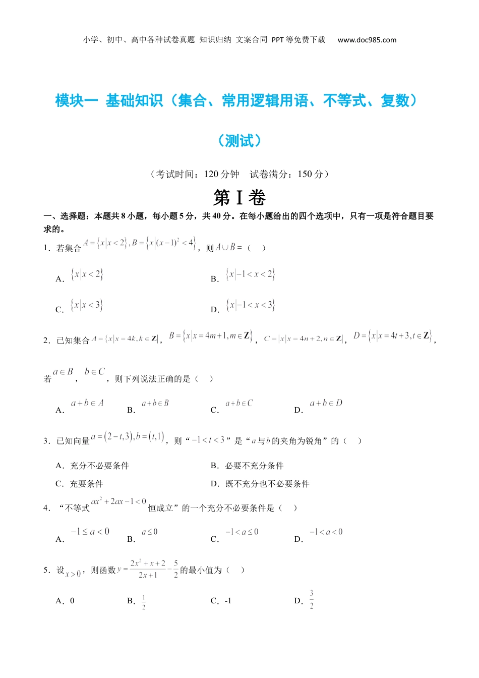 小学、初中、高中各种试卷真题知识归纳文案合同PPT等免费下载www.doc985.com模块一基础知识(集合、常用逻辑用语、不等式、复数)(测试)(考试时间:120分钟试卷满分:150分)第Ⅰ卷一、选择题:本题共8小题,每小题5分,共40分。在每小题给出的四个选项中,只有一项是符合题目要求的。1.若集合,则()A.B.C.D.2.已知集合,,,,若,,则下列说法正确的是()A.B.C.D.3.已知向量,则“”是“与的夹角为锐角”的()A.充分不必要条件B.必要不充分条件C.充要条件D.既不充分也不必要条件4.“不等式恒成立”的一个充分不必要条件是()A.B.C.D.5.设,则函数的最小值为()A.0B.C.-1D.小学、初中、高中各种试卷真题知识归纳文案合同PPT等免费下载www.doc985.com6.是虚数单位,复数满足,其中.:“复数在复平面内对应的点在第一象限”,则下列条件是的充分不必要条件的是()A.B.C.D.7.已知关于的不等式组仅有一个整数解,则的取值范围为()A.B.C.D.8.设S是整数集Z的非空子集,如果任意的,有,则称S关于数的乘法是封闭的.若、是Z的两个没有公共元素的非空子集,.若任意的,有,同时,任意的,有,则下列结论恒成立的是()A.、中至少有一个关于乘法是封闭的B.、中至多有一个关于乘法是封闭的C.、中有且只有一个关于乘法是封闭的D.、中每一个关于乘法都是封闭的二、选择题:本题共4小题,每小题5分,共20分。在每小题给出的选项中,有多项符合题目要求。全部选对的得5分,部分选对的得2分,有选错的得0分。9.已知表示集合的整数元素的个数,若集合()A.B.C.D.小学、初中、高中各种试卷真题知识归纳文案合同PPT等免费下载www.doc985.com10.下列结论正确的是()A.若a,b为正实数,,则B.若a,b,m为正实数,,则C.若,则“”是“”的充分不必要条件D.不等式成立的充分不必要条件是,则m的取值范围是11.设,,是复数,则下列说法中正确的是()A.若,则或B.若且,则C.若,则D.若,则12.若,,且,则下列说法正确的是()A.有最大值B.有最大值2C.有最小值4D.有最小值第Ⅱ卷三、填空题:本题共4小题,每小题5分,共20分。13.设命题:,.写出一个实数,使得为真命题.14.“生命在于运动”,某学校教师在普及程度比较高的三个体育项目——乒乓球、羽毛球、篮球中,会打乒乓球的教师人数为30,会打羽毛球的教师人数为60,会打篮球的教师人数为20,若会至少其中一个体育项目的教师人数为80,且三个体育项目都会的教师人数为5,则会且仅会其中两个体育项目的教师人数为.15.若复数z满足,则的最小值为16.已知正实数,满足,则的最小值为.小学、初中、高中各种试卷真题知识归纳文案合同PPT等免费下载www.doc985.com四、解答题:本题共6小题,共70分。解答应写出文字说明、证明过程或演算步棸。17.(10分)设命题:“对任意,恒成立”.且命题为真命题.(1)求实数的取值集合;(2)在(1)的条件下,设非空集合,若“”是“”的充分条件,求实数的取值范围.18.(12分)已知复数,,其中i为虚数单位,且满足,且为纯虚数.(1)若复数,在复平面内对应点在第一象限,求复数z;(2)求;(3)若在(1)中条件下的复数z是关于x的方程的一个根,求实数m,n的值.19.(12分)第31届世界大学生夏季运动会将于2023年7月28日至8月8日在四川成都举行,某公司为了竞标配套活动的相关代言,决定对旗下的某商品进行一次评估.该商品原来每件售价为25元,年销售8万件.(1)据市场调查,若价格每提高1元,销售量将相应减少2000件,要使销售的总收入不低于原收入,该商品每件定价最多为多少元?(2)为了抓住此次契机,扩大该商品的影响力,提高年销售量,公司决定立即对该商品进行全面技术革新和小学、初中、高中各种试卷真题知识归纳文案合同PPT等免费下载www.doc985.com营销策略改革,并提高定价到元.公司拟投入万元作为技改费用,投入50万元作为固定宣传费用,投入万元作为浮动宣传费用.试问:当该商品改革后的销售量至少应达到多少万件时,才可能使改革后的销售收入不低于原收入与总投入之和?并求出此时商品的每件定价.20.(12分)已知关于...