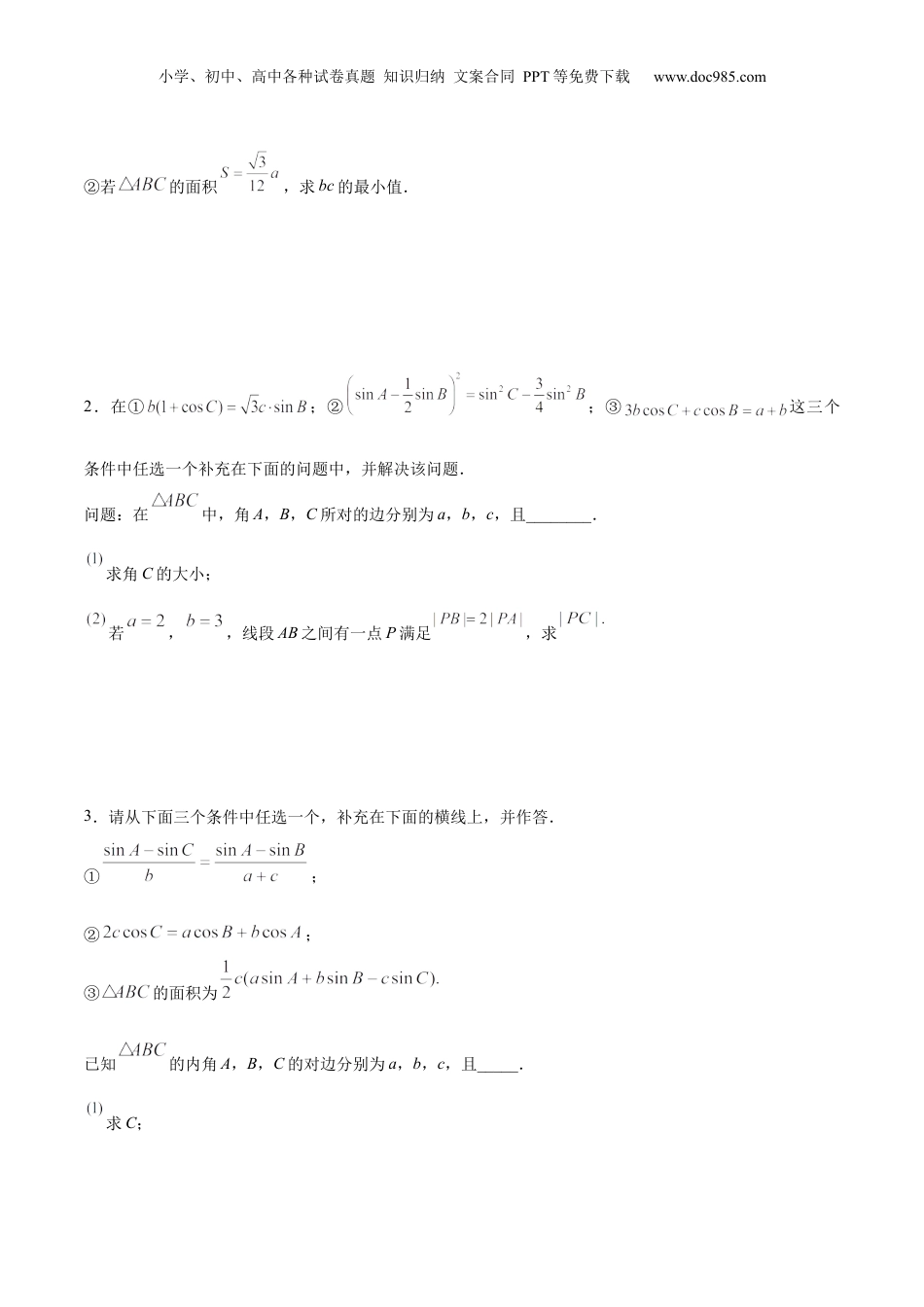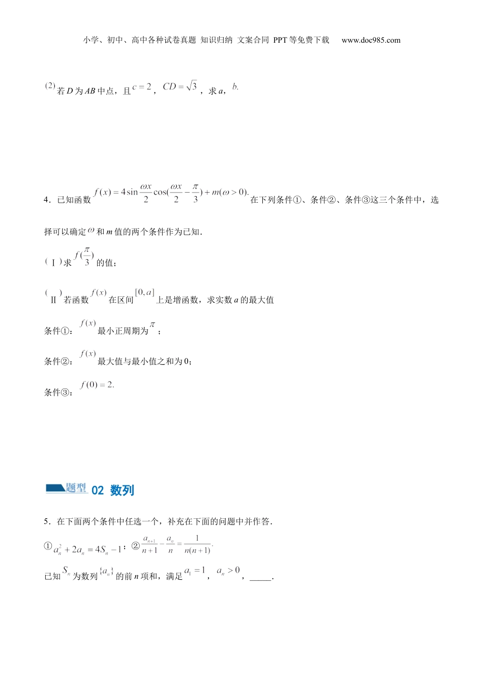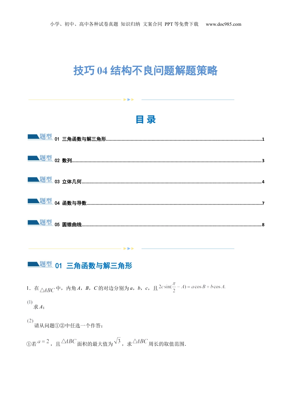 小学、初中、高中各种试卷真题知识归纳文案合同PPT等免费下载www.doc985.com技巧04结构不良问题解题策略目录01三角函数与解三角形........................................................................................................................102数列..................................................................................................................................................303立体几何...........................................................................................................................................404函数与导数.......................................................................................................................................705圆锥曲线...........................................................................................................................................801三角函数与解三角形1.在中,内角A,B,C的对边分别为a,b,c,且求A;请从问题①②中任选一个作答:①若,且面积的最大值为,求周长的取值范围.小学、初中、高中各种试卷真题知识归纳文案合同PPT等免费下载www.doc985.com②若的面积,求bc的最小值.2.在①;②;③这三个条件中任选一个补充在下面的问题中,并解决该问题.问题:在中,角A,B,C所对的边分别为a,b,c,且________.求角C的大小;若,,线段AB之间有一点P满足,求3.请从下面三个条件中任选一个,补充在下面的横线上,并作答.①;②;③的面积为已知的内角A,B,C的对边分别为a,b,c,且_____.求C;小学、初中、高中各种试卷真题知识归纳文案合同PPT等免费下载www.doc985.com若D为AB中点,且,,求a,4.已知函数在下列条件①、条件②、条件③这三个条件中,选择可以确定和m值的两个条件作为已知.Ⅰ求的值;Ⅱ若函数在区间上是增函数,求实数a的最大值条件①:最小正周期为;条件②:最大值与最小值之和为0;条件③:02数列5.在下面两个条件中任选一个,补充在下面的问题中并作答.①;②已知为数列的前n项和,满足,,_____.小学、初中、高中各种试卷真题知识归纳文案合同PPT等免费下载www.doc985.com求数列的通项公式;设,求数列的前项和6.已知数列,若__________.求数列的通项公式求数列的前n项和从下列个条件中任选一个补充在上面的横线上,然后对题目进行求解.①②,,③,点,在斜率是2的直线上7.设等差数列的前n项和为,,求数列的通项公式及;若_____,求数列的前n项和在①;②;③这三个条件中任选一个补充在第问中,并对其求解.小学、初中、高中各种试卷真题知识归纳文案合同PPT等免费下载www.doc985.com8.已知等比数列的各项都为正数,,,数列的首项为1,且前n项和为,再从下面①②③中选择一个作为条件,判断是否存在,使得,恒成立?若存在,求出m的值;若不存在,说明理由,①②,③03立体几何9.如图,在四棱锥中,底面ABCD为正方形,平面平面ABCD,,,E,F分别为BC,PD的中点.Ⅰ求证:平面PAB;Ⅱ再从条件①、条件②这两个条件中选择一个作为已知,求二面角的余弦值.条件①:;条件②:注:如果选择条件①和条件②分别解答,按第一个解答计分.小学、初中、高中各种试卷真题知识归纳文案合同PPT等免费下载www.doc985.com10.如图,圆台上底面半径为1,下底面半径为,AB为圆台下底面的一条直径,圆上点C满足,是圆台上底面的一条半径,点P,C在平面的同侧,且证明:平面从条件①、条件②这两个条件中选择一个作为已知,求直线与平面PBC所成角的正弦值.条件①三棱锥的体积为条件②与圆台底面的夹角的正切值为小学、初中、高中各种试卷真题知识归纳文案合同PPT等免费下载www.doc985.com11.如图,在三棱柱中,侧面为正方形,平面平面,,M,N分别为,AC的中点.求证:平面再从条件①、条件②这两个条件中选择一个作为已知,求直线AB与平面BMN所成角的正弦值.条件①条件②注:如果选择条件①和条件②分别解答,按第一个解答计分.12.如图,直四棱柱中,是等边三角形,从...