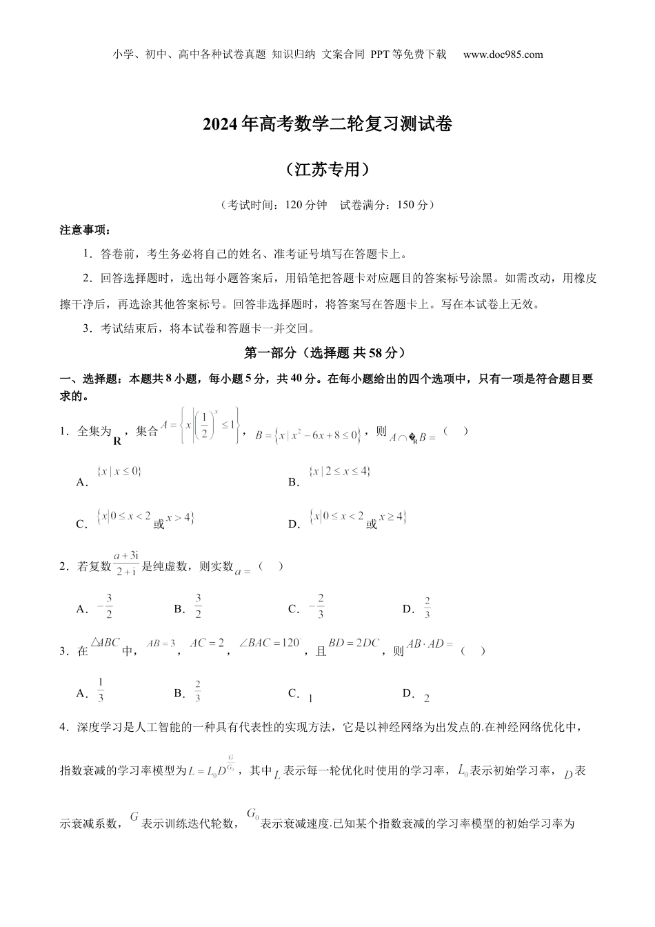 小学、初中、高中各种试卷真题知识归纳文案合同PPT等免费下载www.doc985.com2024年高考数学二轮复习测试卷(江苏专用)(考试时间:120分钟试卷满分:150分)注意事项:1.答卷前,考生务必将自己的姓名、准考证号填写在答题卡上。2.回答选择题时,选出每小题答案后,用铅笔把答题卡对应题目的答案标号涂黑。如需改动,用橡皮擦干净后,再选涂其他答案标号。回答非选择题时,将答案写在答题卡上。写在本试卷上无效。3.考试结束后,将本试卷和答题卡一并交回。第一部分(选择题共58分)一、选择题:本题共8小题,每小题5分,共40分。在每小题给出的四个选项中,只有一项是符合题目要求的。1.全集为,集合,,则()A.B.C.或D.或2.若复数是纯虚数,则实数()A.B.C.D.3.在中,,,,且,则()A.B.C.D.4.深度学习是人工智能的一种具有代表性的实现方法,它是以神经网络为出发点的.在神经网络优化中,指数衰减的学习率模型为,其中表示每一轮优化时使用的学习率,表示初始学习率,表示衰减系数,表示训练迭代轮数,表示衰减速度.已知某个指数衰减的学习率模型的初始学习率为小学、初中、高中各种试卷真题知识归纳文案合同PPT等免费下载www.doc985.com0.5,衰减速度为22,且当训练迭代轮数为22时,学习率衰减为0.45,则学习率衰减到0.05以下(不含)所需的训练迭代轮数至少为()(参考数据:,)A.11B.22C.227D.4815.已知,设椭圆:与双曲线:的离心率分别为,.若,则双曲线的渐近线方程为()A.B.C.D.6.在中,角,,所对的边分别为,,,若,,,成等差数列,则().A.B.C.D.7.若平面内分别到定点的距离之差为6的点的轨迹是曲线,过点且斜率为的直线与曲线交于两点(点在轴上方).设的内切圆半径分别为,则()A.2B.3C.D.8.已知,,,则()A.B.C.D.二、选择题:本题共3小题,每小题6分,共18分.在每小题给出的选项中,有多项符合题目要求.全部选对的得6分,部分选对的得部分分,有选错的得0分.小学、初中、高中各种试卷真题知识归纳文案合同PPT等免费下载www.doc985.com9.已知,函数的最小正周期为,则下列结论正确的是()A.B.函数在区间上单调递增C.将函数的图象向左平移个单位长度可得函数的图象D.函数的图象关于直线对称10.在正方体中,,分别为线段,上的动点,则()A.存在,两点,使得B.C.与所成的最大角为D.与平面所成的最大角的正弦值为11.某商场设有电子盲盒机,每个盲盒外观完全相同,规定每个玩家只能用一个账号登陆,且每次只能随机选择一个开启.已知玩家第一次抽盲盒,抽中奖品的概率为,从第二次抽盲盒开始,若前一次没抽中奖品,则这次抽中的概率为,若前一次抽中奖品,则这次抽中的概率为.记玩家第次抽盲盒,抽中奖品的概率为,则下列结论中正确的是()A.B.数列为等比数列C.D.当时,越大,越小小学、初中、高中各种试卷真题知识归纳文案合同PPT等免费下载www.doc985.com第二部分(非选择题共92分)三、填空题:本题共3小题,每小题5分,共15分。12.已知圆,直线,圆上恰好有两个点到直线的距离等于1.则符合条件的实数可以为.(只需写出一个满足条件的实数即可)13.招待客人时,人们常使用一次性纸杯,将其视为圆台,设其杯底直径为,杯口直径为,高为ℎ,将该纸杯装满水(水面与杯口齐平)后,再将一直径为的小铁球缓慢放入杯中,待小铁球完全沉入水中并静止后,从杯口溢出水的体积为纸杯容积的,则14.函数的图象与直线的交点个数为.四、解答题:本题共5小题,共77分。解答应写出文字说明、证明过程或演算步棸。15.(13分)如图所示,圆台的上、下底面圆半径分别为和,为圆台的两条不同的母线.(1)求证:;(2)截面与下底面所成的夹角大小为,且截面截得圆台上底面圆的劣弧的长度为,求截面的面积.小学、初中、高中各种试卷真题知识归纳文案合同PPT等免费下载www.doc985.com16.(15分)我校教研处为了解本校学生在疫情期间居家自主学习情况,随机调查了120个学生,得到这些学生5天内每天坚持自主学习时长(单位:小时)的频数分布表,假如每人学习时间长均不超过5小时.时长学生数302440161...