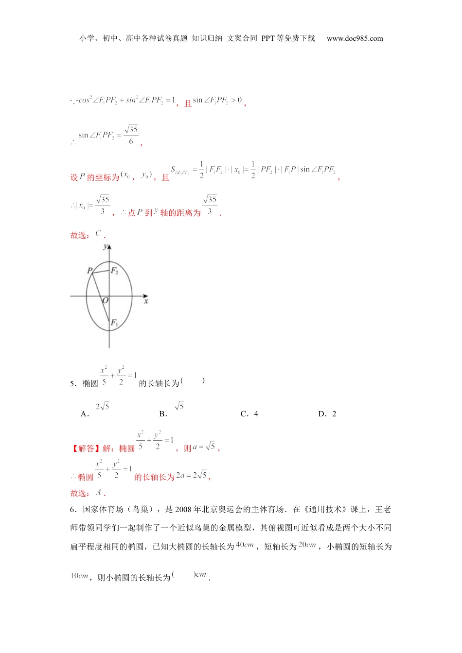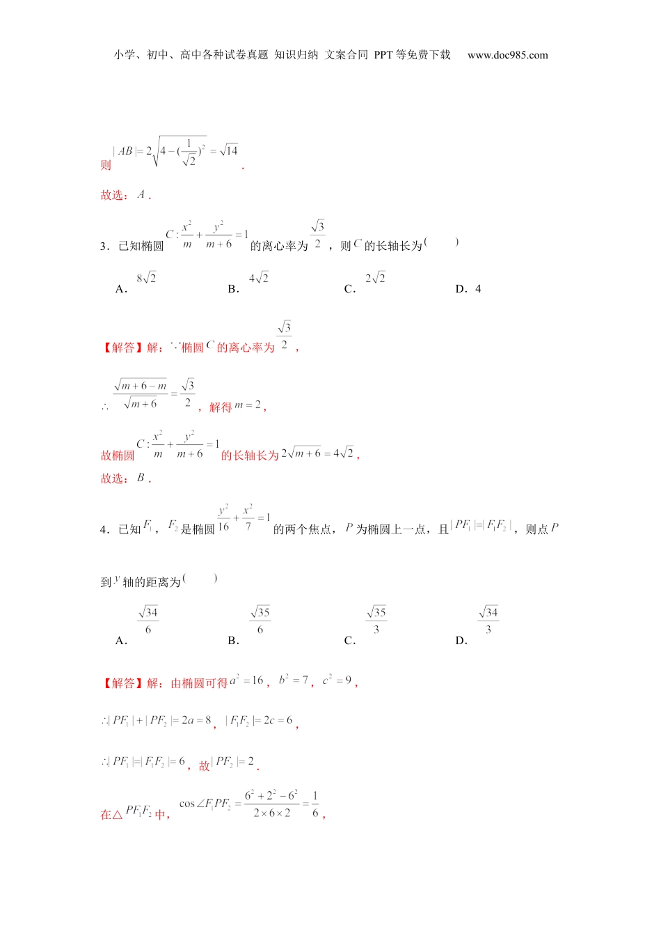 小学、初中、高中各种试卷真题知识归纳文案合同PPT等免费下载www.doc985.com跟踪训练04椭圆一.选择题(共15小题)1.直线与椭圆的一个交点坐标为A.B.C.D.【解答】解:联立,可得,解得或,当时,;当时,;所以直线与椭圆的交点坐标为.故选:.2.已知椭圆的左焦点是,过的直线与圆:交于,两点,则的长为A.B.C.2D.【解答】解:由题意可得,则过的直线.圆:的圆心,半径为2,直线与圆:交于,两点,小学、初中、高中各种试卷真题知识归纳文案合同PPT等免费下载www.doc985.com则.故选:.3.已知椭圆的离心率为,则的长轴长为A.B.C.D.4【解答】解:椭圆的离心率为,,解得,故椭圆的长轴长为,故选:.4.已知,是椭圆的两个焦点,为椭圆上一点,且,则点到轴的距离为A.B.C.D.【解答】解:由椭圆可得,,,,,,故.在△中,,小学、初中、高中各种试卷真题知识归纳文案合同PPT等免费下载www.doc985.com,且,,设的坐标为,,且,,点到轴的距离为.故选:.5.椭圆的长轴长为A.B.C.4D.2【解答】解:椭圆,则,椭圆的长轴长为,故选:.6.国家体育场(鸟巢),是2008年北京奥运会的主体育场.在《通用技术》课上,王老师带领同学们一起制作了一个近似鸟巢的金属模型,其俯视图可近似看成是两个大小不同扁平程度相同的椭圆,已知大椭圆的长轴长为,短轴长为,小椭圆的短轴长为,则小椭圆的长轴长为.小学、初中、高中各种试卷真题知识归纳文案合同PPT等免费下载www.doc985.comA.30B.20C.D.10【解答】解:扁平程度相同的椭圆,即离心率相等,大椭圆,离心率为,小椭圆,离心率,解得,故长轴长为20.故选:.7.椭圆的焦距是A.B.C.4D.8【解答】解:椭圆中,,,故,所以椭圆的焦距是.故选:.8.已知点,分别是椭圆的左、右焦点,点在此椭圆上,则△的周长等于A.16B.20C.18D.14【解答】解:椭圆的长半轴长,短半轴长,半焦距,由椭圆定义知,焦距,小学、初中、高中各种试卷真题知识归纳文案合同PPT等免费下载www.doc985.com所以△的周长等于.故选:.9.若过椭圆内一点的弦被该点平分,则该弦所在的直线方程为A.B.C.D.【解答】解:设该弦所在的直线方程与椭圆交于、两点,且,,,,则,,则,①,②①②得:,则,即该弦所在的直线方程为:,即,故选:.10.2022年10月7日21时10分,中国太原卫星发射中心在黄海海域使用长征十一号海射运载火箭,采用“一箭双星”方式,成功将微厘空间北斗低轨导航增强系统试验卫星发射升空,卫星顺利进入预定轨道,发射任务获得圆满成功,其中的“地球同步转移轨小学、初中、高中各种试卷真题知识归纳文案合同PPT等免费下载www.doc985.com道”是一个以地心(地球的中心)为一个焦点的椭圆,如图,已知它的近地点(离地面最近的点)距地面天文单位,远地点(离地面最远的点)距地面天文单位,并且,,在同一直线上,地球半径约为天文单位,则卫星轨道的离心率为A.B.C.D.【解答】解:设椭圆方程为,由题意得,,则椭圆长轴长为,即,设椭圆的左焦点为由对称性可知,,由椭圆定义可知,,即离心率为.故选:.11.如图,一种电影放映灯的反射镜面是旋转椭圆面(椭圆绕其对称轴旋转一周形成的曲面)的一部分.过对称轴的截口是椭圆的一部分,灯丝位于椭圆的一个焦点上,片门位于另一个焦点上.由椭圆的一个焦点发出的光线,经过旋转椭圆面反射后集中到另一个焦点.已知,,.若透明窗所在的直线与截口小学、初中、高中各种试卷真题知识归纳文案合同PPT等免费下载www.doc985.com所在的椭圆交于一点,且,则△的面积为A.2B.C.D.5【解答】解:由,得,则椭圆长轴长,由点在椭圆上,得,又,则,因此,所以△的面积为.故选:.12.已知椭圆,直线,则椭圆上的点到直线的距离的最大值是A.B.C.D.【解答】解:椭圆和直线,设椭圆上的点,小学、初中、高中各种试卷真题知识归纳文案合同PPT等免费下载www.doc985.com椭圆上的点到直线的距离:,其中,当时,椭圆上的点到直线的距离取最大值:.故选:.13.已知椭圆的左顶点为,上顶点为,右焦点为,若,则椭圆的离心率为A.B.C.D.【解答】解:由...