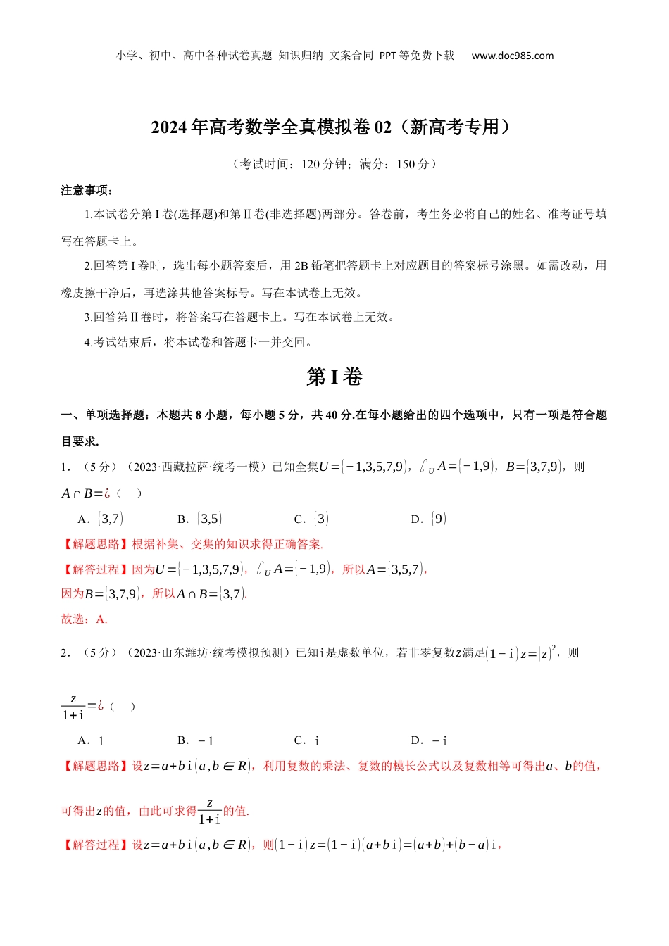 小学、初中、高中各种试卷真题知识归纳文案合同PPT等免费下载www.doc985.com2024年高考数学全真模拟卷02(新高考专用)(考试时间:120分钟;满分:150分)注意事项:1.本试卷分第I卷(选择题)和第Ⅱ卷(非选择题)两部分。答卷前,考生务必将自己的姓名、准考证号填写在答题卡上。2.回答第I卷时,选出每小题答案后,用2B铅笔把答题卡上对应题目的答案标号涂黑。如需改动,用橡皮擦干净后,再选涂其他答案标号。写在本试卷上无效。3.回答第Ⅱ卷时,将答案写在答题卡上。写在本试卷上无效。4.考试结束后,将本试卷和答题卡一并交回。第I卷一、单项选择题:本题共8小题,每小题5分,共40分.在每小题给出的四个选项中,只有一项是符合题目要求.1.(5分)(2023·西藏拉萨·统考一模)已知全集U={−1,3,5,7,9),∁UA={−1,9),B={3,7,9),则A∩B=¿()A.{3,7)B.{3,5)C.{3)D.{9)【解题思路】根据补集、交集的知识求得正确答案.【解答过程】因为U={−1,3,5,7,9),∁UA={−1,9),所以A={3,5,7),因为B={3,7,9),所以A∩B={3,7).故选:A.2.(5分)(2023·山东潍坊·统考模拟预测)已知i是虚数单位,若非零复数z满足(1−i)z=|z)2,则z1+i=¿()A.1B.−1C.iD.−i【解题思路】设z=a+bi(a,b∈R),利用复数的乘法、复数的模长公式以及复数相等可得出a、b的值,可得出z的值,由此可求得z1+i的值.【解答过程】设z=a+bi(a,b∈R),则(1−i)z=(1−i)(a+bi)=(a+b)+(b−a)i,小学、初中、高中各种试卷真题知识归纳文案合同PPT等免费下载www.doc985.com由(1−i)z=|z)2可得(a+b)+(b−a)i=a2+b2,所以,{a+b=a2+b2b−a=0),又因为z≠0,所以,a=b=1,则z=1+i,故z1+i=1.故选:A.3.(5分)(2023·全国·模拟预测)已知向量⃗a=(x,1),⃗b=(2,y),⃗c=(x,y).若(⃗a+⃗b)⊥(⃗a−⃗b),且⃗a//⃗b,则¿⃗c∨¿()A.❑√2B.❑√3C.❑√5D.❑√6【解题思路】利用向量的数量积运算将向量垂直的条件转化为(⃗a+⃗b)⋅(⃗a−⃗b)=⃗a2−⃗b2=0,然后利用向量的模的坐标运算公式和向量共线的坐标关系得到方程组,求解即得x,y的值,进而计算向量⃗c=(x,y)的模.【解答过程】因为⃗a=(x,1),⃗b=(2,y),由(⃗a+⃗b)⊥(⃗a−⃗b)可得,(⃗a+⃗b)⋅(⃗a−⃗b)=⃗a2−⃗b2=0,即(x2+1)−(4+y2)=0,整理得x2−y2=3.又因为⃗a∥⃗b,所以xy=2,联立¿,解得{x=2y=1)或{x=−2y=−1),故¿⃗c∨¿❑√x2+y2=❑√5,故选C.4.(5分)(2023·江苏苏州·校联考模拟预测)江南的周庄、同里、甪直、西塘、鸟镇、南浔古镇,并称为“江南六大古镇”,是中国江南水乡风貌最具代表的城镇,它们以其深邃的历史文化底蕴、清丽婉约的水乡古镇风貌、古朴的吴侬软语民俗风情,在世界上独树一帜,驰名中外.这六大古镇中,其中在苏州境内的有3处.某家庭计划今年暑假从这6个古镇中挑选2个去旅游,则只选一个苏州古镇的概率为()A.25B.35C.15D.45【解题思路】应用组合数求出所有可能情况数,应用古典概型的概率求法求概率即可.小学、初中、高中各种试卷真题知识归纳文案合同PPT等免费下载www.doc985.com【解答过程】从这6个古镇中挑选2个去旅游的可能情况有C62=15种情况,只选一个苏州古镇的概率为P=C31C3115=35.故选:B.5.(5分)(2023·全国·模拟预测)记Sn为等差数列{an)的前n项和,已知a2=1,S4=8.若Sn−2an=6,则n=¿()A.5B.6C.7D.8【解题思路】设等差数列{an)的公差为d,由等差数列的通项公式和前n项和公式列方程组,解方程求出a1,d,即可求出an,Sn,代入Sn−2an=6即可得出答案.【解答过程】设等差数列{an)的公差为d.由条件可知{a1+d=1,4a1+6d=8,)解得{a1=−1,d=2,)所以an=−1+2(n−1)=2n−3,Sn=n(−1+2n−3)2=n2−2n.由Sn−2an=6,得n2−2n−2(2n−3)=6,即n2−6n=0,解得n=6(n=0舍去).故选:B.6.(5分)(2023·山东·山东省校联考模拟预测)已知函数f(x)=Asin(ωx+φ)(A>0,ω>0)的部分图象,则f(π3)=¿()A.−1B.−❑√2C.−❑√3D.−2【解题思路】由图象求得函数解析式,可求f(π3).【解答过程】函数f(x)=Asin(ωx+φ),小学、初中、高中各种试卷真题知识归纳文案合同PPT等免费下载w...