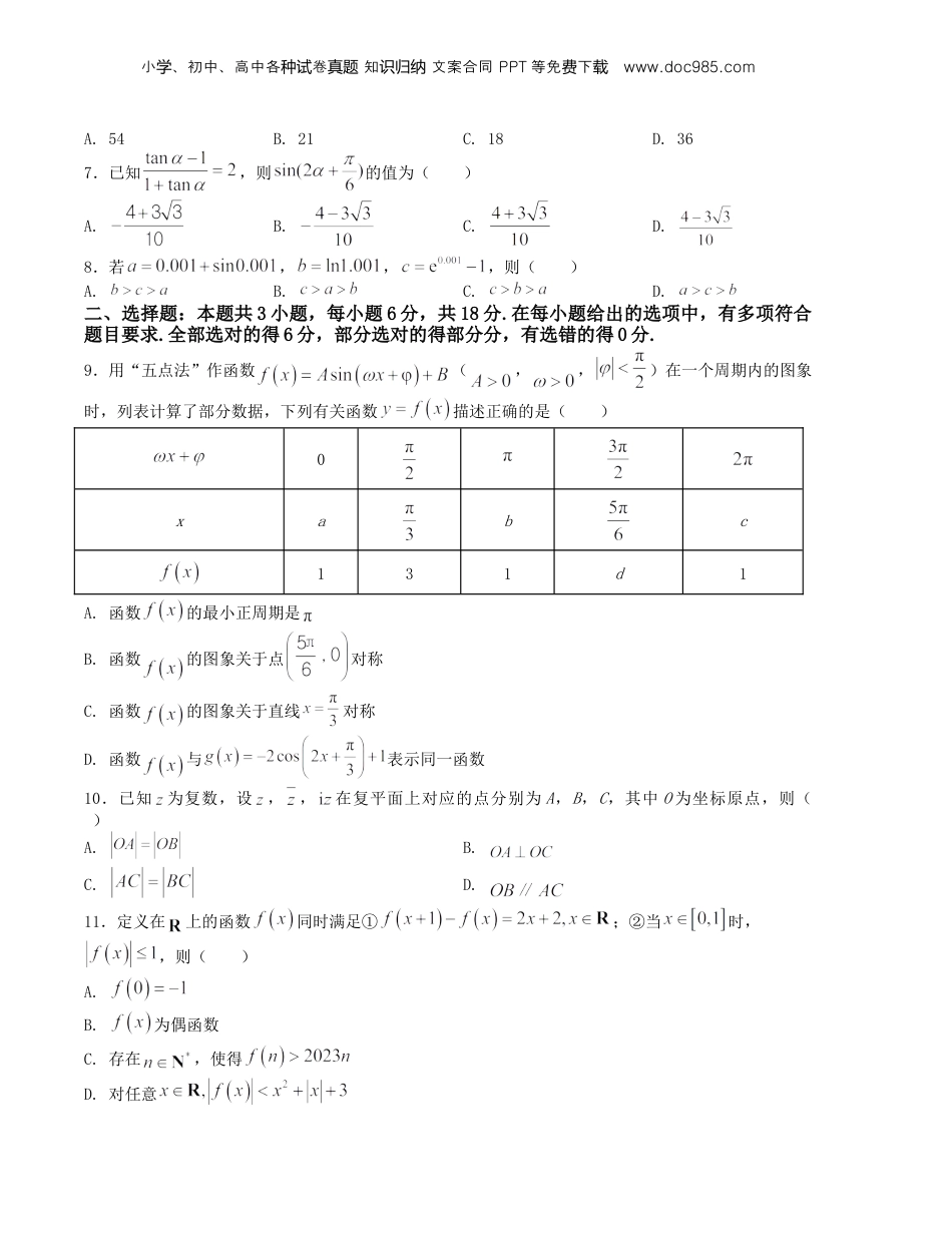 小、初中、高中各卷知文案合同学种试真题识归纳PPT等免下费载www.doc985.com2024届高三二轮复习“8+3+3”小题强化训练(16)一、选择题:本题共8小题,每小题5分,共40分.在每小题给出的四个选项中,只有一项是符合题目要求的.1.已知集合,则()A.B.C.D.2.某班的全体学生参加数学测试,成绩的频率分布直方图如图,数据的分组依次为,,,.若低于60分的人数是15,则该班的学生人数是()A.40B.45C.50D.603.已知直线与曲线在点处的切线垂直,则直线的斜率为()A.-1B.1C.D.24.若数列的前项和,则数列的前项和()A.B.C.D.5.如图,为圆锥底面圆的一条直径,点为线段的中点,现沿将圆锥的侧面展开,所得的平面图形中为直角三角形,若,则圆锥的表面积为()A.B.C.D.6.2024年伊始,随着“广西沙糖桔”“马铃薯公主”等热梗的不断爆出,哈尔滨火爆出圈,成为旅游城市中的“顶流”.某班级五位同学也准备共赴一场冰雪之约,制定了“南方小土豆,勇闯哈尔滨”的出游计划,这五位同学准备在行程第一天在圣索菲亚教堂,冰雪大世界,中央大街三个景点中选择一个去游玩,已知每个景点至少有一位同学会选,五位同学都会进行选择并且只能选择其中一个景点,若学生甲和学生乙准备选同一个景点,则不同的选法种数是()小、初中、高中各卷知文案合同学种试真题识归纳PPT等免下费载www.doc985.comA.54B.21C.18D.367.已知,则的值为()A.B.C.D.8.若,,,则()A.B.C.D.二、选择题:本题共3小题,每小题6分,共18分.在每小题给出的选项中,有多项符合题目要求.全部选对的得6分,部分选对的得部分分,有选错的得0分.9.用“五点法”作函数(,,)在一个周期内的图象时,列表计算了部分数据,下列有关函数描述正确的是()0xabc131d1A.函数的最小正周期是B.函数的图象关于点对称C.函数的图象关于直线对称D.函数与表示同一函数10.已知为复数,设,,在复平面上对应的点分别为A,B,C,其中O为坐标原点,则()A.B.C.D.11.定义在上的函数同时满足①;②当时,,则()A.B.为偶函数C.存在,使得D.对任意小、初中、高中各卷知文案合同学种试真题识归纳PPT等免下费载www.doc985.com三、填空题:本题共3小题,每小题5分,共15分.12.已知向量,为单位向量,且满足,则向量在向量方向的投影向量为________13.若正四面体的顶点都在一个表面积为的球面上,过点且与平行的平面分别与棱交于点,则空间四边形的四条边长之和的最小值为__________.14.已知是双曲线上任意一点,若到的两条渐近线的距离之积为,则上的点到焦点距离的最小值为__________.