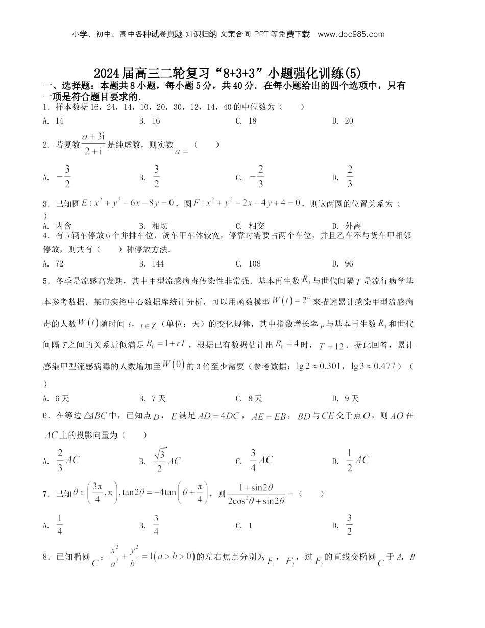 小、初中、高中各卷知文案合同学种试真题识归纳PPT等免下费载www.doc985.com2024届高三二轮复习“8+3+3”小题强化训练(5)一、选择题:本题共8小题,每小题5分,共40分.在每小题给出的四个选项中,只有一项是符合题目要求的.1.样本数据16,24,14,10,20,30,12,14,40的中位数为()A.14B.16C.18D.202.若复数是纯虚数,则实数()A.B.C.D.3.已知圆,圆,则这两圆的位置关系为()A.内含B.相切C.相交D.外离4.有5辆车停放6个并排车位,货车甲车体较宽,停靠时需要占两个车位,并且乙车不与货车甲相邻停放,则共有()种停放方法.A.72B.144C.108D.965.冬季是流感高发期,其中甲型流感病毒传染性非常强.基本再生数与世代间隔是流行病学基本参考数据.某市疾控中心数据库统计分析,可以用函数模型来描述累计感染甲型流感病毒的人数随时间t,(单位:天)的变化规律,其中指数增长率与基本再生数和世代间隔T之间的关系近似满足,根据已有数据估计出时,.据此回答,累计感染甲型流感病毒的人数增加至的3倍至少需要(参考数据:,)()A.6天B.7天C.8天D.9天6.在等边中,已知点,满足,,与交于点,则在上的投影向量为()A.B.C.D.7.已知,则()A.B.C.1D.8.已知椭圆:的左右焦点分别为,,过的直线交椭圆于A,B小、初中、高中各卷知文案合同学种试真题识归纳PPT等免下费载www.doc985.com两点,若,点满足,且,则椭圆C的离心率为()A.B.C.D.二、选择题:本题共3小题,每小题6分,共18分.在每小题给出的选项中,有多项符合题目要求.全部选对的得6分,部分选对的得部分分,有选错的得0分.9.某学校高一年级学生有900人,其中男生500人,女生400人,为了获得该校高一全体学生的身高信息,现采用样本量比例分配的分层随机抽样方法抽取了容量为180的样本,经计算得男生样本的均值为170,方差为19,女生样本的均值为161,方差为28,则下列说法中正确的是()A.男生样本容量为100B.抽取的样本的方差为43C.抽取的样本的均值为166D.抽取的样本的均值为165.510.在前n项和为的正项等比数列中,,,,则()A.B.C.D.数列中的最大项为11.已知双曲线的左、右焦点分别为、,过左焦点的直线与双曲线的左支相交于两点(在第二象限),点与关于坐标原点对称,点的坐标为),则下列结论正确的是()A.记直线、的斜率分別为、,则3B.若,则C.的最小值为6D.的取值范围是三、填空题:本题共3小题,每小题5分,共15分.12.已知平面向量满足,,,则向量夹角的余弦值为__________.13.若函数在区间内没有零点,则正数ω的取值范围是____.14.在四面体中,,若,则四面体体积的最大值是__________,它的外接球表面积的最小值为__________.小、初中、高中各卷知文案合同学种试真题识归纳PPT等免下费载www.doc985.com