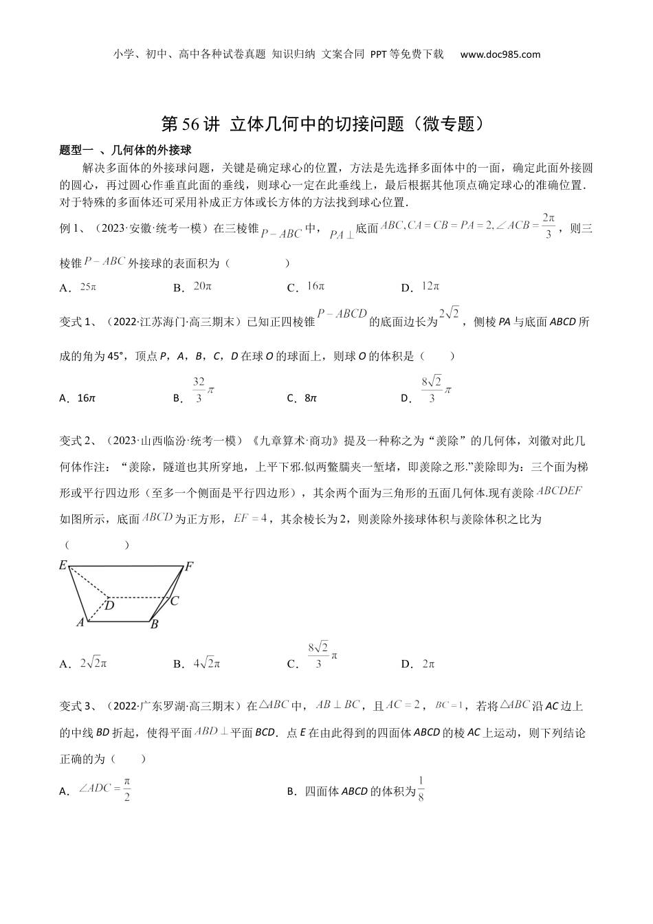 小学、初中、高中各种试卷真题知识归纳文案合同PPT等免费下载www.doc985.com第56讲立体几何中的切接问题(微专题)题型一、几何体的外接球解决多面体的外接球问题,关键是确定球心的位置,方法是先选择多面体中的一面,确定此面外接圆的圆心,再过圆心作垂直此面的垂线,则球心一定在此垂线上,最后根据其他顶点确定球心的准确位置.对于特殊的多面体还可采用补成正方体或长方体的方法找到球心位置.例1、(2023·安徽·统考一模)在三棱锥中,底面,则三棱锥外接球的表面积为()A.B.C.D.变式1、(2022·江苏海门·高三期末)已知正四棱锥的底面边长为,侧棱PA与底面ABCD所成的角为45°,顶点P,A,B,C,D在球O的球面上,则球O的体积是()A.16πB.C.8πD.变式2、(2023·山西临汾·统考一模)《九章算术·商功》提及一种称之为“羡除”的几何体,刘徽对此几何体作注:“羡除,隧道也其所穿地,上平下邪.似两鳖臑夹一堑堵,即羡除之形.”羡除即为:三个面为梯形或平行四边形(至多一个侧面是平行四边形),其余两个面为三角形的五面几何体.现有羡除如图所示,底面为正方形,,其余棱长为2,则羡除外接球体积与羡除体积之比为()A.B.C.D.变式3、(2022·广东罗湖·高三期末)在中,,且,,若将沿AC边上的中线BD折起,使得平面平面BCD.点E在由此得到的四面体ABCD的棱AC上运动,则下列结论正确的为()A.B.四面体ABCD的体积为小学、初中、高中各种试卷真题知识归纳文案合同PPT等免费下载www.doc985.comC.存在点E使得的面积为D.四面体ABCD的外接球表面积为变式4、(2022·河北张家口·高三期末)在《九章算术》中,将四个面都为直角三角形的四面体称之为鳖臑(biēnào).如图,三棱锥为一个鳖臑,其中平面,,,,为垂足,则()A.平面B.为三棱锥的外接球的直径C.三棱锥的外接球体积为D.三棱锥的外接球体积与三棱锥的外接球体积相等变式5、(2022·江苏如皋·高三期末)已知三棱锥D-ABC中,AB=AC=AD=1,∠DAB=∠DAC=,∠BAC=,则点A到平面BCD的距离为_________,该三棱锥的外接球的体积为_________.变式6、(2022·广东潮州·高三期末)在《九章算术》中,将四个面都是直角三角形的四面体称为鳖臑,在鳖臑A-BCD中,AB平面BCD,CDAD,AB=BD=,已知动点E从C点出发,沿外表面经过棱AD上一点到点B的最短距离为,则该棱锥的外接球的表面积为_________.小学、初中、高中各种试卷真题知识归纳文案合同PPT等免费下载www.doc985.com变式7、(2022·广东·铁一中学高三期末)已知四面体中,,,,则其外接球的体积为______.变式8、(2022·河北保定·高三期末)如图,是边长为4的等边三角形的中位线,将沿折起,使得点与重合,平面平面,则四棱雉外接球的表面积是___________.题型二、几何体的内切球求解多面体的内切球的问题,一般是将多面体分割为以球心为顶点,多面体的各面为底面的棱锥,利用多面体的体积等于各棱锥的体积之和求内切球的半径.例2、(2021·山东高三其他模拟)如图所示的由4个直角三角形组成的各边长均为1的六边形是某棱锥的侧面展开图,则该棱锥的内切球半径为_________.变式1、【2022·广东省珠海市第二中学10月月考】已知三棱锥的所有棱长都相等,现沿三条侧棱剪开,将其表面展开成一个平面图形,若这个平面图形外接圆的半径为,则三棱锥的内切球的体积为_______小学、初中、高中各种试卷真题知识归纳文案合同PPT等免费下载www.doc985.com变式2、【2022·广东省珠海市第二中学10月月考】已知三棱锥的所有棱长都相等,现沿三条侧棱剪开,将其表面展开成一个平面图形,若这个平面图形外接圆的半径为,则三棱锥的内切球的体积为_______变式3、(2023·江苏连云港·统考模拟预测)已知圆锥内切球(与圆锥侧面、底面均相切的球)的半径为2,当该圆锥的表面积最小时,其外接球的表面积为()A.B.C.D.变式4、(2022·湖北武昌·高三期末)已知四面体ABCD的一个平面展开图如图所示,其中四边形AEFD是边长为的菱形,B,C分别为AE,FD的中点,,则在该四面体中()A.B.BE与平面DCE所成角的余弦值为C.四面体ABCD的内切球半径为D.四面体AB...