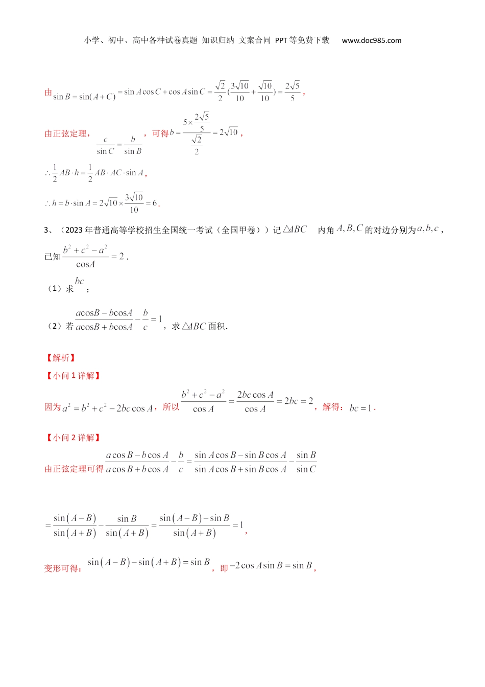 小学、初中、高中各种试卷真题知识归纳文案合同PPT等免费下载www.doc985.com第31讲正弦定理、余弦定理1、正弦定理===2R(R为△ABC外接的半圆径).正弦定理的常见变形(1)a=2RsinA,b=2RsinB,c=2RsinC;(2)sinA=,sinB=,sinC=;(3)a∶b∶c=sinA∶sinB∶sinC;(4)=.2、余弦定理a2=b2+c2-2bccosA;b2=c2+a2-2cacosB;c2=a2+b2-2abcosC.余弦定理的常见变形(1)cosA=;(2)cosB=;(3)cosC=.3、三角形的面积公式(1)S△ABC=aha(ha为边a上的高);(2)S△ABC=absinC=bcsinA=acsinB;(3)S=r(a+b+c)(r三角形的切半为内圆径).1、(2023年普通高等学校招生全国统一考试(全国乙卷))在中,内角的对边分别是,若,且,则()小学、初中、高中各种试卷真题知识归纳文案合同PPT等免费下载www.doc985.comA.B.C.D.【答案】C【解析】由题意结合正弦定理可得,即,整理可得,由于,故,据此可得,则.故选:C.2、(2023年高考数学新高考I卷).已知在中,.(1)求;(2)设,求边上的高.【解析】(1),,即,又,,,,即,所以,.(2)由(1)知,,小学、初中、高中各种试卷真题知识归纳文案合同PPT等免费下载www.doc985.com由,由正弦定理,,可得,,.3、(2023年普通高等学校招生全国统一考试(全国甲卷))记的内角的对边分别为,已知.(1)求;(2)若,求面积.【解析】【小问1详解】因为,所以,解得:.【小问2详解】由正弦定理可得,变形可得:,即,小学、初中、高中各种试卷真题知识归纳文案合同PPT等免费下载www.doc985.com而,所以,又,所以,故的面积为1、在△ABC中,若AB=,BC=3,C=120°,则AC等于()A.1B.2C.3D.4【答案】:A【解析】设在△ABC中,角A,B,C的对边分别为a,b,c,则a=3,c=,C=120°,由余弦定理得13=9+b2+3b,解得b=1或b=-4(舍去),即AC=1.2、已知△ABC,a=,b=,A=30°,则c等于()A.2B.C.2或D.均不正确【答案】:C【解析】 =,∴sinB==·sin30°=. b>a,∴B=60°或120°.若B=60°,则C=90°,∴c==2.若B=120°,则C=30°,∴a=c=.3、在△ABC中,A=60°,AB=2,且△ABC的面积为,则BC的长为()A.B.C.2D.2【答案】:B【解析】因为S=AB·ACsinA=×2×AC=,所以AC=1,所以BC2=AB2+AC2-2AB·ACcosA=3.所以BC=.4、(2022年湖北省宜昌市高三模拟试卷)若在中,角的对边分别为,则()A.或B.C.D.以上都不对【答案】C小学、初中、高中各种试卷真题知识归纳文案合同PPT等免费下载www.doc985.com【解析】在中,已知,由正弦定理得:,所以,因为,所以,所以,故选:C考向一运用正余弦定理解三角形例1、(2021·全国高三专题练习(理))在ABC中,角A,B,C所对的边分别为a,b,c.已知cosaC,cosbB,coscA成等差数列.(1)求角B的大小;(2)若4cos5A,求sinC的值.【解析】(1)cos,aC,cosbB,coscA成等差数列,2coscoscosbBaCcA,由正弦定理,2sincossincossincossin()BBACCAAC,ABC中,ABC,sin()sin()sinACBB,2sincossinBBB,小学、初中、高中各种试卷真题知识归纳文案合同PPT等免费下载www.doc985.com又(0,)B,sin0B,1cos2B,3B.(2)(0,)A,sin0A,23sin1cos5AA,sinsin()sincossincosCABABBA3143343525210.变式1、(2022年河北省张家口高三模拟试卷)在中,内角所对的边分别为,根据下列条件解三角形,其中有两解的是()A.B.C.D.【答案】BC【解析】对于A,因为,所以,所以只有一解;故A错误;对于B,因为,所以由正弦定理得,因为,即,所以,所以有两解(,或),故B正确;小学、初中、高中各种试卷真题知识归纳文案合同PPT等免费下载www.doc985.com对于C,因为,所以由正弦定理得,即,因为,所以有两解(,或,),故C正确;对于D,因为,所以由正弦定理得,由于,故,所以只有一解,故D错误;故选:BC变式2、(2022年福建省南安国光中学高三模拟试卷)记的内角的对边分别为,.(1)证明:;(2)若,求.【解析】【小问1详解】由题意知,,所以,所以,而,小学...