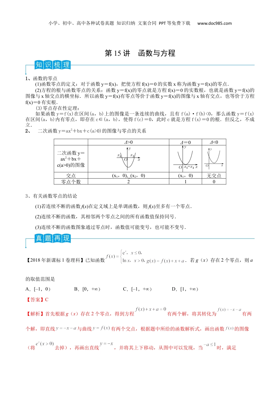 小学、初中、高中各种试卷真题知识归纳文案合同PPT等免费下载www.doc985.com第15讲函数与方程1、函数的零点(1)函数零点的定义:对于函数y=f(x),把使方程f(x)=0的实数x称为函数y=f(x)的零点.(2)方程的根与函数零点的关系:函数y=f(x)的零点就是方程f(x)=0的实数根,也就是函数y=f(x)的图像与x轴交点的横坐标.所以函数y=f(x)有零点等价于函数y=f(x)的图像与x轴有交点,也等价于方程f(x)=0有实根.(3)零点存在性定理:如果函数y=f(x)在区间(a,b)上的图像是一条连续的曲线,且有f(a)·f(b)<0,那么函数y=f(x)在区间(a,b)内有零点,即存在c∈(a,b),使得f(c)=0,此时c就是方程f(x)=0的根.但反之,不成立.2、二次函数y=ax2+bx+c(a>0)的图像与零点的关系Δ>0Δ=0Δ<0二次函数y=ax2+bx+c(a>0)的图像交点(x1,0),_(x2,0)(x1,0)无交点零点个数2103、有关函数零点的结论(1)若连续不断的函数f(x)在定义域上是单调函数,则f(x)至多有一个零点.(2)连续不断的函数,其相邻两个零点之间的所有函数值保持同号.(3)连续不断的函数图象通过零点时,函数值可能变号,也可能不变号.【2018年新课标1卷理科】已知函数.若g(x)存在2个零点,则a的取值范围是A.[–1,0)B.[0,+∞)C.[–1,+∞)D.[1,+∞)【答案】C【解析】首先根据g(x)存在2个零点,得到方程有两个解,将其转化为有两个解,即直线与曲线有两个交点,根据题中所给的函数解析式,画出函数的图像(将去掉),再画出直线,并将其上下移动,从图中可以发现,当时,满足小学、初中、高中各种试卷真题知识归纳文案合同PPT等免费下载www.doc985.com与曲线有两个交点,从而求得结果.详解:画出函数的图像,在y轴右侧的去掉,再画出直线,之后上下移动,可以发现当直线过点A时,直线与函数图像有两个交点,并且向下可以无限移动,都可以保证直线与函数的图像有两个交点,即方程有两个解,也就是函数有两个零点,此时满足,即,故选C.1、.已知函数f(x)=则函数f(x)的零点为()A.,0B.-2,0C.D.0【答案】D【解析】当x≤1,令时f(x)=2x-1=0,解得x=0;当x>1,令时f(x)=1+log2x=0,解得x=,又因为x>1,所以此方程无解时.上,函综数f(x)的零点只有0.2、函数f(x)=lnx-的零点所在的区间是()A.(1,2)B.(2,3)C.(3,4)D.(4,5)【答案】B【解析】小学、初中、高中各种试卷真题知识归纳文案合同PPT等免费下载www.doc985.com函数f(x)=lnx-在(1,+∞)上增,且在单调递(1,+∞)上连续.因为f(2)=ln2-2<0,f(3)=ln3-1>0,所以f(2)·f(3)<0,所以函的零点所在的是数区间(2,3).3、若函数f(x)=3ax+1-2a在区间(-1,1)内存在一个零点,则a的取值范围是()A.B.C.(-∞,-1)D.(-∞,-1)∪【答案】D【解析】当a=0时,f(x)=1与x轴无交点,不合题意,所以a≠0;函数f(x)=3ax+1-2a在区间(-1,1)内是单调函数,所以f(-1)·f(1)<0,即(5a-1)(a+1)>0,解得a<-1或a>.4、(2020届浙江省嘉兴市3月模拟)已知函数,,若存在实数使在上有2个零点,则的取值范围为________.【答案】.【解析】已知实数使在上有2个零点,等价于与的函数图象在上有2个交点,显然与x轴的交点为,的图象关于对称,当时,若要有2个交点,由数形结合知m一定小于e,即;小学、初中、高中各种试卷真题知识归纳文案合同PPT等免费下载www.doc985.com当时,若要有2个交点,须存在a使得在有两解,所以,因为,即,显然存在这样的a使上述不等式成立;由数形结合知m须大于在处的切线与x轴交点的横坐标,即综上所述,m的范围为.考向一判断零点所在的区间例1、(多选)(1)函数f(x)=ex-x-2在下列哪个区间内必有零点()A.(-2,-1)B.(-1,0)C.(0,1)D.(1,2)【答案】AD【解析】f(-2)=>0,f(-1)=-1<0,f(0)=-1<0,f(1)=e-3<0,f(2)=e2-4>0,因为f(-2)·f(-1)<0,f(1)·f(2)<0,所以f(x)在(-2,-1)和(1,2)存在零点内.(2).函数f(x)=2x--a的一个零点在区间(1,2)内,则实数a的取值范围是()A.(1,3)B.(1,2)C.(0,3)D.(0,2)【答案】C小学、初中、高中各种试卷真题知识归纳文案合同PPT等免费下载www.doc985.co...