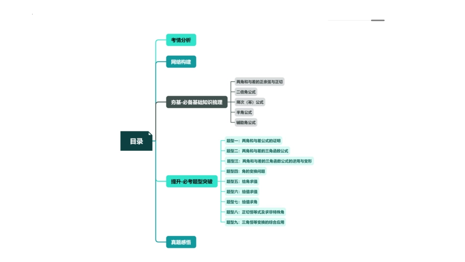 第02讲三角恒等变换导师:稻壳儿高考一轮复习讲练测202401020304目录CONTENTS考情分析网络构建知识梳理题型归纳真题感悟01PARTONE考情分析稿定PPT稿定PPT,海量素材持续更新,上千款模板有选择总一款适合你02考点要求考题统计考情分析(1)会推导两角差的余弦公式(2)会用两角差的余弦公式推导出两角差的正弦、正切公式(3)掌握两角和与差的正弦、余弦、正切公式,并会简单应用(4)能运用两角和与差的正弦、余弦、正切公式推导二倍角的正弦、余弦、正切公式,并进行简单的恒等变换2023年II卷第7题,5分2023年I卷II卷第8题,5分2022年II卷第6题,5分2021年甲卷(文)第11题,5分三角恒等变换位于三角函数与数学变换的结合点上,高考会侧重综合推理能力和运算能力的考查,体现三角恒等变换的工具性作用,以及会有一些它们在数学中的应用.这就需要同学熟练运用公式,进一步提高运用联系转化的观点去处理问题的自觉性,体会一般与特殊的思想、换元的思想、方程的思想等数学思想在三角恒等变换中的作用.02PARTONE网络构建03PARTONE知识梳理题型归纳1.角和差的余弦、正弦、正切公式两与(1)公式C(α-β):cos(α-β)=;(2)公式C(α+β):cos(α+β)=;(3)公式S(α-β):sin(α-β)=;(4)公式S(α+β):sin(α+β)=;cosαcosβ+sinαsinβcosαcosβ-sinαsinβsinαcosβ-cosαsinβsinαcosβ+cosαsinβ(5)公式T(α-β):tan(α-β)=;(6)公式T(α+β):tan(α+β)=.tanα-tanβ1+tanαtanβtanα+tanβ1-tanαtanβ2.助角公式辅asinα+bcosα=,其中sinφ=,cosφ=a2+b2sin(α+φ)ba2+b2aa2+b2.3.二倍角的正弦、余弦、正切公式(1)公式S2α:sin2α=.(2)公式C2α:cos2α===.(3)公式T2α:tan2α=.4.常用的部分三角公式(1)1-cosα=,1+cosα=.(升公式幂)(2)1±sinα=.(升公式幂)2sinαcosαcos2α-sin2α2cos2α-11-2sin2α2tanα1-tan2α2sin2α22cos2α21-cos2α1+cos2α1-cos2α21+cos2α2sinα2±cosα22常用结论角和差的公式的常用形:两与变(1)sinαsinβ+cos(α+β)=cosαcosβ.(2)cosαsinβ+sin(α-β)=sinαcosβ.(3)tanα±tanβ=tan(α±β)(1∓tanαtanβ).tanαtanβ=1-tanα+tanβtanα+β=tanα-tanβtanα-β-1.题型一:两角和与差公式的证明题型一:两角和与差公式的证明题型二:两角和与差的三角函数公式题型二:两角和与差的三角函数公式题型二:两角和与差的三角函数公式题型三:两角和与差的三角函数公式的逆用与变形题型三:两角和与差的三角函数公式的逆用与变形题型三:两角和与差的三角函数公式的逆用与变形题型四:角的变换问题题型四:角的变换问题题型四:角的变换问题题型五:给角求值题型五:给角求值题型五:给角求值题型六:给值求值题型六:给值求值题型六:给值求值题型七:给值求角题型七:给值求角题型七:给值求角题型八:正切恒等式及求非特殊角题型八:正切恒等式及求非特殊角题型八:正切恒等式及求非特殊角题型八:正切恒等式及求非特殊角题型九:三角恒等变换的综合应用题型九:三角恒等变换的综合应用04PARTONE真题感悟DBC感看谢观THANKYOU