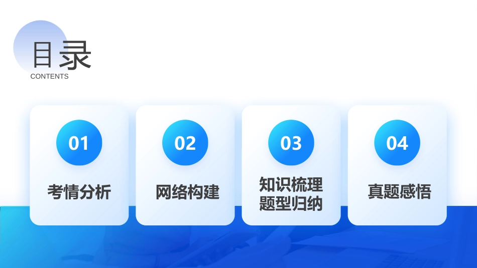 第06讲事件的相互独立性、条件概率与全概率公式高考一轮复习讲练测202401020304目录CONTENTS考情分析网络构建知识梳理题型归纳真题感悟01PARTONE考情分析稿定PPT稿定PPT,海量素材持续更新,上千款模板有选择总一款适合你02考点要求考题统计考情分析(1)了解两个事件相互独立的含义.(2)理解随机事件的独立性和条件概率的关系,会利用全概率公式计算概率.2023年甲卷(理)第6题,5分2022年乙卷(理)第10题,5分2022年I卷第20题,12分本节内容是概率的基础知识,考查形式可以是选择填空题,也可以在解答题中出现.出题多会集中在随机事件的关系以对应的概率求解.全概率公式将会是一个新的出题点,思维难度会略大.但整体而言,本节内容在高考中的难度处于中等偏易.02PARTONE网络构建03PARTONE知识梳理题型归纳1.相互立事件独(1)念:任意事件概对两个A与B,如果P(AB)=_________成立,则称事件A事件与B相互立,立独简称为独.(2)性:若事件质A与B相互立,那独么A与___,也都相互立独.2.件率条概(1)念:一般地,概设A,B机事件,且为两个随P(A)>0,我们称P(B|A)=在事件为A生的件下事件发条B生的件率件发条概简称条概P(A)P(B)A与,A与BBPABPAB(2)公式两个①利用古典型:概P(B|A)=______;②率的乘法公式:概P(AB)=__________.3.全率公式概一般地,设A1,A2,…,An是一互斥的事件,组两两A1∪A2∪…∪An=Ω,且P(Ai)>0,i=1,2,…,n,任意的事件则对B⊆Ω,有P(B)=nABnAP(A)P(B|A)i=1nP(Ai)P(B|Ai)常用结论1.事件互斥是指事件不可能同生,事件相互立两两个时发两独是指一事件生否另一事件生的率有影,事个发与对发概没响两件相互立不一定互斥独.2.P(B|A)是在事件A生的件下事件发条B生的率,发概P(A|B)是在事件B生的件下事件发条A生的率发概.3.算件率计条概P(B|A),不能便用事件时随B的率概P(B)代替P(AB).题型一:条件概率【对点训练1】(2023·广西柳州·统考模拟预测)根据历年的气象数据,某市5月份发生中度雾霾的概率为0.25,刮四级以上大风的概率为0.4,既发生中度雾霾又刮四级以上大风的概率为0.2,则在刮四级以上大风的情况下,发生中度雾霾的概率为()A.0.5B.0.625C.0.8D.0.9题型一:条件概率题型二:相互独立事件的判断题型二:相互独立事件的判断题型三:相互独立事件概率的计算【对点训练3】(2023·全国·高三专题练习)某次知识竞赛规则如下:在主办方预设的5个问题中,选手若能连续正确回答出两个问题,即停止答题,晋级下一轮假设某选手正确回答每个问题的概率都是0.8,且每个问题的回答结果相互独立,则该选手恰好回答了5个问题就晋级下一轮的概率为.题型三:相互独立事件概率的计算题型三:相互独立事件概率的计算题型四:相互独立事件概率的综合应用题型四:相互独立事件概率的综合应用【例5】(2023·江苏南京·高三统考开学考试)某批麦种中,一等麦种占90%,二等麦种占10%,一、二等麦种种植后所结麦穗含有50粒以上麦粒的概率分别为0.6,0.2,则这批麦种种植后所结麦穗含有50粒以上麦粒的概率为.题型五:全概率公式及其应用【对点训练6】(2023·湖南长沙·高三周南中学校考阶段练习)某篮球队教练对近两年队员甲参加过的100场比赛进行统计:甲在前锋位置出场20次,其中球队获胜14次;中锋位置出场30次,其中球队获胜21次;后卫位置出场50次,其中球队获胜40次.用该样本的频率估计概率,则甲参加比赛时,该该球队某场比赛获胜的概率为.题型五:全概率公式及其应用题型六:贝叶斯公式及其应用题型六:贝叶斯公式及其应用题型七:全概率公式与贝叶斯公式的综合应用题型七:全概率公式与贝叶斯公式的综合应用04PARTONE真题感悟ADA感看谢观THANKYOU